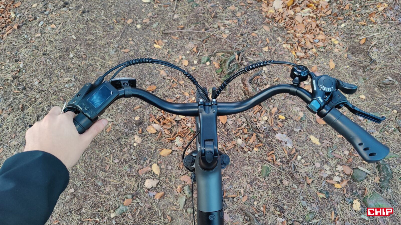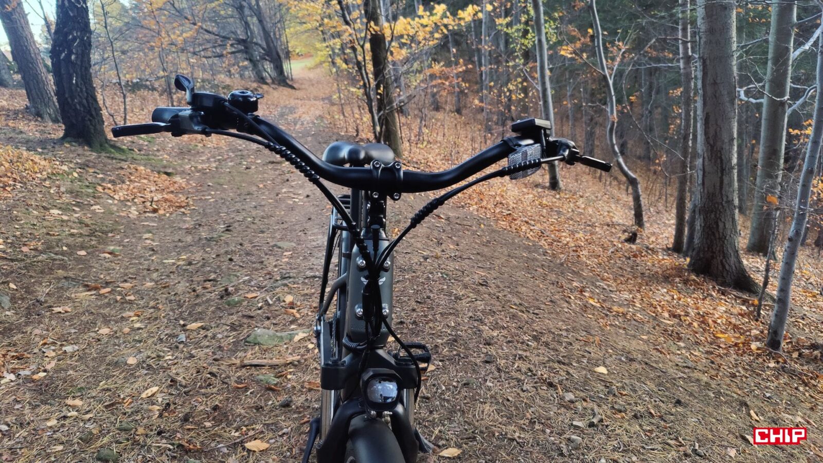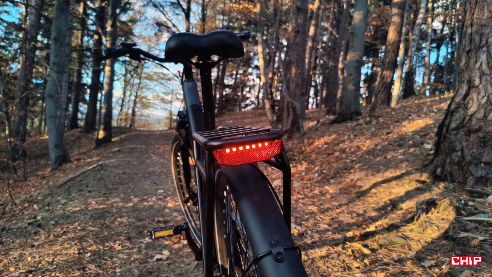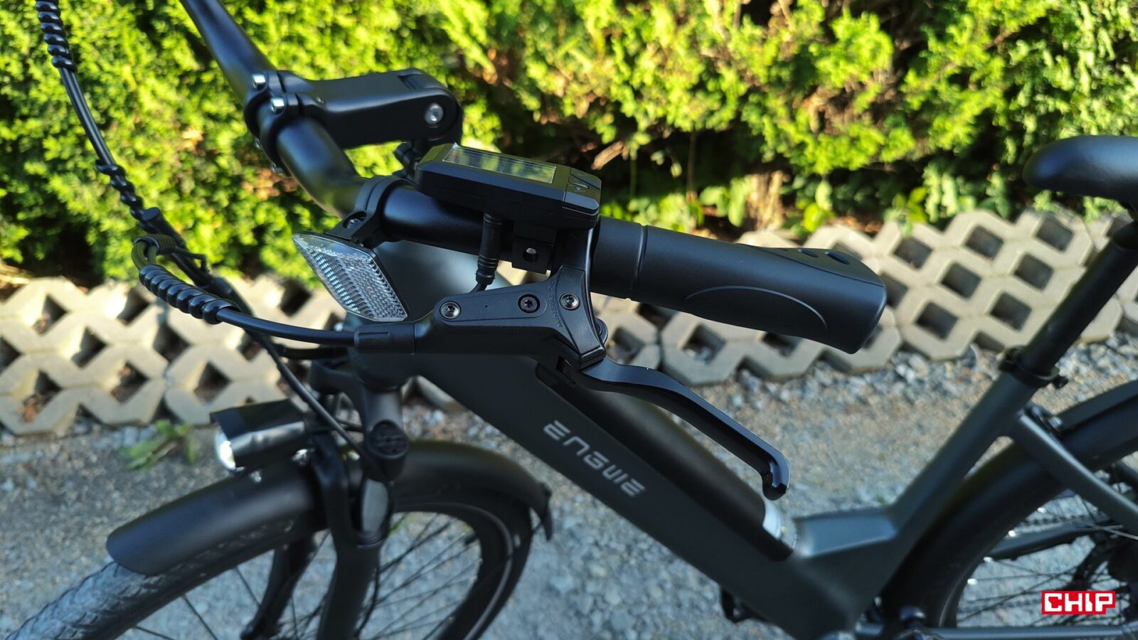 Cały rower jest fabrycznie wyposażony jak solidne miejskie narzędzie do podróży – zarówno tych małych, jak i dużych – nieważne, czy w deszczu czy po zmroku. Dostajemy bowiem kompletne oświetlenie na przód i tył, pełne błotniki, osłonę łańcucha, stopkę oraz deklarowaną odporność IP54 na wodę i brud. Dochodzi do tego kolorowy wyświetlacz LCD na kierownicy, po którym poruszamy się za sprawą trzech przycisków. Podglądamy na nim przejechany dystans, poziom wspomagania i stan akumulatora, a do tego pełni on rolę prostego komputera pokładowego, w którym można np. zmodyfikować maksymalną prędkość wspomagania.