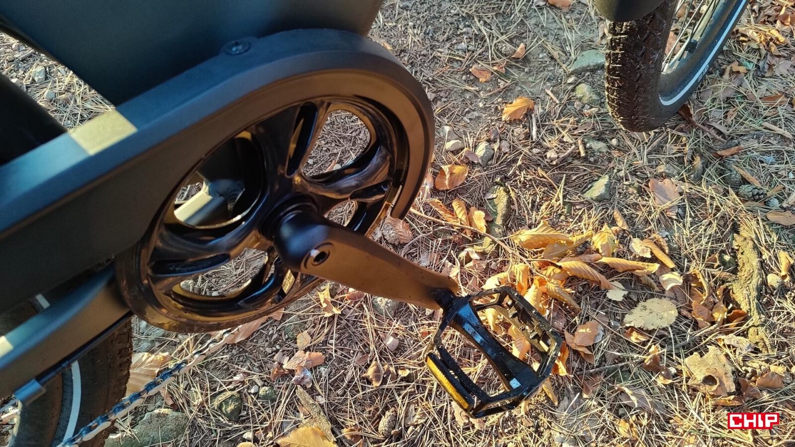Jeśli już o mojej wadze mowa, od razu warto docenić obecność solidnych hamulców, na których po prostu nie można się zawieść, a to wcale nie jest taka norma. Hydrauliczne zaciski i tarcze 160 mm z przodu i z tyłu zapewniają dużą kontrolę i radzą sobie z nagłymi zahamowaniami. Tego typu układ pozwala znacznie lepiej dozować siłę hamowania i utrzymać kontrolę także na mokrej nawierzchni, a przypomnę tylko, że sama konstrukcja roweru jest opisana jako odporna na zachlapania klasy IP54, więc producent jednoznacznie komunikuje możliwość bezproblemowej jazdy w deszczu. Dzięki pełnym błotnikom zapomnicie zresztą o brudnych plecach czy plecaku właśnie w deszczowe dni, a jako że cały napęd jest osłonięty, to oznacza to mniejsze ryzyko ubrudzenia spodni smarem łańcuchowym.