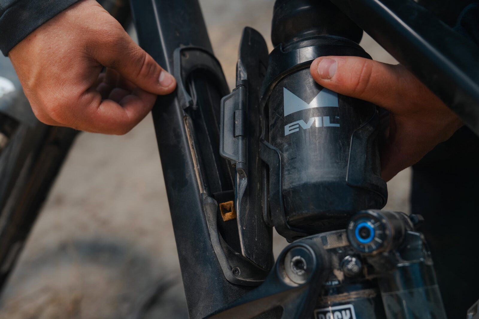 Zacznijmy od samych podstaw nowego roweru Offering, którego rama została całkowicie przeprojektowana zgodnie z nowoczesnymi standardami, a w tym wewnętrznym prowadzeniem kabli (Cable Guy). Na jej materiał producent wybrał włókno węglowe, ale znacznie więcej emocji budzi fakt, że wewnątrz niej znalazł się schowek nazwany “Lunch Box Storage”. Powstał on naturalnie po to, aby zmieścić podstawowe narzędzia i zestaw naprawczy w wodoodpornej torbie, ale nic nie stoi na przeszkodzie, żeby wypchać go jedzeniem. Kebaba wprawdzie tam nie wrzucimy, ale kilka cukierków czy batoników już tak. Evil Bikes zadbało też o trwałość ramy, sięgając po system ochrony Rock Stop, który zabezpiecza newralgiczne elementy przed kamieniami i błotem.