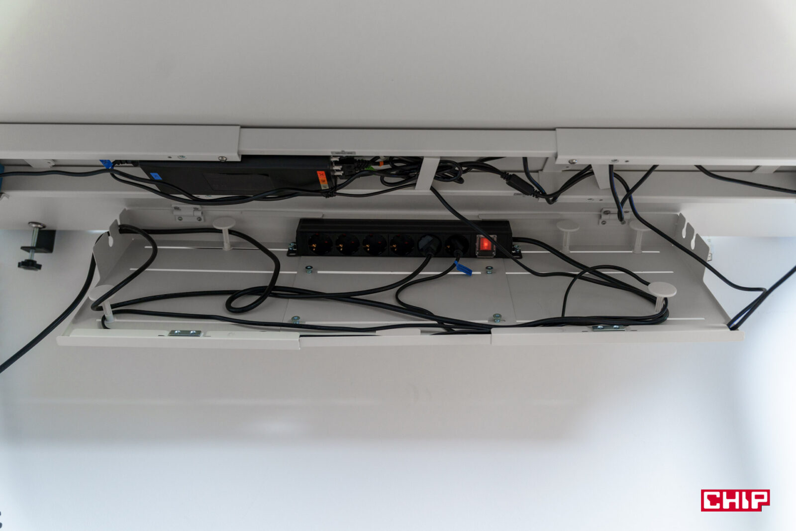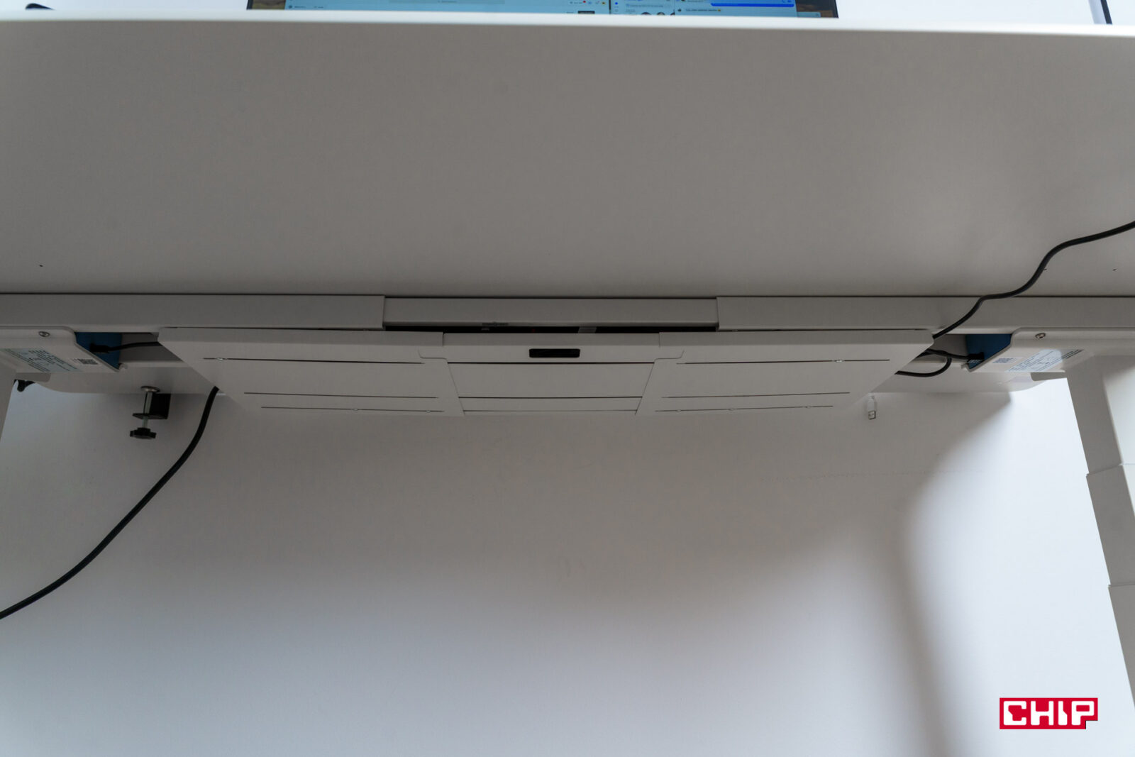 Pod blatem FlexiSpot E7 Flow znajduje się zamykany schowek na listwę zasilającą. Taką, 6-gniazdową, jak wspominałem mamy w zestawie i możemy ją w tym miejscu wygodnie przykręcić. Zamknięcie składa się z prostych zawiasów i utrzymuje się za pomocą odpowiednio silnych magnesów. W środku, poza listwą, możemy też wkręcić przesuwane szpule(?), wokół których możemy zawiązać zbyt długie przewody.