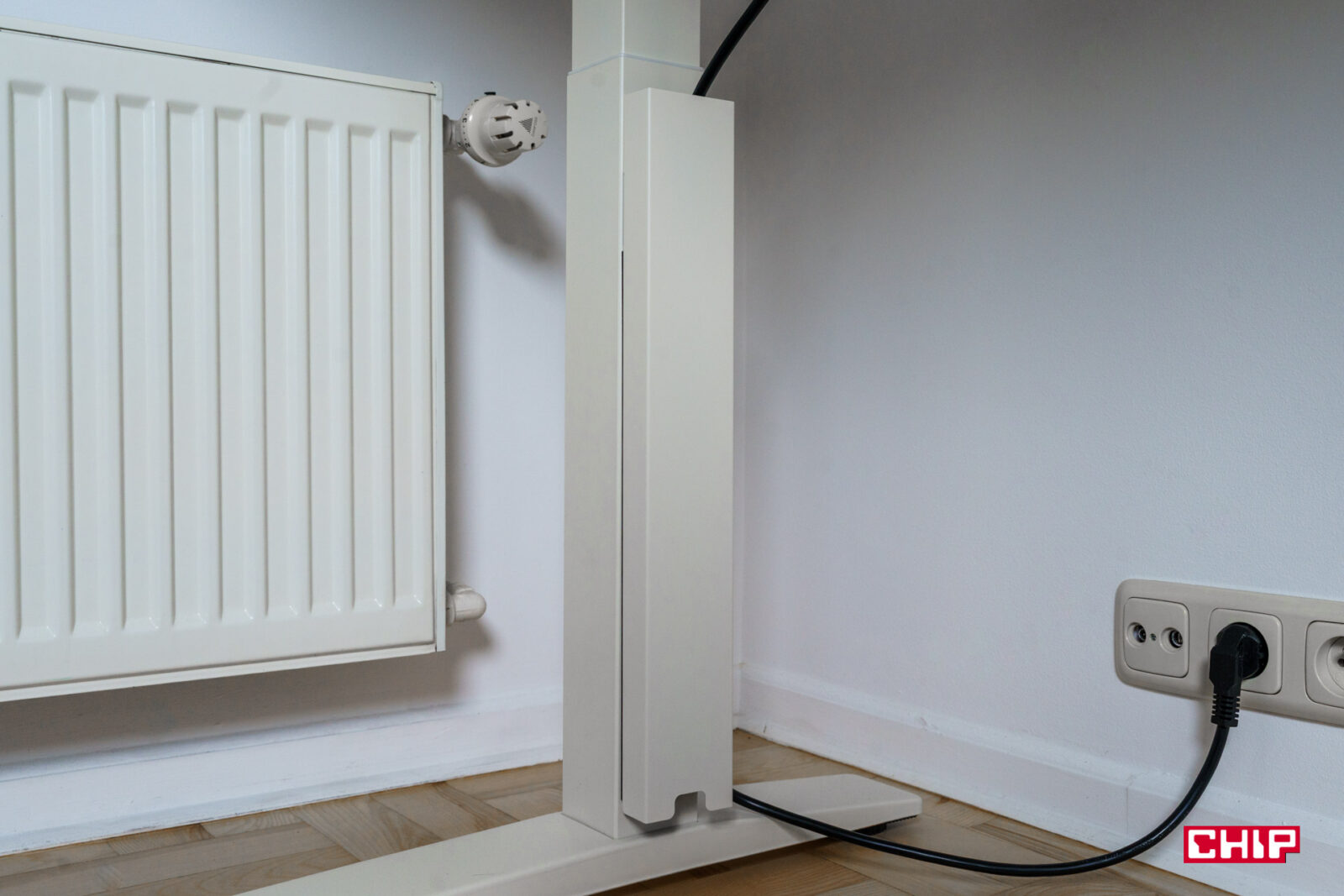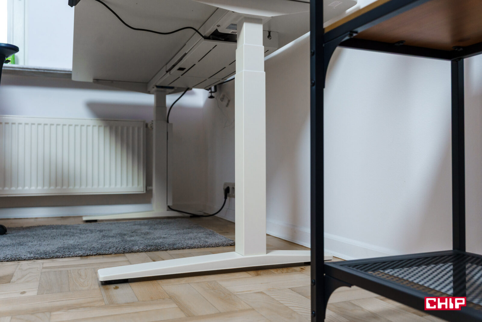 Złożenie podstawy i blatu zajęło nam dosłownie 15 minut. To efekt prostej konstrukcji. Nogi to trzy elementy – belka pionowa, pozioma i plastikowe nóżki. Do nich przykręcamy silniki i całość łączymy regulowaną belką, która znajduje się pod blatem. Na to blat i gotowe. Da się to zrobić samodzielnie, ale biurko jest dosyć ciężkie (ok 60 kg), więc obracanie go nie jest proste.
