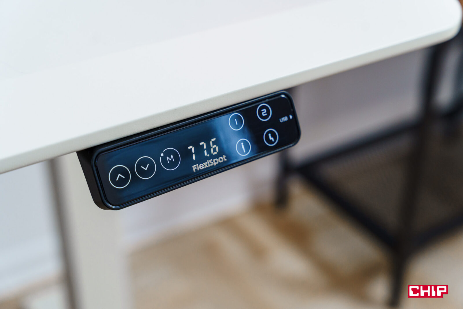 E7 Flow to również najszybsze biurko serii E7. Producent deklaruje unoszenie blatu z prędkością 50 mm na sekundę i to faktycznie ma pokrycie w rzeczywistości. Sam panel sterowania możemy umieścić z lewej lub prawej strony blatu, mamy dedykowane otwory na śruby z obu stron. Możemy w nim zapisać gotowe ustawienia do szybkiej zmiany wysokości jednym przyciskiem.