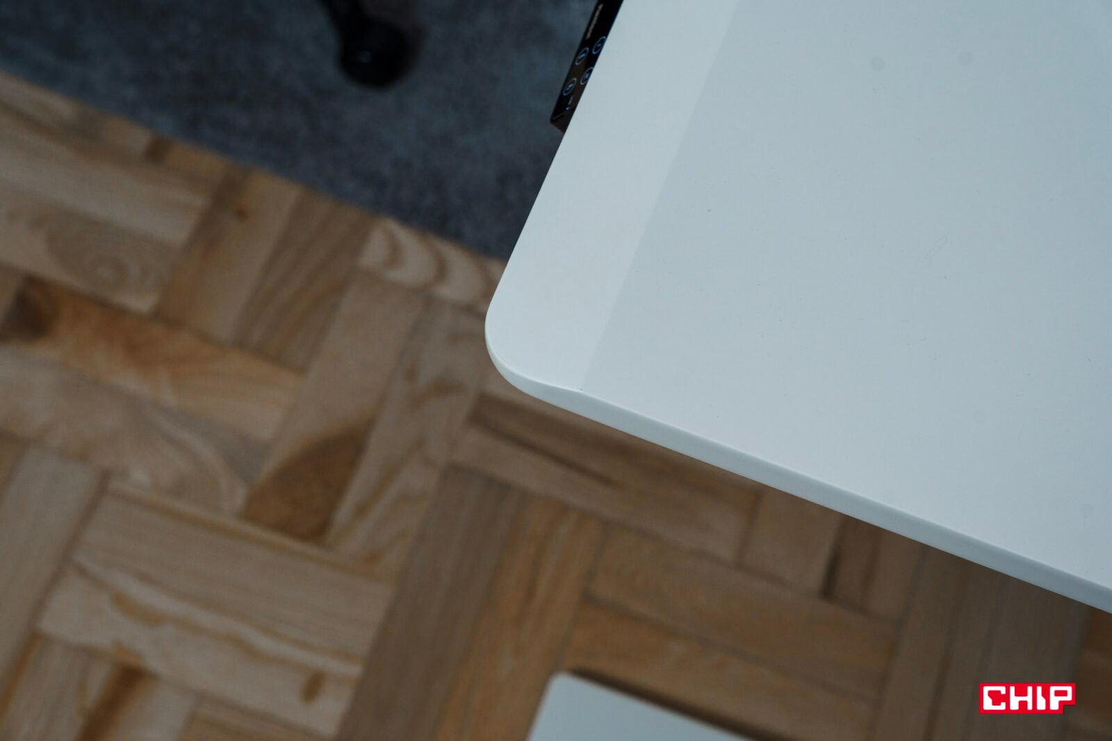 Prawdopodobnie ze względu na kształt blatu, FlexiSpot E7 Flow jest dostępny tylko w dwóch wariantach, bez możliwości wyboru materiału, z którego jest wykonany blat. Producent nie informuje, jaki jest to materiał, ale jest on twardy i bardzo sztywny. Unikatowość blatu polega na ścięciu przedniej krawędzi pod kątem. Jeśli zastanawiacie się, czy ma to sens to już śpieszę z wyjaśnieniem – i to jak! Nie spodziewałem się, że taka mała rzecz jest w stanie tak dużo zmienić. Podczas pracy mamy w tym miejscu przedramiona, tuż przed łokciami i to bardzo pozytywnie wpływa przede wszystkim na pisanie. Siedzi mi się o wiele wygodniej, a ręce mniej męczą się w trakcie pracy.