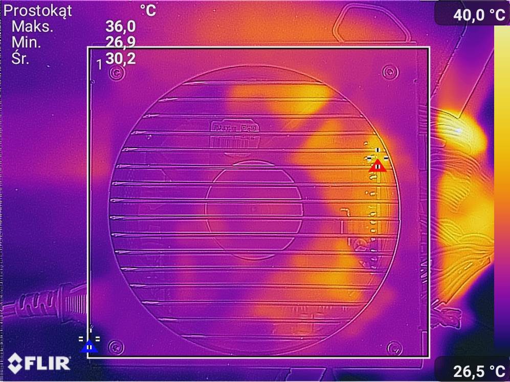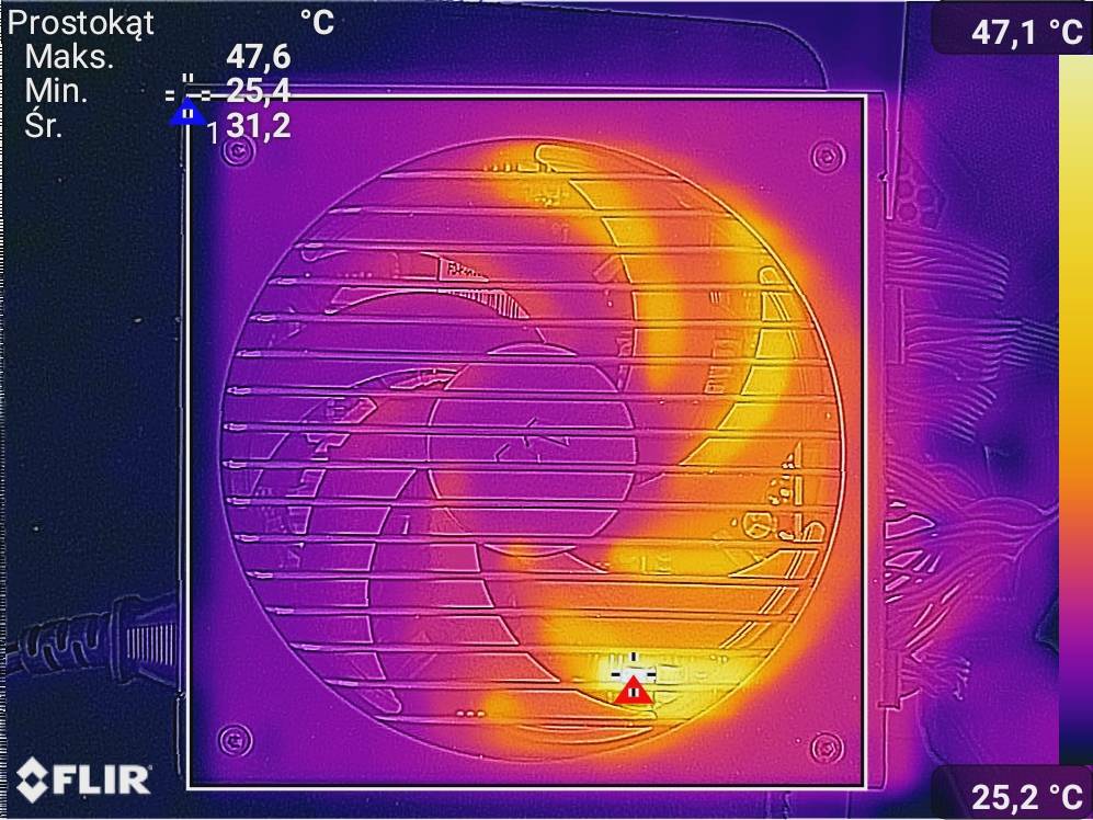 Spoczynkiem było wyświetlanie tylko pulpitu. Obciążenie to FurMark oraz Cinebench 2024. Zdjęcia termowizyjne wykonałem dzięki smartfonowi CAT S61. Testy wykonałem przy włączonym trybie półpasywnym.