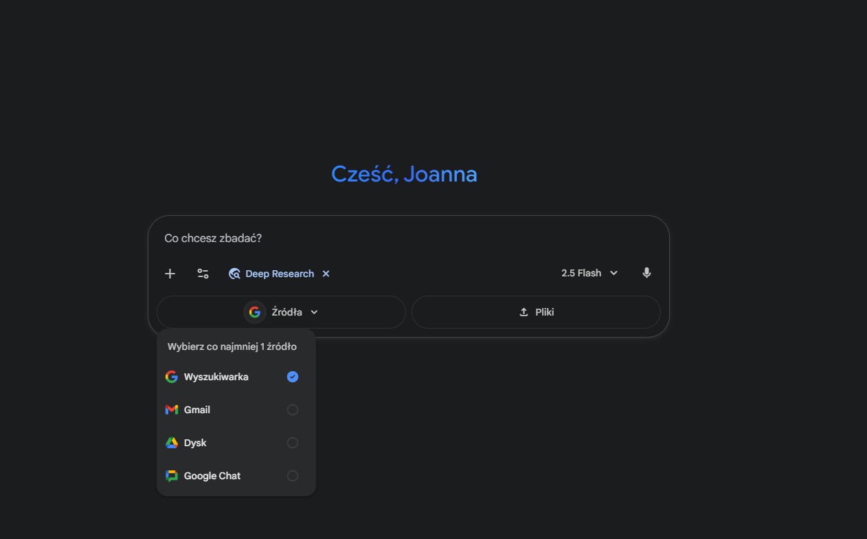 Dla osób, którym nie w smak takie grzebanie po prywatnych mailach, od razu uspokajamy – funkcja nie jest automatyczna. Należy ją samemu włączyć, przechodząc do menu Narzędzia w Gemini, gdzie następnie wybieramy Deep Research. W menu rozwijanym, które się pojawi, znajdziemy Źródła, gdzie obok standardowej opcji „Szukaj” (web), znajdziesz teraz pola wyboru: Gmail, Drive i Chat. Wystarczy zaznaczyć źródła, które chcesz, aby Gemini uwzględniło w danym zapytaniu.