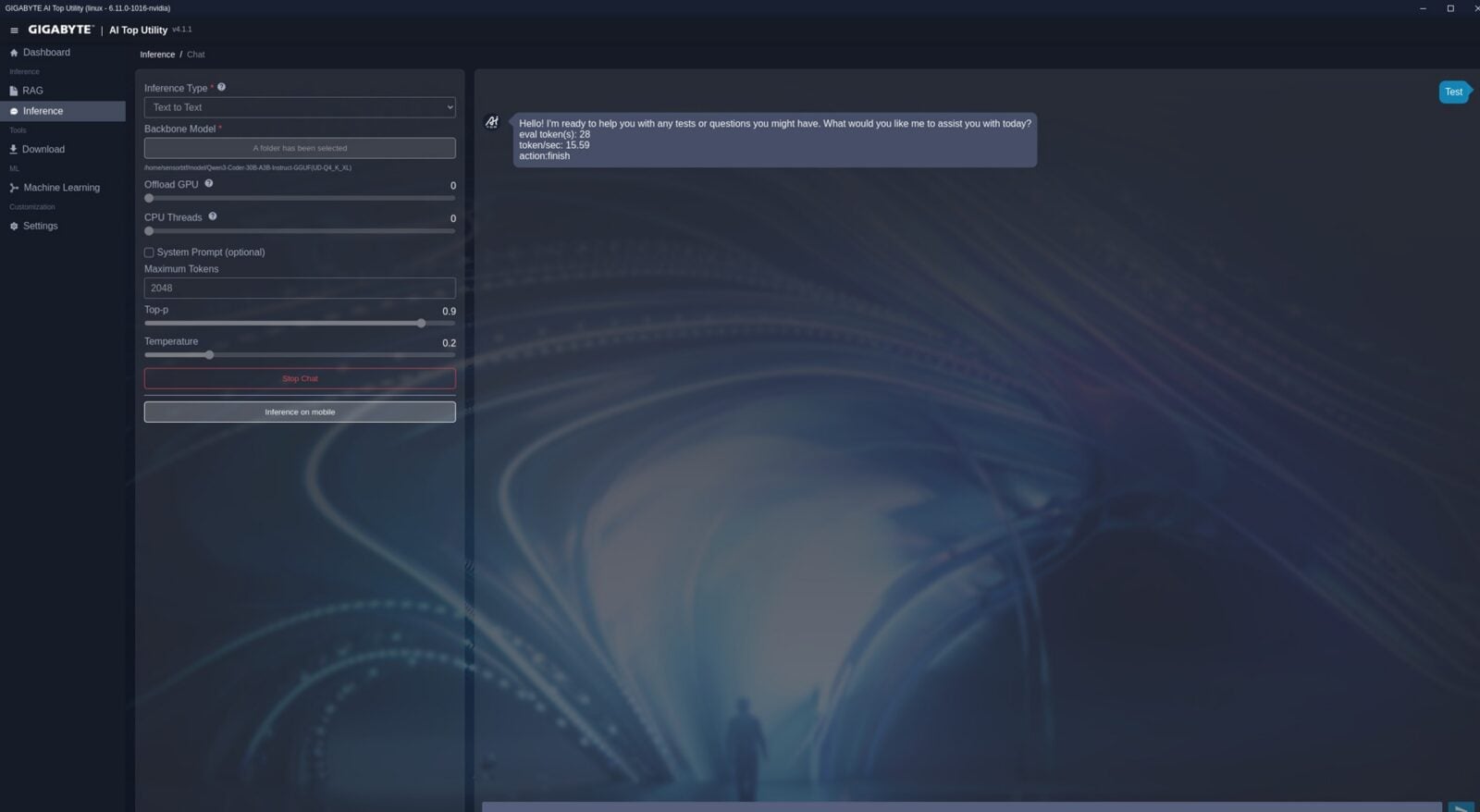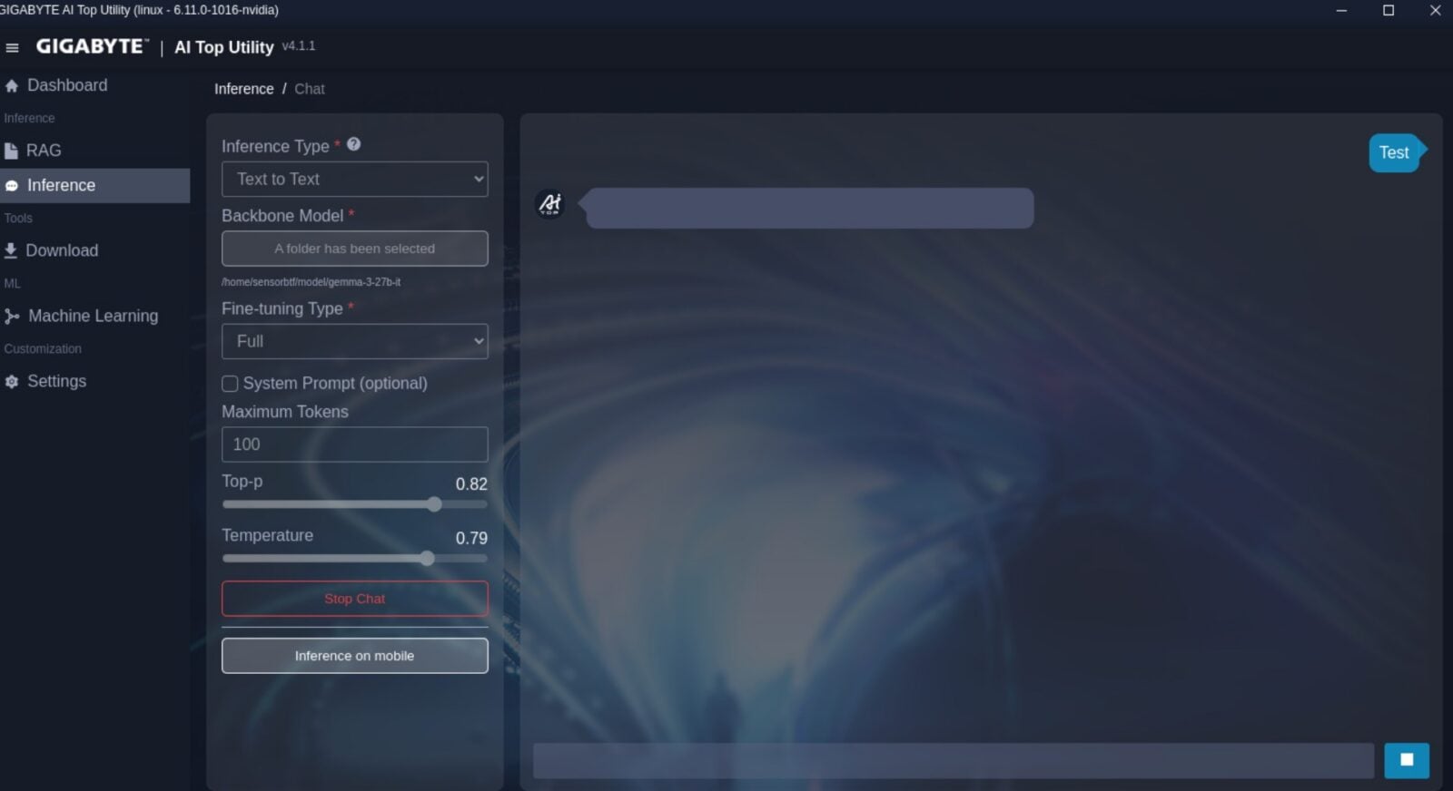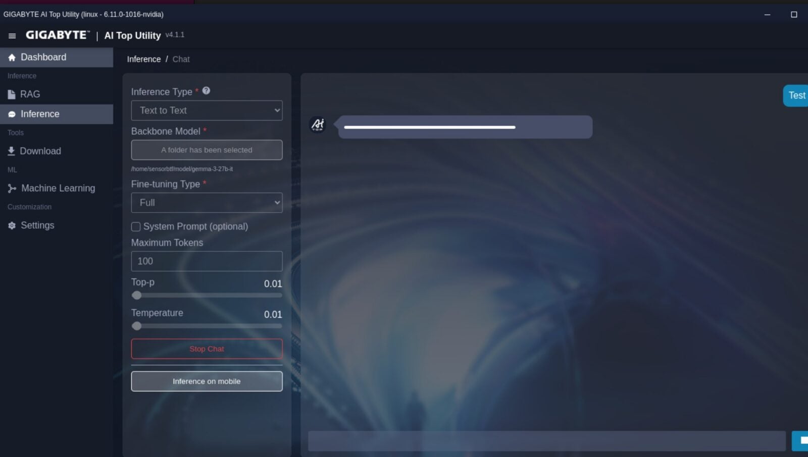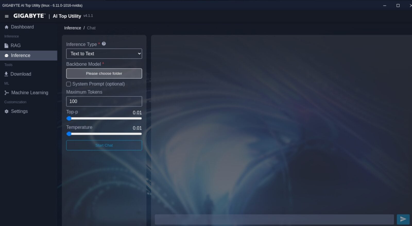 Celem aplikacji AI TOP Utility od Gigabyte jest zdemokratyzowanie dostępu do lokalnej sztucznej inteligencji poprzez trafienie do osób mniej technicznych, a to dzięki terminalowi graficznemu. Innymi słowy, koniec z terminalem, kopiowaniem komend i wgapianiem się w surowy tekst… choć musimy pamiętać, że NVIDIA zaprojektowała AI TOP ATOM bardziej jako sprzęt, którego kontrolujemy nie lokalnie (jak typowego peceta), a zdalnie przez terminal i wszelkiego rodzaju skrypty do np. automatycznego włączania modeli. Dlatego też z poziomu AI TOP Utility zrobicie tylko niewielki procent tego, co można dokonać z poziomu terminala. Więcej o tym możecie przeczytać na dedykowanej stronie NVIDII z konkretnymi poradnikami, których liczba rośnie i obejmuje już nawet kwantyzację do NVFP4.