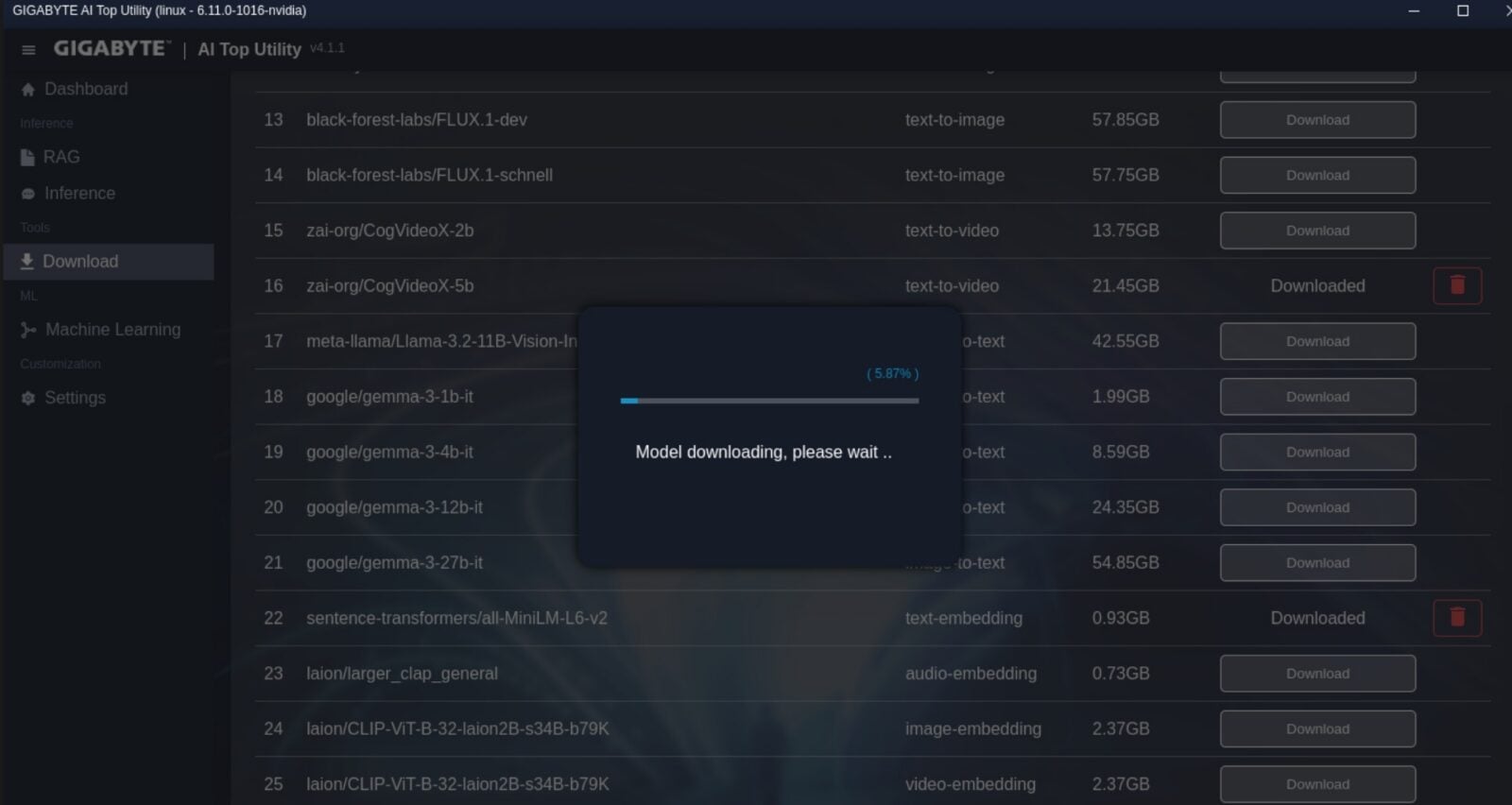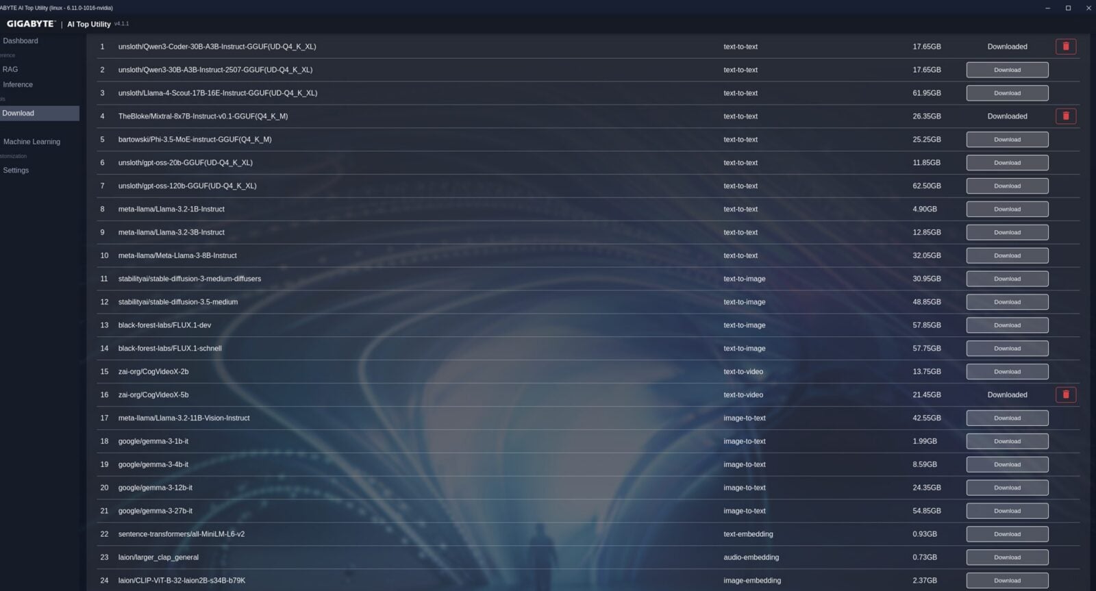 Zakładka ustawień pozwala tylko zmienić język (dostępny jest angielski i chiński), a ta dedykowana modelom do pobrania wspomina (na tę chwilę) jedynie o 25 różnych modelach i choć zapewnia prosty sposób ich pobrania i usunięcia, to okazjonalnie możecie odbić się od ściany, jeśli nie podacie specjalnego tokenu do Hugging Face. Firma Gigabyte nie oferuje bowiem wszystkich modeli z własnego serwera, a korzysta z ogólnodostępnych punktów dostępowych, z czego część wymaga właśnie prostej formy uwierzytelnienia. Z drugiej strony możecie też pobierać modele spoza listy i włączać je z poziomu tejże aplikacji.