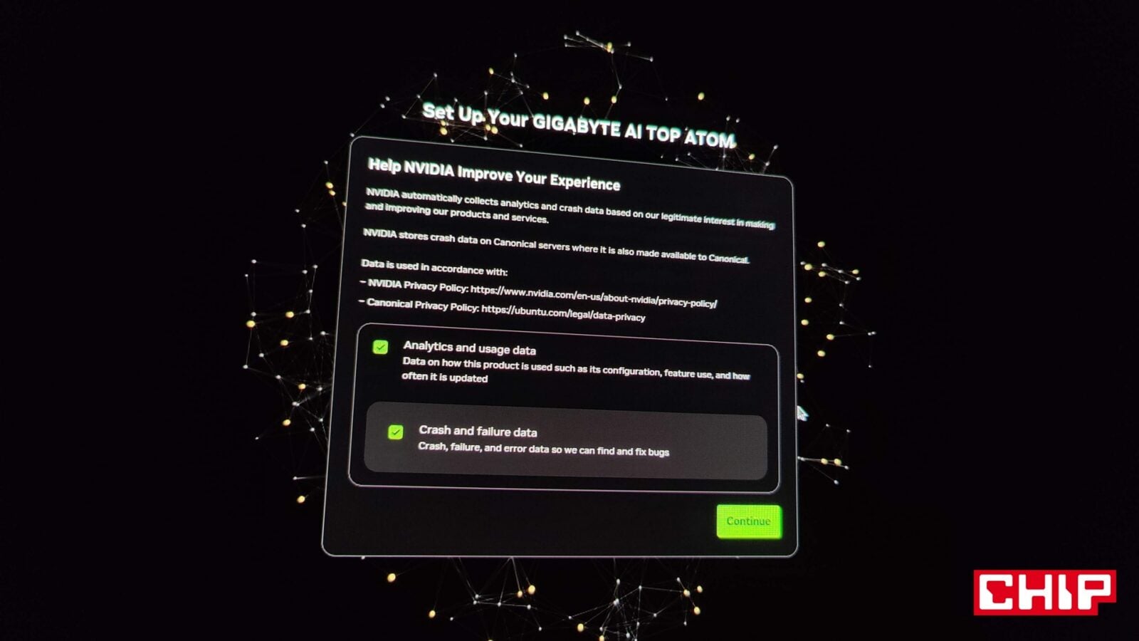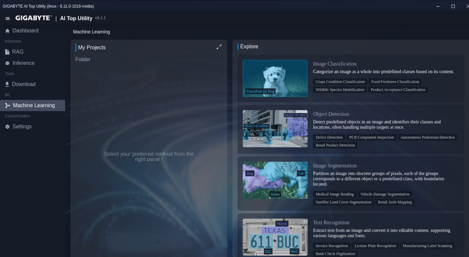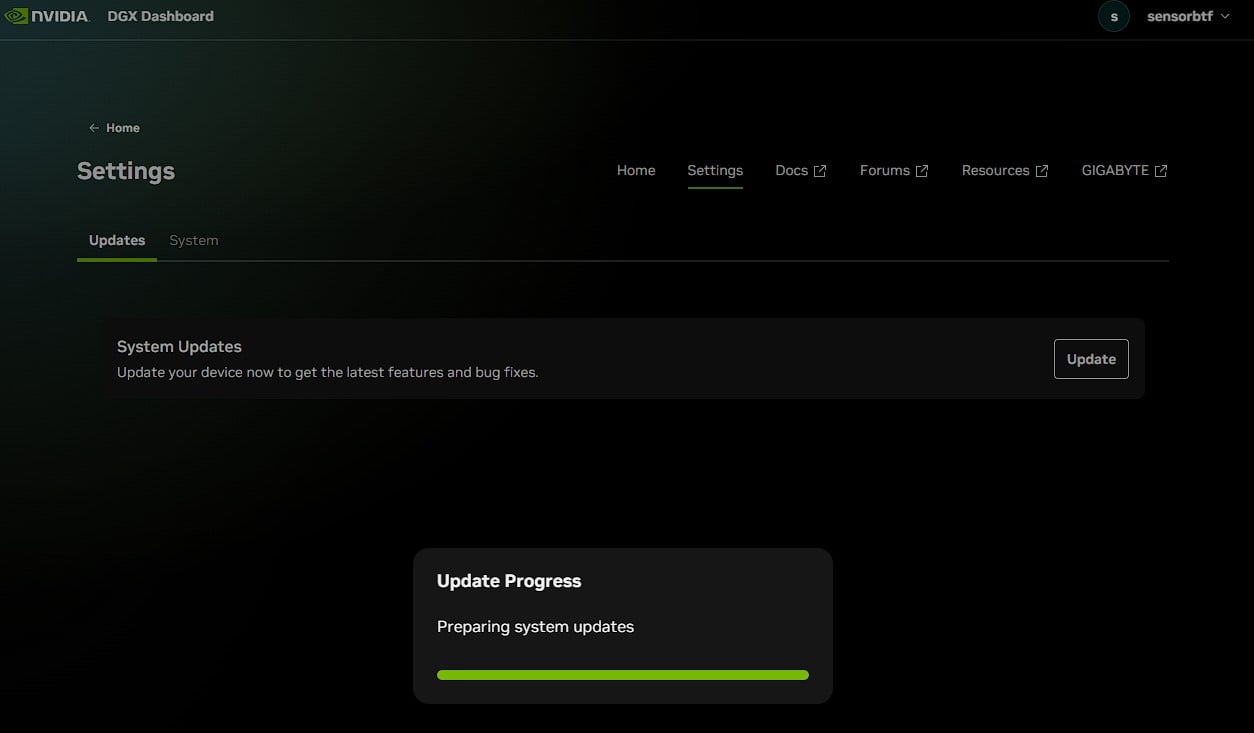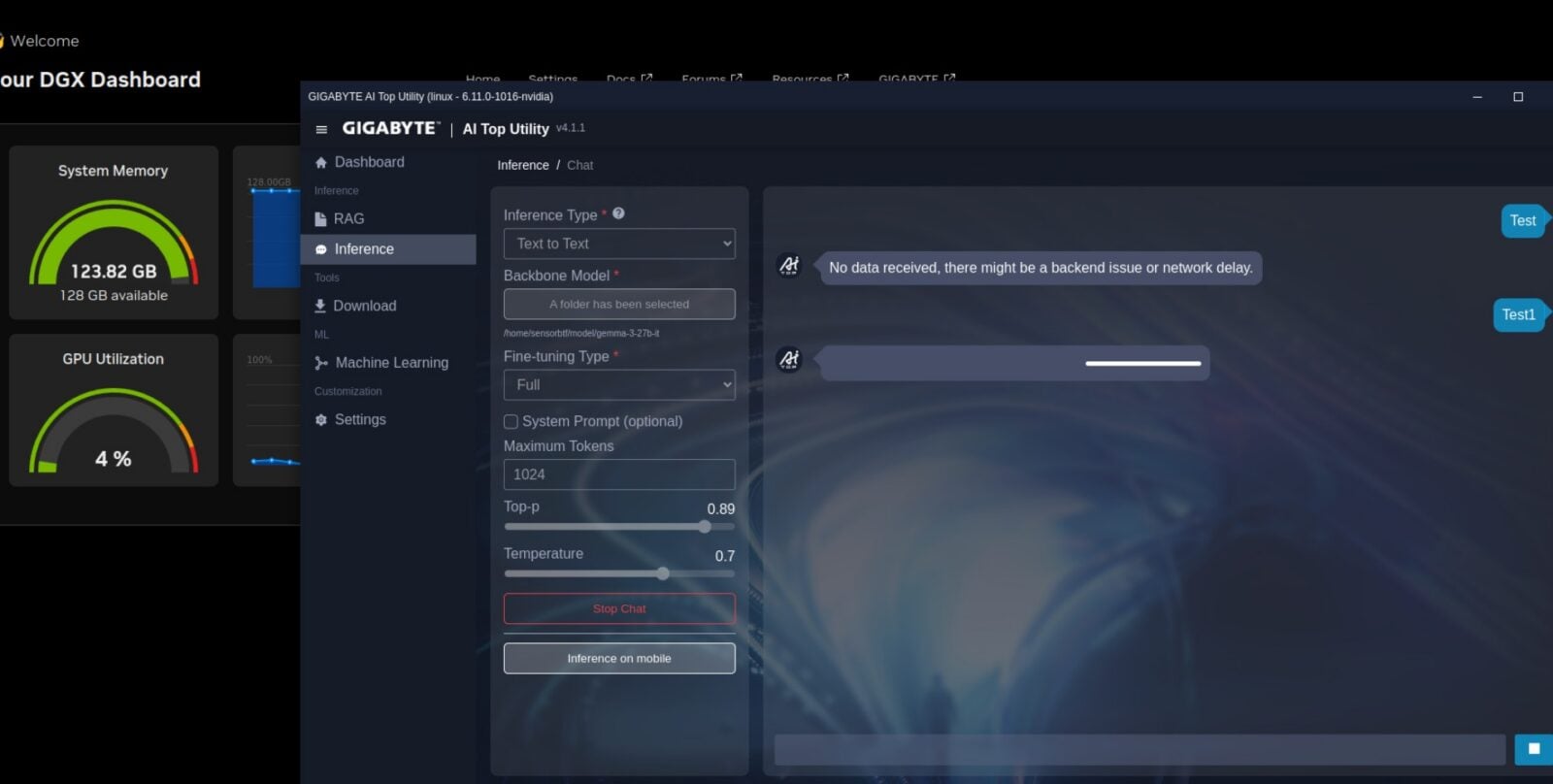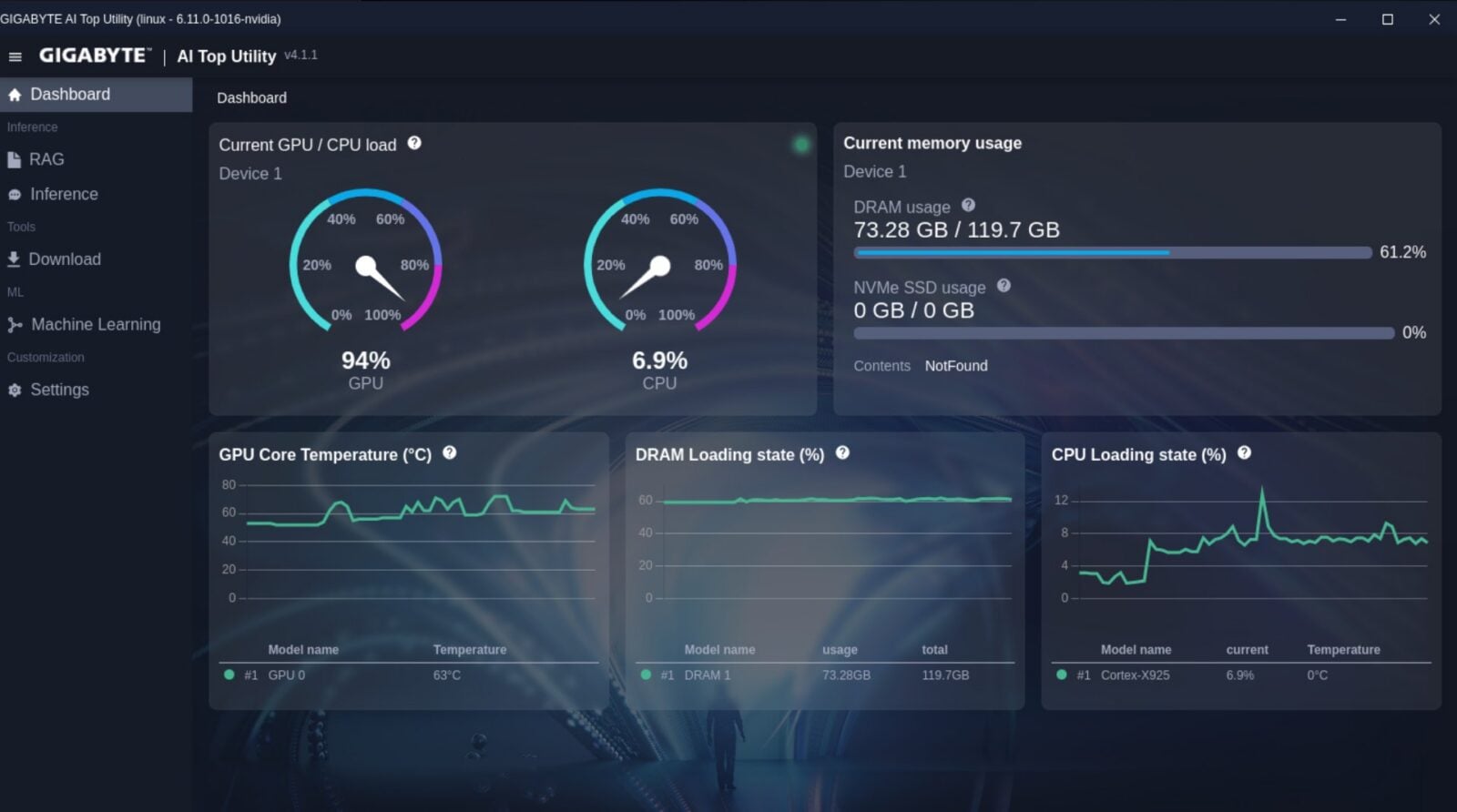 Instalacja i pierwsze uruchomienie wyglądają tak, jak obiecuje Gigabyte. Po wstępnej konfiguracji (w tym połączeniem się np. z siecią Wi-Fi w przypadku braku połączenia przewodowego) zainstalowanego już systemu trafiamy do AI TOP Utility i od razu widzimy panel do pobierania modeli, przygotowania danych oraz uruchamiania zadań. Zanim jednak wjedziecie w szczegóły, lepiej udajcie się na stronę DGX Dashboard (http://localhost:11000/) i przeprowadźcie proces aktualizacji sprzętu.