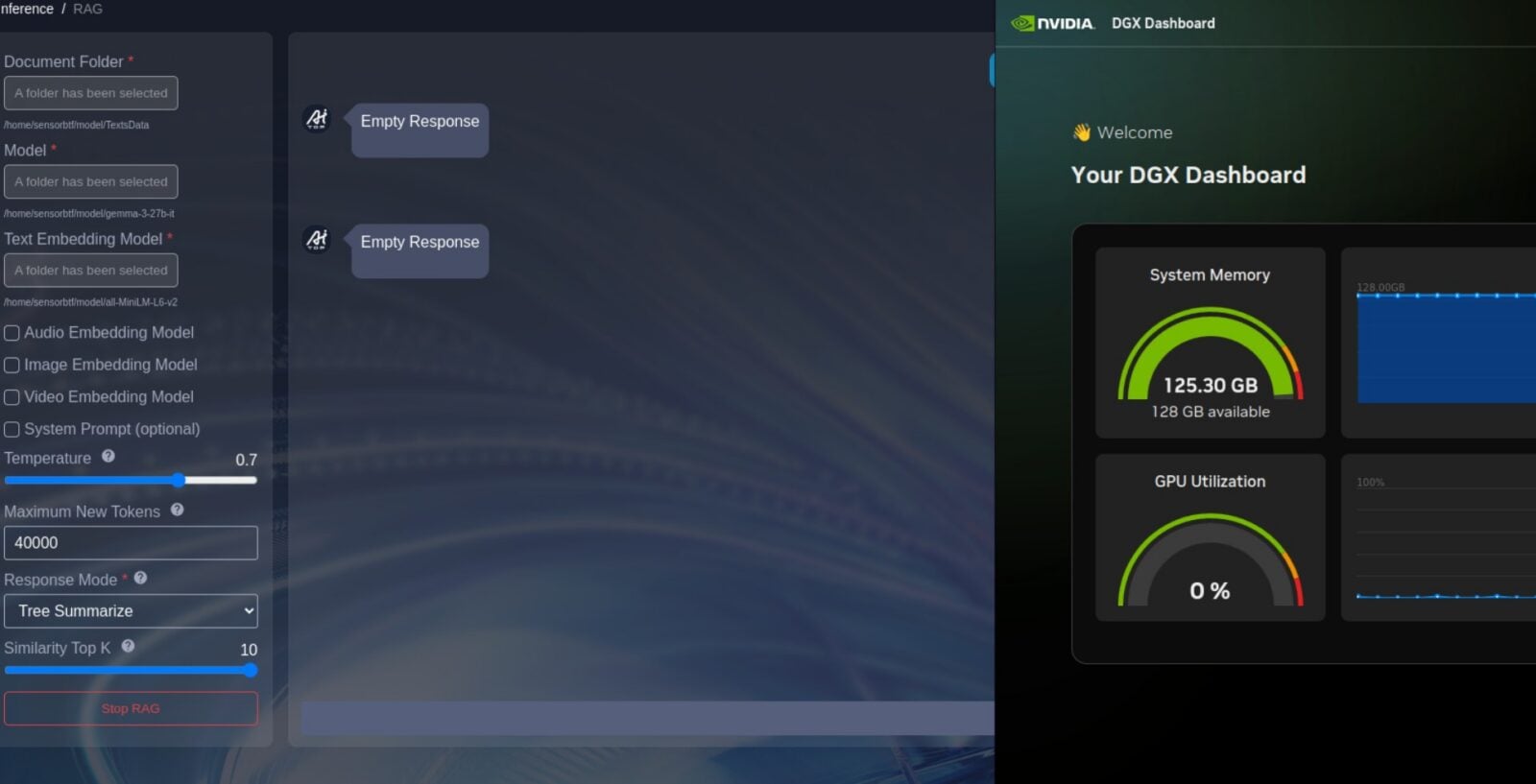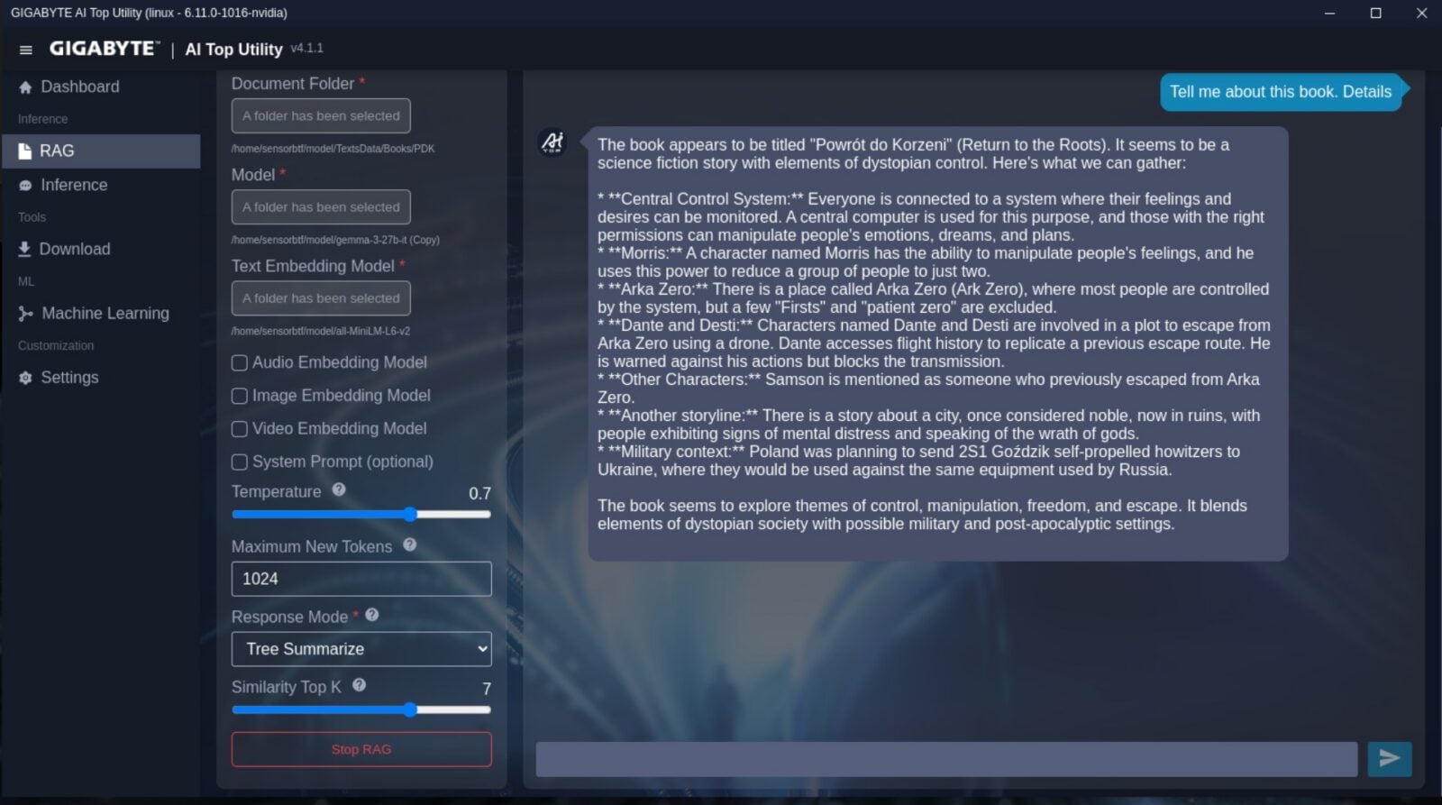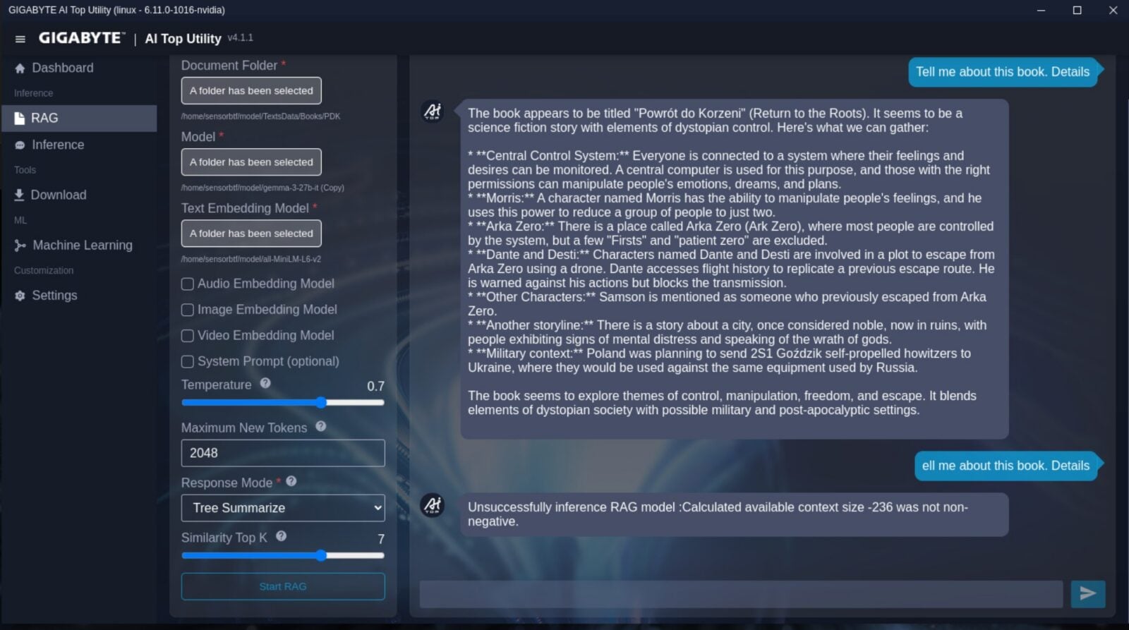 Liczyłem też na to, że sztuczna inteligencja ułatwi mi w pewnym stopniu analizowanie swoich książek. Jednak po wrzuceniu mojej debiutanckiej powieści w model gemma-3-27b-it ze wsparciem all-MiniLM-L6-v2 w trybie RAG z 1024 maksymalnymi nowymi tokenami (110 GB pamięci zajęte), rozczarowałem się wynikami – zarówno responsywnością, jak i dokładnością odpowiedzi. Był to jednak naiwny eksperyment spisany na straty już od samego początku, bo spodziewałem się, że sensowne przemielenie wielkiego dokumentu będzie daleko poza możliwościami nie tylko modelu SI, ale też samego sprzętu, którego zużycie pamięci zbliżyło się do granicy 128 GB. Z zestawem kilku artykułów w miejscu książki AI TOP ATOM poradził sobie jednak bardzo dobrze.