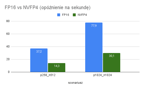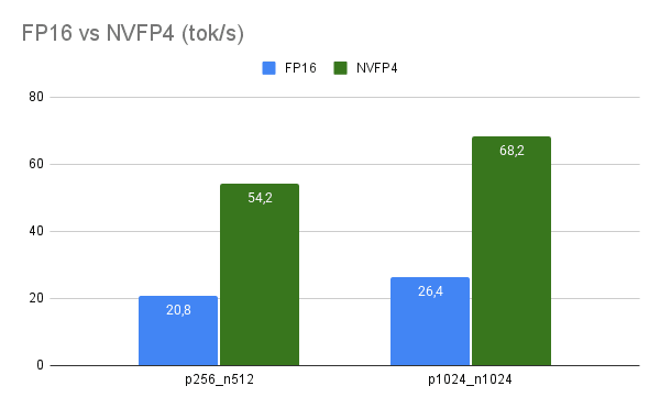 W praktycznych obciążeniach tekstowych NVFP4 przynosi wyraźny zysk względem FP16 i to zarówno w prefillu, jak i w dekodowaniu. Na tej samej maszynie wyniki z mojego zautomatyzowanego testu pokazały medianę przyspieszenia 2,6x w tok/s oraz skrócenie opóźnienia end-to-end mniej więcej o 2,6x w parach, które mieszczą się w oknie kontekstu modelu 8B. Dla przykładu konfiguracja p256 n512 przyspieszyła z 20,8 tok/s do 54,2 tok/s, a średnie opóźnienie spadło z 37,2 sekundy (s) do 14,3 s. W cięższej parze p1024 n1024 NVFP4 zwiększył przepustowość z 26,4 tok/s do 68,2 tok/s, skracając czas z około 77,9 s do 30,1 s. To nie jest jednorazowy strzał, bo TTFT także się poprawia – średnio z ~0,22 s do ~0,08 s, co daje ~2,6x szybsze pojawienie się pierwszego tokenu przy streamingu.