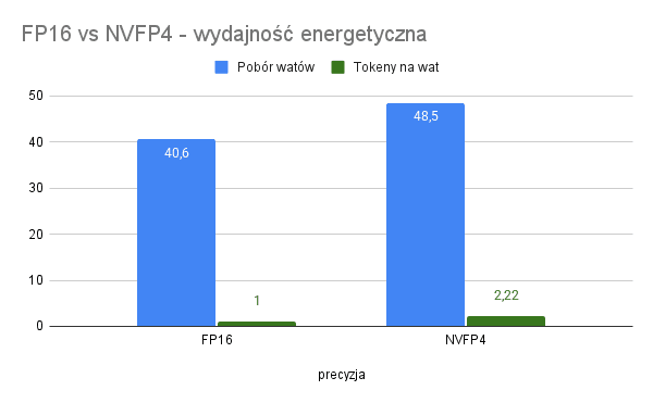 Kluczowe jest to, gdzie NVFP4 “odrabia” ten czas, a widać to w tym, że średnie prefill tok/s rosną ~2.6x, a decode tok/s podobnie ~2.6x, więc zysk nie wynika tylko z lepszego dekodowania krótkich odpowiedzi, ale skaluje się również przy dłuższych generacjach. Użycie NVFP4 powoduje jednak wzrost poboru mocy, choć sama efektywność i tak poszła ostro w górę. Telemetria z nvidia-smi pokazała średnio ~40,6 watów dla FP16 i ~48,5 watów dla NVFP4 przy podobnym zajęciu rdzenia na poziomie ~95%. Mimo wyższej mocy model NVFP4 dostarczał około 2.22x więcej tokenów na wat w uśrednieniu całych przebiegów, więc realny zysk energetyczny jest bezdyskusyjny.
