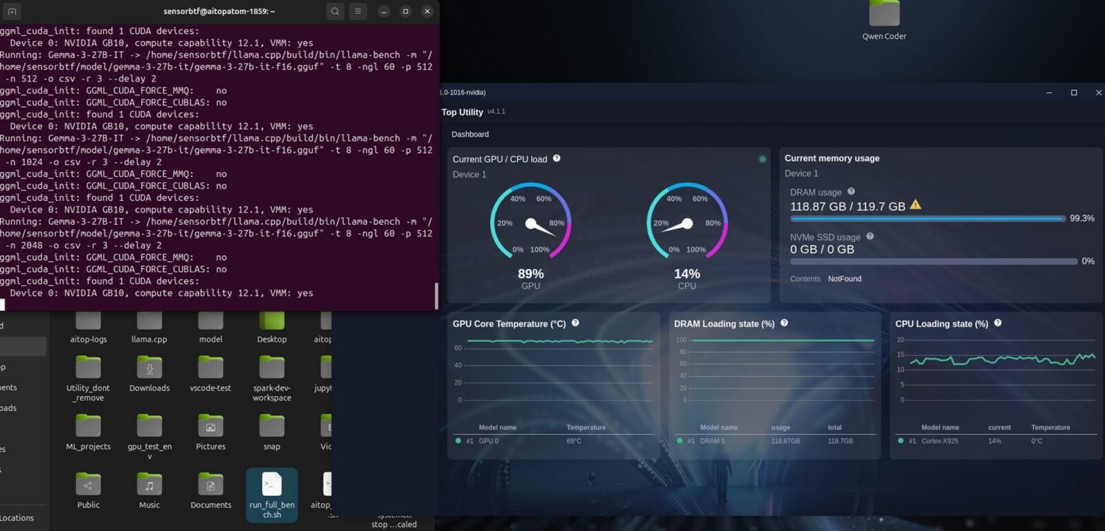 Na zakończenie codziennej zabawy z Gigabyte AI TOP ATOM zapodałem sprzętowi kilkunastogodzinny, kompleksowy benchmark, który objął test trzech różnych modeli. Qwen3-Coder-30B-A3B w kwantyzacji UD-Q4_K_XL jako specjalistę od programowania, Gemma-3-27B-IT w Q4_K_M jako kompaktowego generalistę oraz Gemma-3-27B-IT w pełnym FP16 jako punkt odniesienia dla jakości. Generator obciążenia robił swoje, a osobny sampler co sekundę zbierał temperatury i pobór mocy GPU, zapewniając informacje co do długotrwałej wydajności, przeciętnego zużycia energii podczas stałego obciążenia i krótkich szczytów poboru mocy pod maksymalnym obciążeniem. Co najważniejsze, cały test przebiegał bez żadnej niestabilności czy resetowania sprzętu.