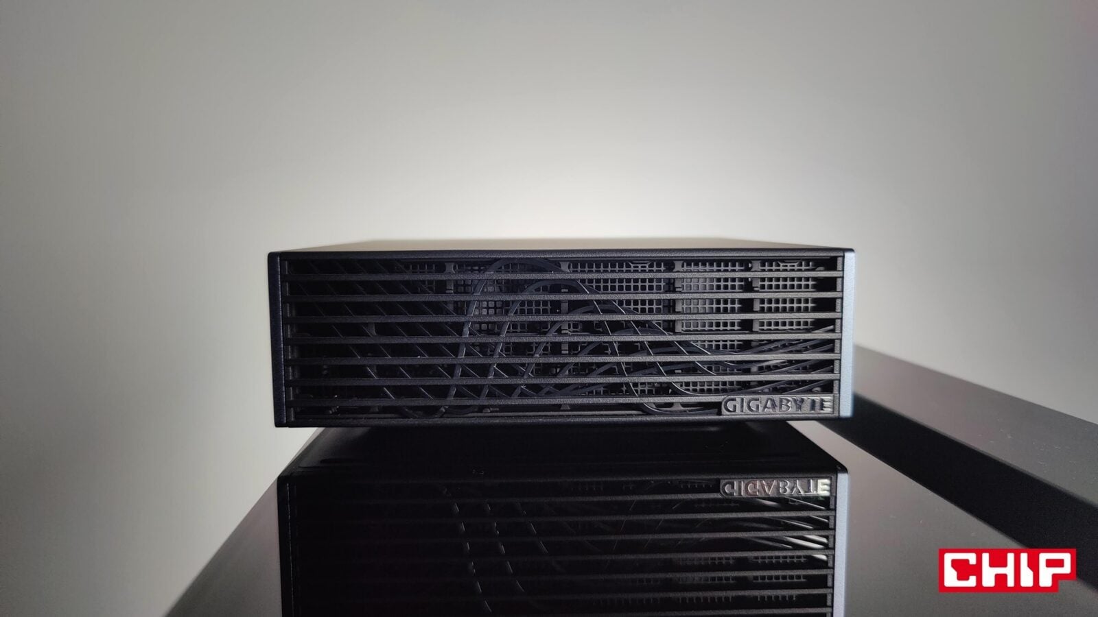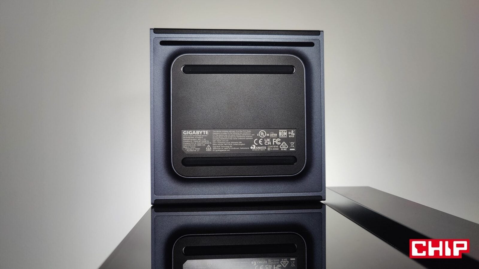 Komputer i zasilacz – to znajdziecie w pudełku AI TOP ATOM, więc samo uruchomienie sprzętu jest proste, bo wystarczy zapewnić mu zasilanie. Zwłaszcza że domyślnie producent aktywował funkcję automatycznego włączenia komputera po utracie zasilania. Niestety poza wizualnymi zmianami obudowy, Gigabyte nie postarał się o okazalsze rozbudowanie wersji referencyjnej, którą oferuje NVIDIA, a szkoda. Tyczy się to zwłaszcza braku dodatkowego portu USB-A, bo ten komputer ogranicza się do czterech USB-C, co utrudnia kompatybilność z peryferiami. Na samo wykonanie obudowy nie można jednak narzekać – solidny metal, duże otwory wentylacyjne, podkładka gumowa na spodzie i ciągle te same kompaktowe wymiary.