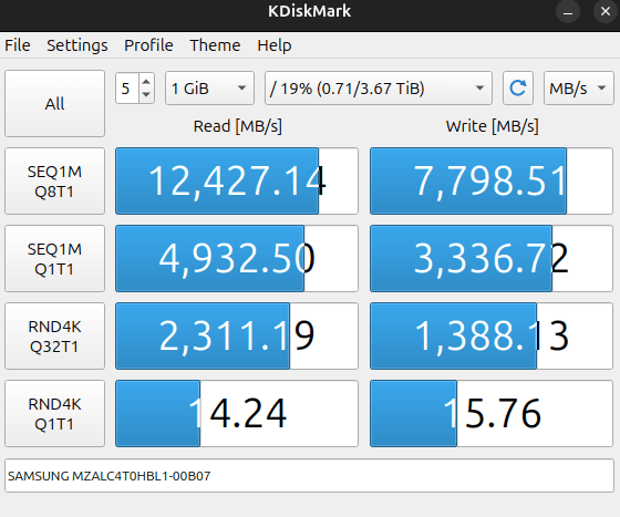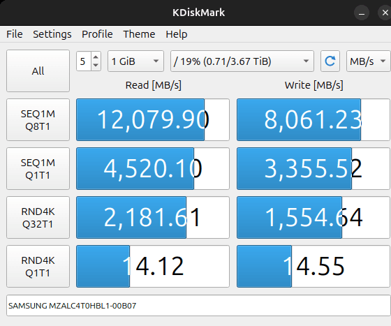Pierwsze kilka dni z Gigabyte AI TOP ATOM spędziłem tak, jak z typowym komputerem. Wnioski? Responsywny i pozbawiony problemów z płynnym działaniem nawet podczas instalacji programów. Nie powinno być to wprawdzie wielkim zaskoczeniem, bo przecież nie jest to byle komputer, a maszynka z potężnym układem obliczeniowym, ale warto o tym wspomnieć, żebyście nie myśleli, że odpalenie na tym kompie terminala to jedyny sposób korzystania z niego. Trzy grosze do tej płynności dorzuca wydajny dysk SSD firmy Samsung na PCIe 5.0, który to zapewnia bardzo dobre transfery. Spójrzcie tylko: