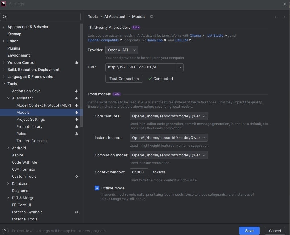 Wybór padł na model Qwen3-Coder-30B-A3B (UD-Q4_K_XL), który waży prawie 18 GB. Stworzyłem dla niego skrypt, który automatycznie stawia zdalny dostęp (za pośrednictwem llama-server) i uruchamia model z maksymalnym kontekstem 262144. Resztę ustawień wybrałem już standardowo, o czym możecie przeczytać w tym artykule. Kolejnym krokiem tworzenia takiego lokalnego narzędzia bezpośrednio w IDE było stosowne wskazanie JetBrains Rider lokalnego modelu, który jest dostępny pod adresem maszyny na wskazanym porcie i… tyle. Wszystko ruszyło z poziomu przyjemnego chatu w IDE, a odpowiedzi trafiały do mnie błyskawicznie.