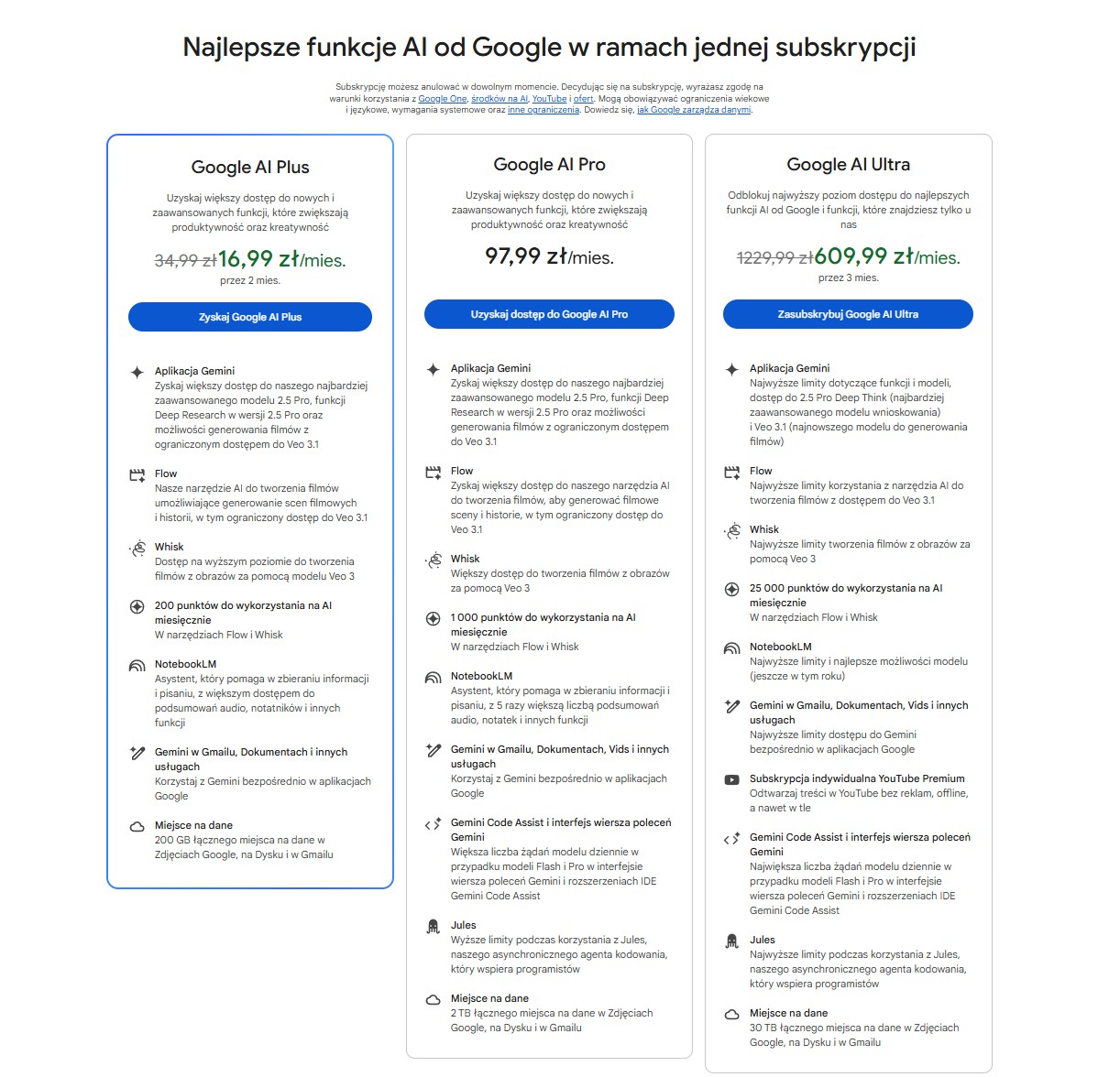 Kolejną nowością jest pakiet Google AI Plus, który wchodzi do naszego kraju w cenie 34,99 złotych miesięcznie. Brak rocznej opcji subskrypcji może rozczarować osoby szukające oszczędności. Przez pierwsze dwa miesiące obowiązuje promocyjna stawka 16,99 złotych. Warto więc sprawdzić, zwłaszcza w takiej cenie. Zwłaszcza że oferta obejmuje 200 GB przestrzeni dyskowej współdzielonej między Gmailem, Zdjęciami Google i Dyskiem Google. Do tego dochodzi dostęp do aplikacji Gemini z modelem 2.5 Pro, ograniczony dostęp do Veo 3.1, narzędzia Flow również z limitowanym Veo 3.1, Whisk z Veo 3 oraz Notebook LM z rozszerzonymi możliwościami. Gemini będzie też dostępny w Gmailu, Dokumentach, Vids i innych usługach. Abonenci otrzymują miesięcznie 200 punktów na funkcje AI.
