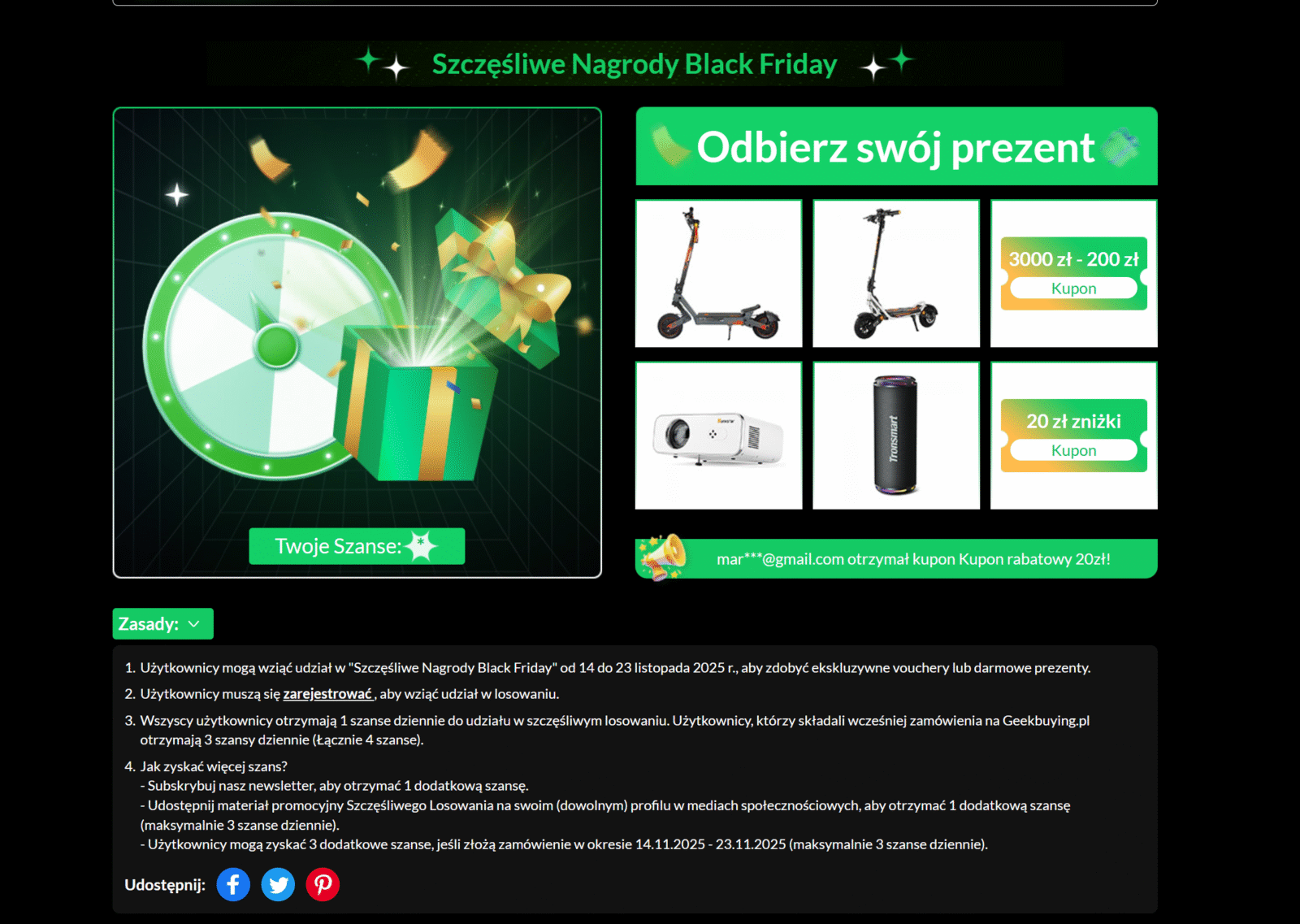 Na czas Black Friday Geekbuying uruchamia „szczęśliwe koło” z nagrodami, w którym do wygrania są m.in. hulajnogi elektryczne, projektor, głośnik przenośny oraz kupony. Loteria trwa od 14 do 23 listopada 2025 r., a udział wymaga rejestracji w serwisie. Każdy użytkownik dostaje jedną szansę dziennie, natomiast osoby, które wcześniej składały zamówienia na Geekbuying.pl, mają trzy dodatkowe szanse dziennie.