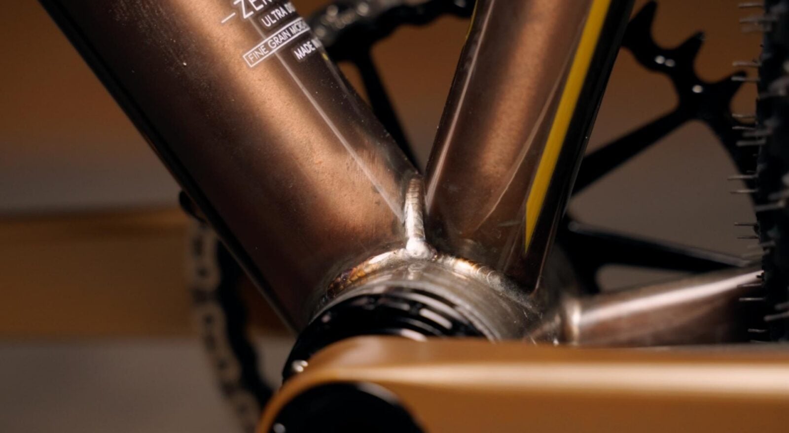 Mason Exposure Primitiva nie jest jednak rowerem zbudowanym od zera. Bazą dla tego prototypu jest Mason Exposure, czyli stalowa reinterpretacja gravela Bokeh tej marki, która charakteryzuje się spokojniejszą geometrią, dużym prześwitem na opony i gwintowanym suportem T47 przygotowanym na jazdę z dużym obciążeniem w terenie. W wersji Primitiva rzemieślnik Cicli Barco wyspawał i zlutował oryginalną odmianę tej ramy z progresywnie cieniowanych rur Dedacciai, a całość wykończył specjalnym malowaniem, które przechodzi od mosiężnego odcienia z przodu do surowego, bo bezbarwnego lakieru z tyłu. Osprzęt jest bardzo współczesny, bo obejmuje osie przelotowe 12 mm, haki kompatybilne z UDH i miejsce na opony o szerokości mniej więcej od 50 do 55 mm, co w praktyce oznacza typowe zestawy kół 29 i 27,5 z naprawdę pokaźną objętością ogumienia.