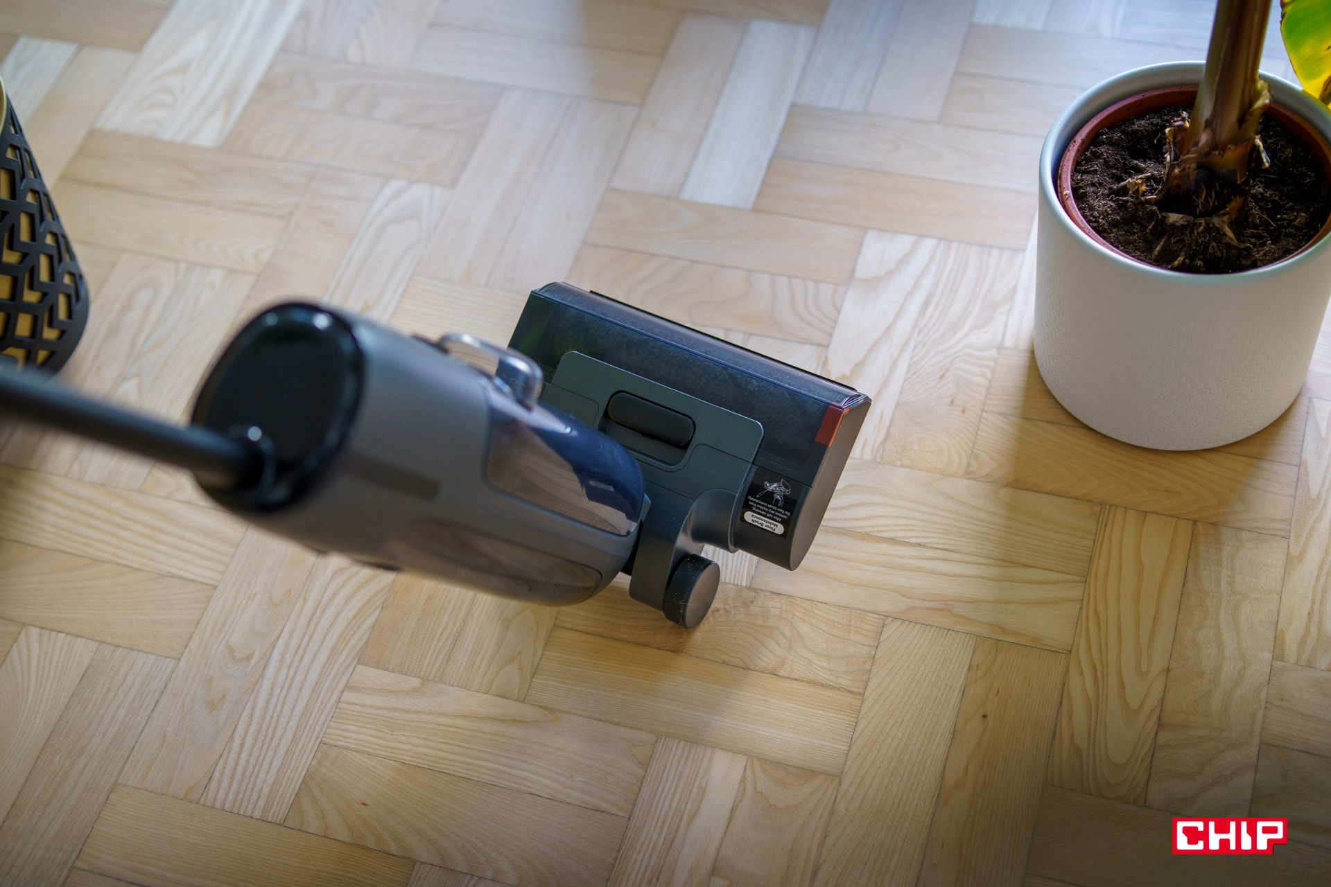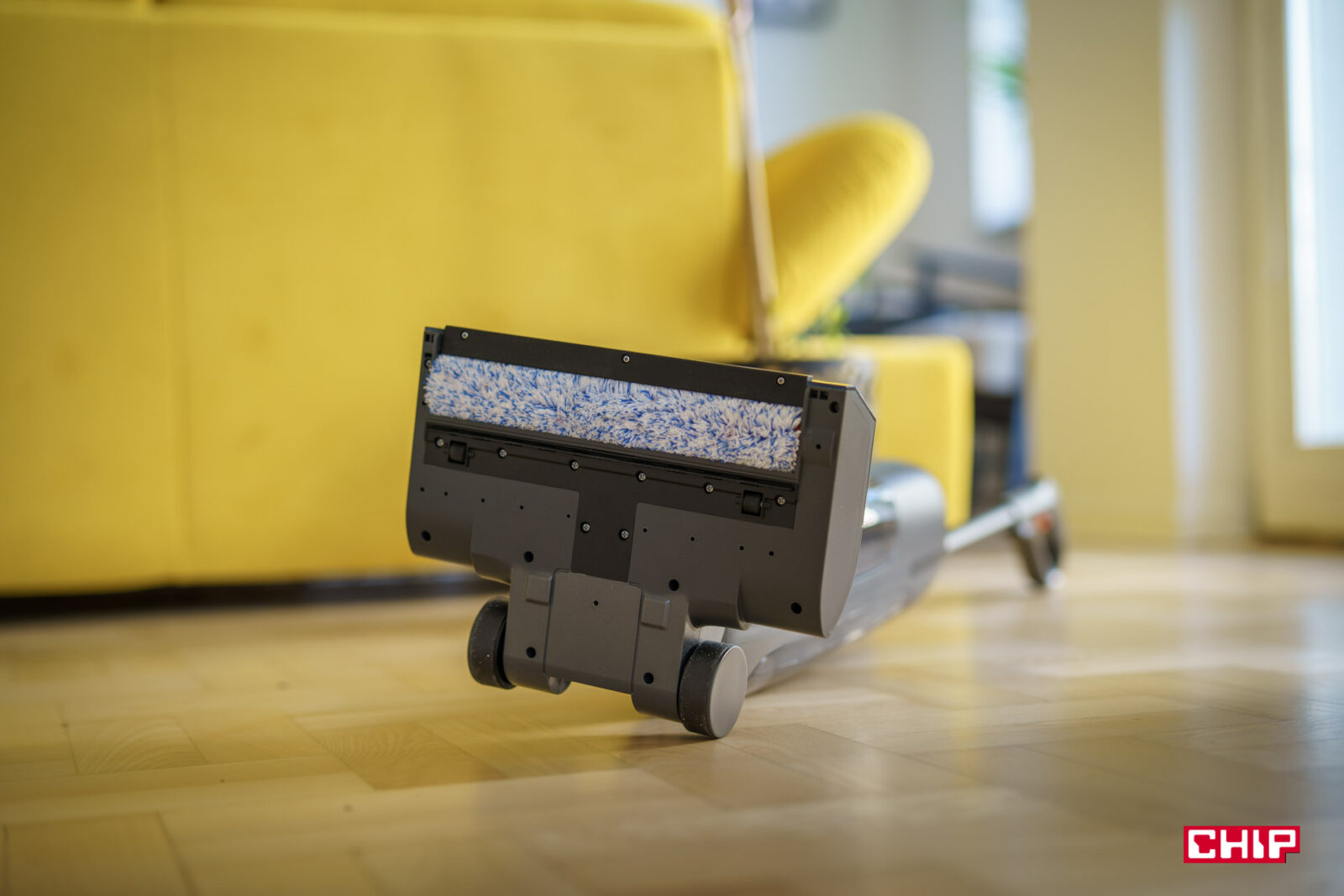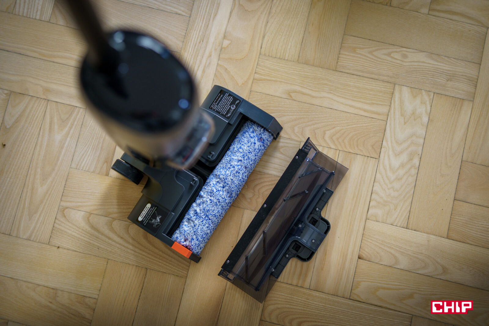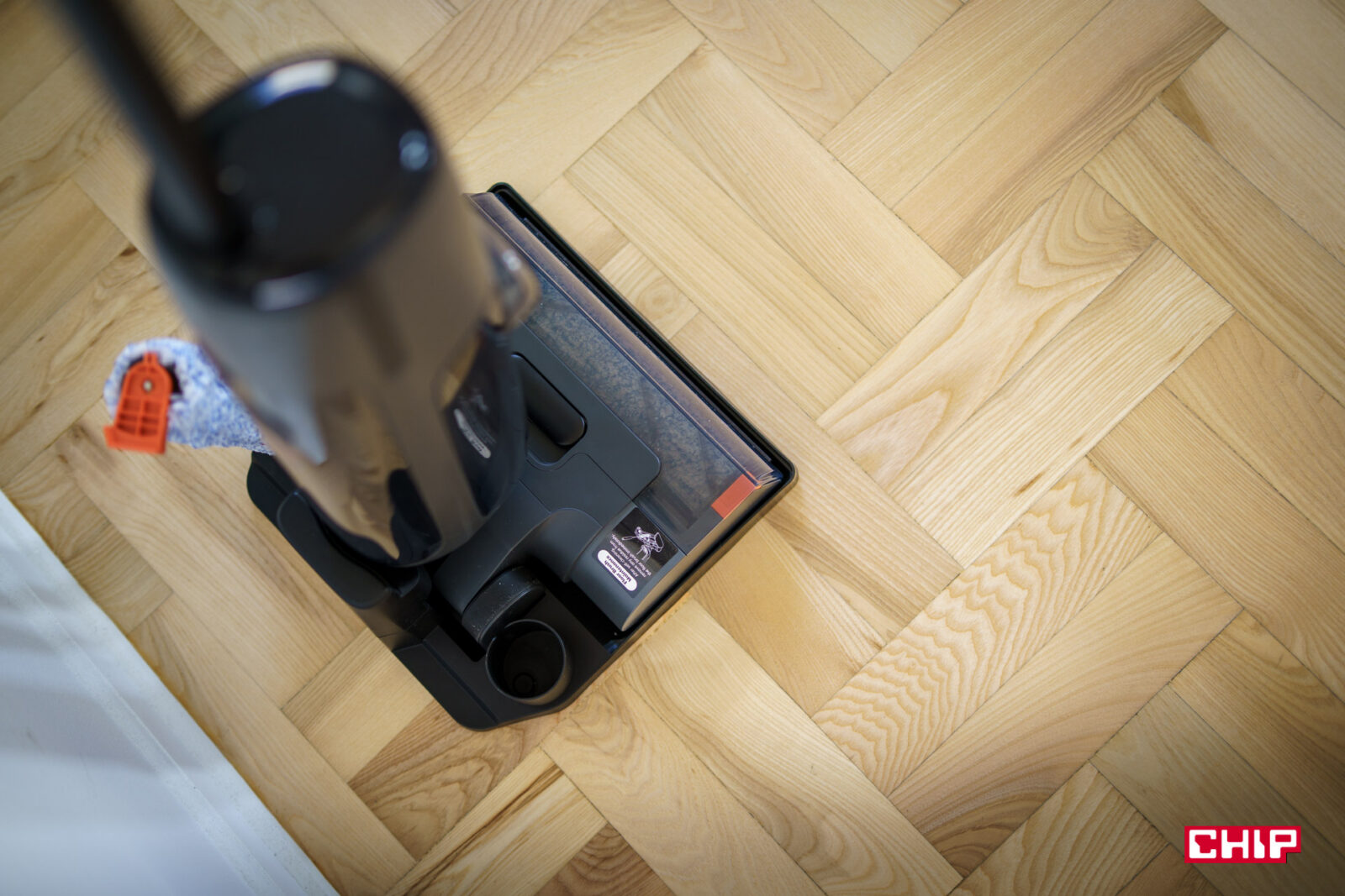 Mopowanie jest… dziwne. Nawet jak mamy wodę w pojemniku, nie jest ona dozowana. Aby to zrobić, musimy użyć pomarańczowego przycisku na spodzie rączki. Po jego wciśnięciu otwierają się dysze umieszczone za wałkiem i w ten sposób rozpoczynamy mopowanie. Dozowanie wody wymaga nabrania nieco wprawy, bo jeśli zbyt długo przytrzymamy przycisk, na podłodze lubią zostawać plamy. Lepiej jest zwilżać mopa co jakiś czas, niż zbyt długo dusić przycisk. To zdecydowanie bardziej służy przecieraniu podłóg na mokro z kurzu, niż czyszczenia z zaschniętych plam. Niemniej jest to funkcja pozwalająca poprawić efektywność sprzątania.