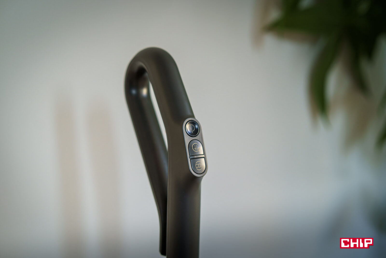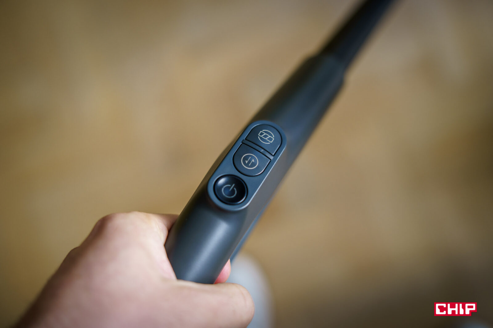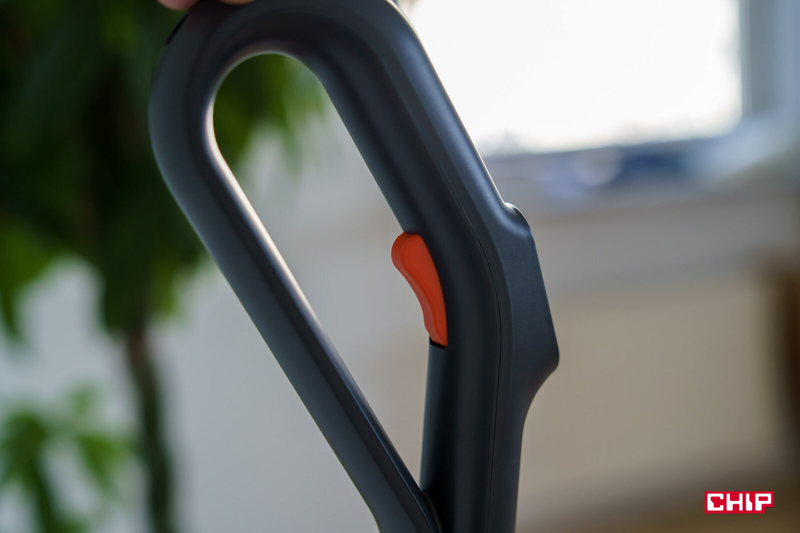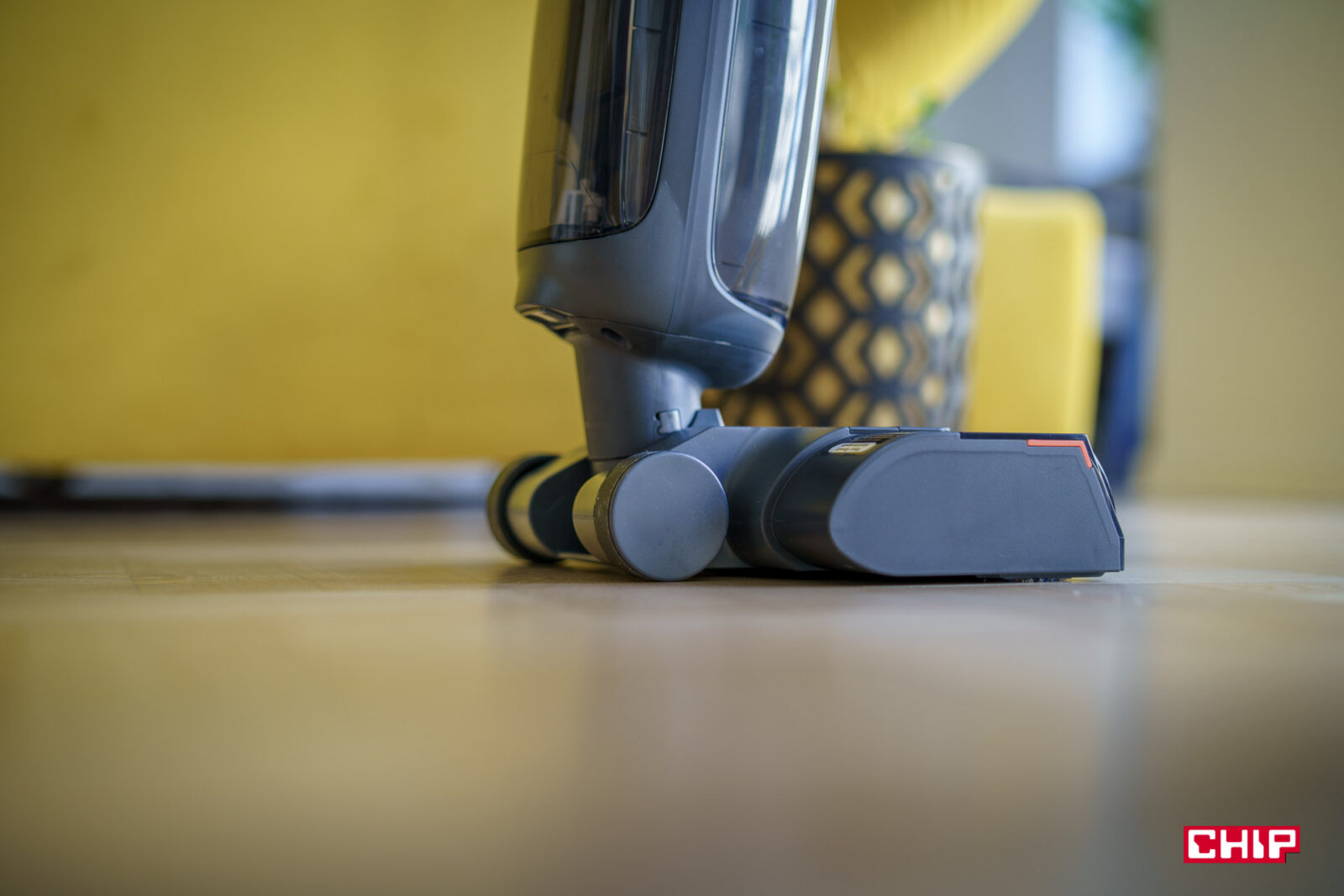 Mopowanie jest… dziwne. Nawet jak mamy wodę w pojemniku, nie jest ona dozowana. Aby to zrobić, musimy użyć pomarańczowego przycisku na spodzie rączki. Po jego wciśnięciu otwierają się dysze umieszczone za wałkiem i w ten sposób rozpoczynamy mopowanie. Dozowanie wody wymaga nabrania nieco wprawy, bo jeśli zbyt długo przytrzymamy przycisk, na podłodze lubią zostawać plamy. Lepiej jest zwilżać mopa co jakiś czas, niż zbyt długo dusić przycisk. To zdecydowanie bardziej służy przecieraniu podłóg na mokro z kurzu, niż czyszczenia z zaschniętych plam. Niemniej jest to funkcja pozwalająca poprawić efektywność sprzątania.