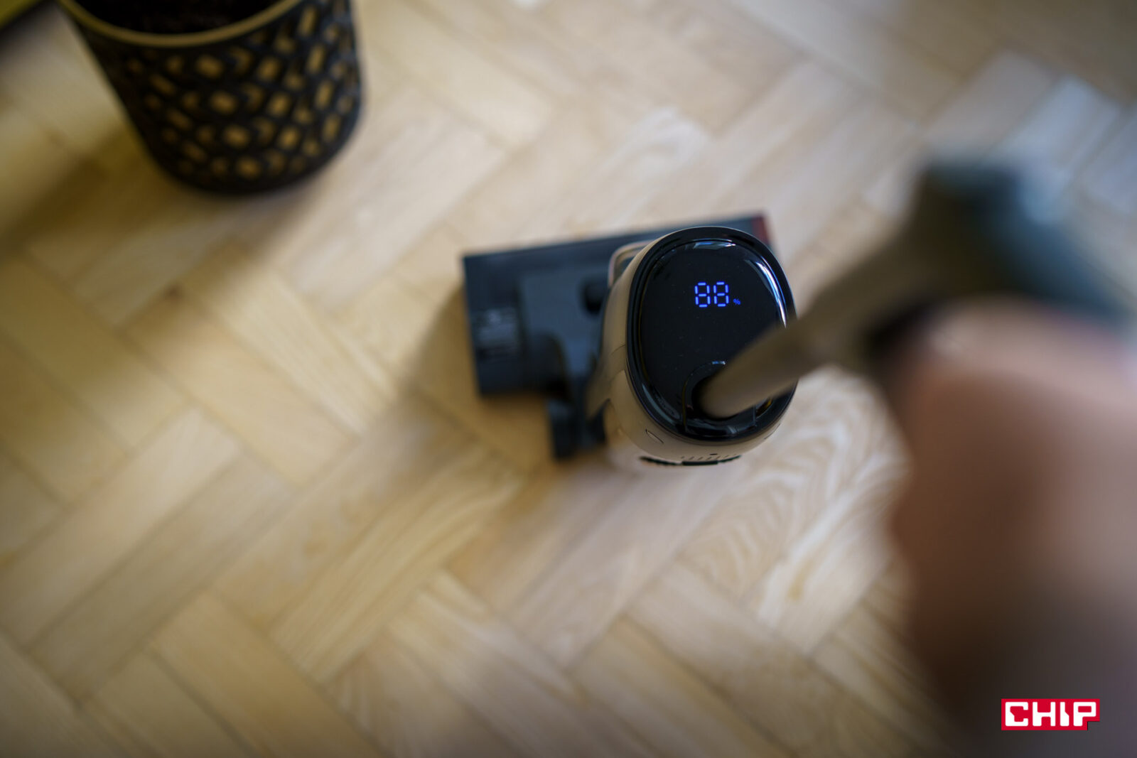 Cały zestaw uzupełnia stacja, w której odbywa się samoczyszczenie urządzenia oraz ładowanie. Ładowarkę podpinamy bezpośrednio do stacji, więc odkurzacz jest zawsze gotowy do pracy i ładuje się od razu po odstawieniu na miejsce.