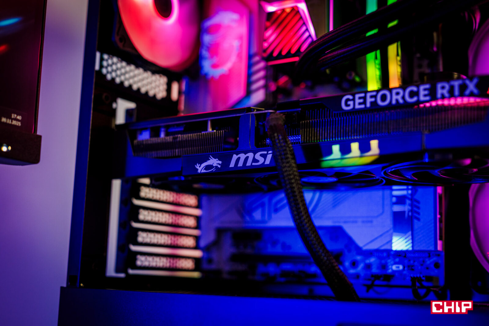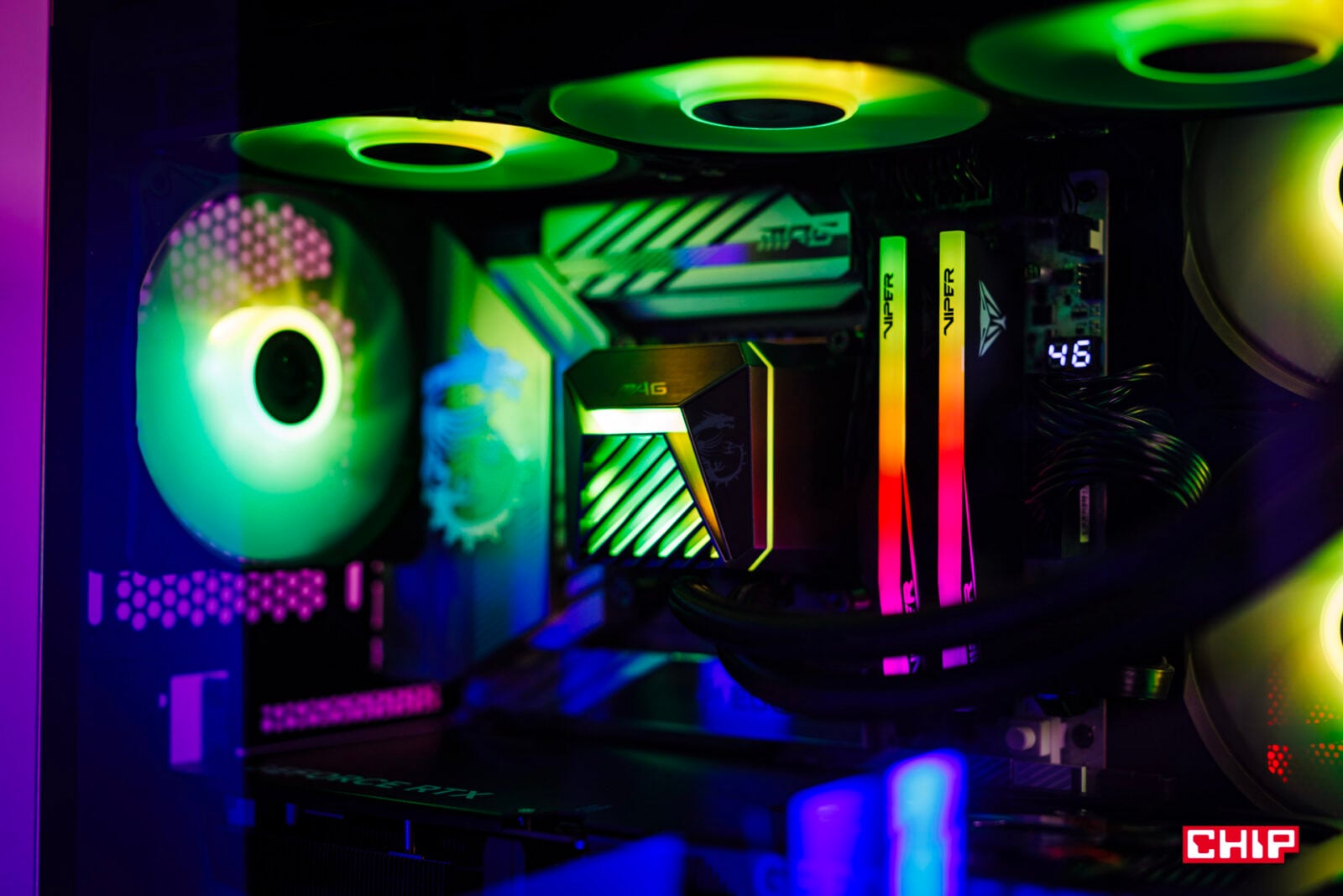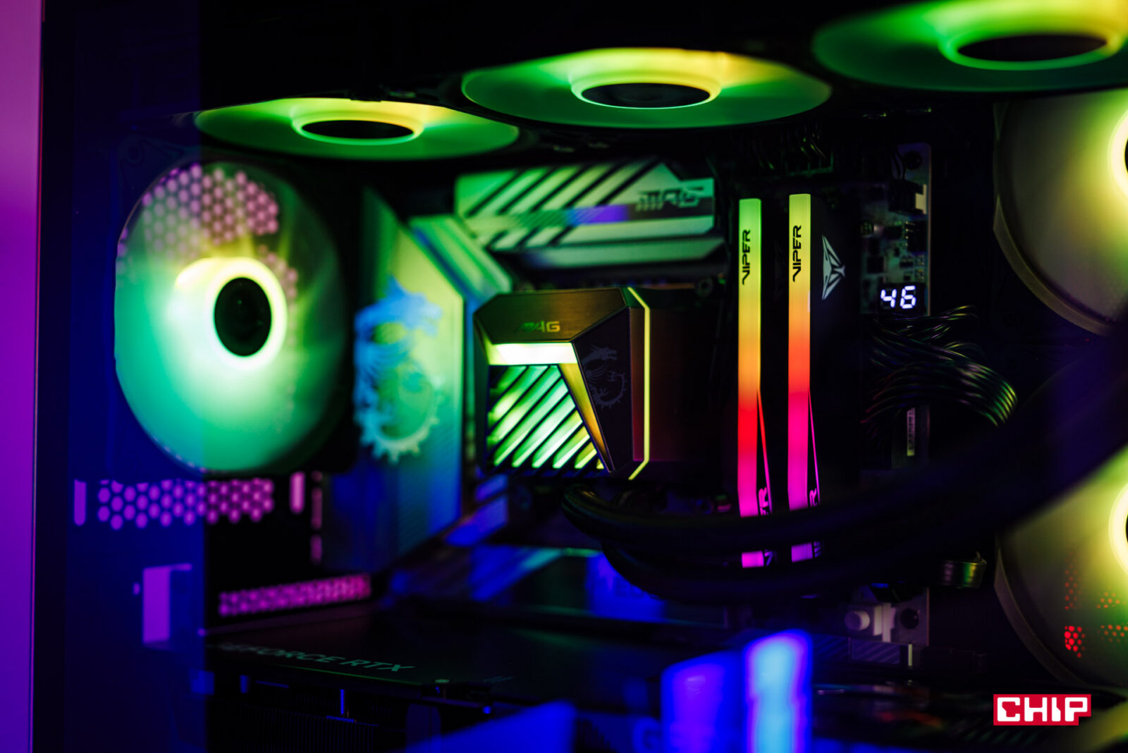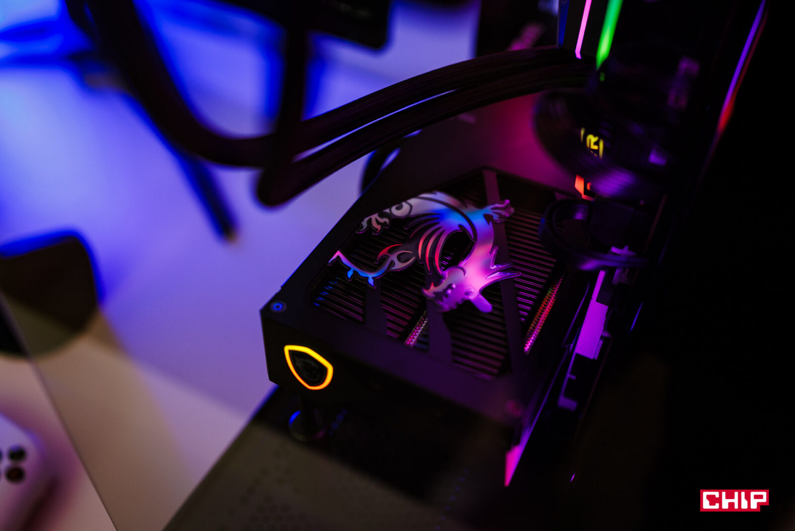 MSI produkuje też wielokrotnie nagradzane chłodzenia pokroju systemu wodnego MAG CORELIQUID A15 360, który zapewnia niskie temperatury procesora przy sensownym poziomie hałasu nawet w mniejszych obudowach pokroju MAG PANO 110R PZ. Trudno się jednak temu dziwić, bo w tej szczególnej obudowie MSI pokazało klasę, łącząc solidny przepływ powietrza z chwytającym za serce widokiem na wnętrze komputera za sprawą szklanego panelu. Wszystko to “nakarmi” elektronami zasilacz MPG A1000G PCIE5 w standardzie ATX 3.1 z nowszym przewodem 12V-2×6, ale to i tak nie wszystko. Wisienką na torcie jest dysk SPATIUM M480 PRO 2 TB na PCIe 4.0, który błyskawicznie ładuje gry i nie rozgrzewa się nawet pod znacznym obciążeniem.