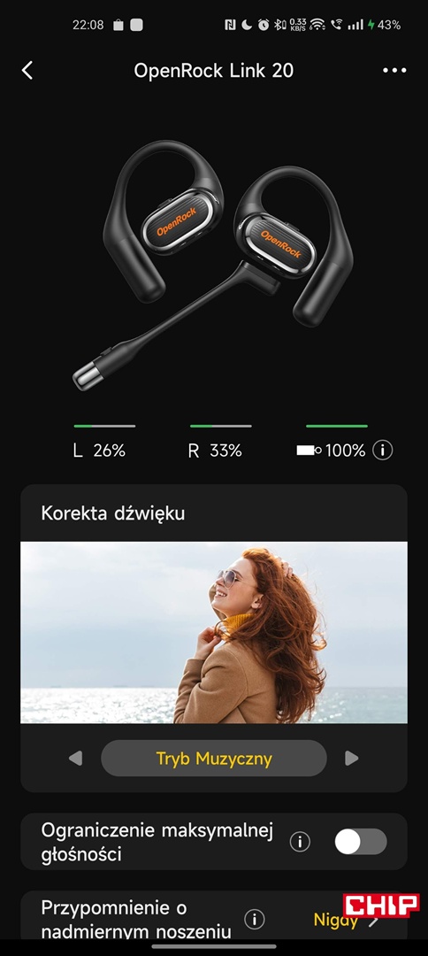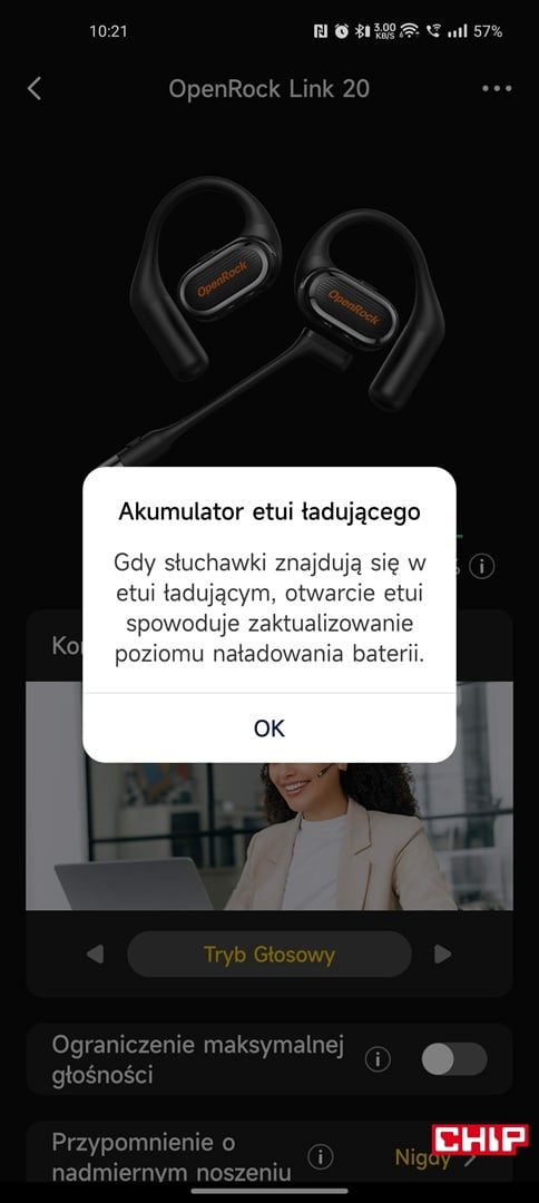 Jak więc zachowuje się sprzęt na co dzień? Dosyć tradycyjnie, bo po otworzeniu etui słuchawki od razu parują się ze sprzętem, więc wyciągamy je z niego już sparowane. Z kolei po włożeniu słuchawek to etui odtwarzanie nie jest zatrzymywane, bo słuchawki ciągle utrzymują połączenie, ładują się z etui, ale sam dźwięk już nie wybrzmiewa. Dopiero zamknięcie wieczka powoduje rozłączenie się słuchawek. Muszę też wspomnieć, że choć typowe słuchawki na Bluetooth w przypadku mojego peceta sprawiają, że powiadomienie na telefonie blokuje mi odtwarzanie muzyki i wymusza jej wznowienie, to OpenRock Link 20 obejmują tylko chwilowe ściszenie utworów.