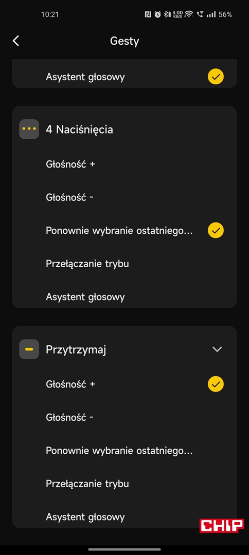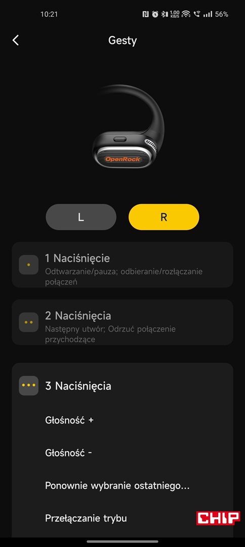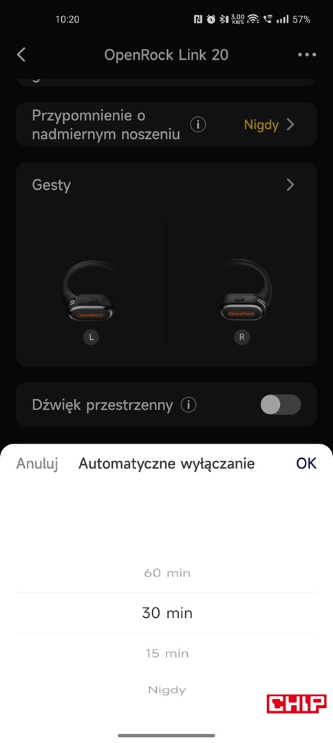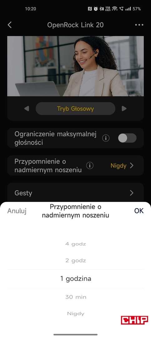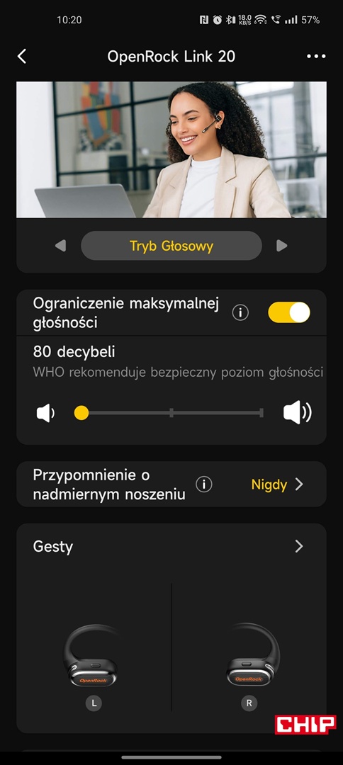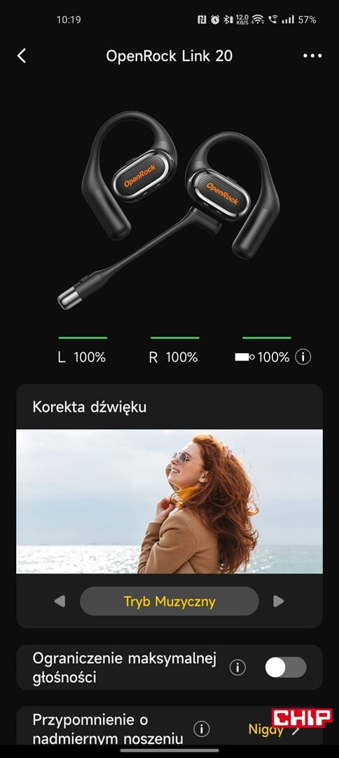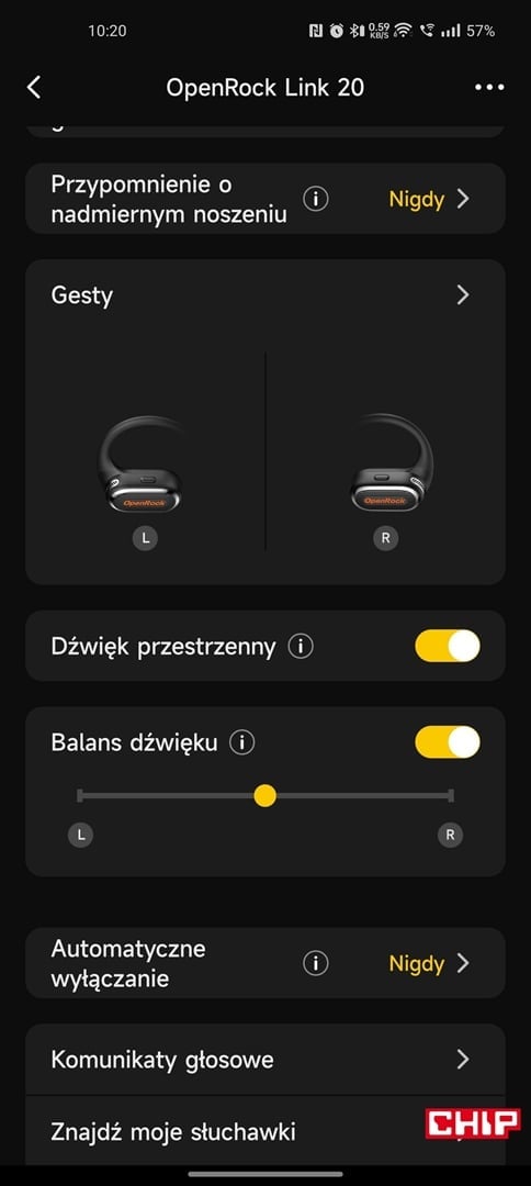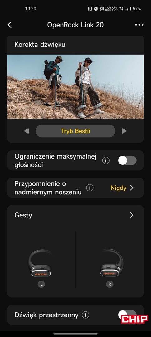 Producent zapewnia wsparcie Link 20 w ramach oprogramowania dostępnego do pobrania na urządzenia z Androidem oraz iOS-em. Oferowana aplikacja gwarantuje dostęp zarówno do podstawowych funkcji, jak i tych rzadziej spotykanych. Poza podejrzeniem poziomu naładowania akumulatorów, zbalansowaniem poziomu głośności między słuchawkami, dostosowaniem brzmienia czy gestów związanych z przyciskiem obecnym na obu słuchawkach, możemy też ustawić poziom głośności komunikatów głosowych (tylko w języku chińskim i angielskim), a do tego skonfigurować automatyczne wyłączanie czy przypominanie o zbyt długim noszeniu słuchawek.