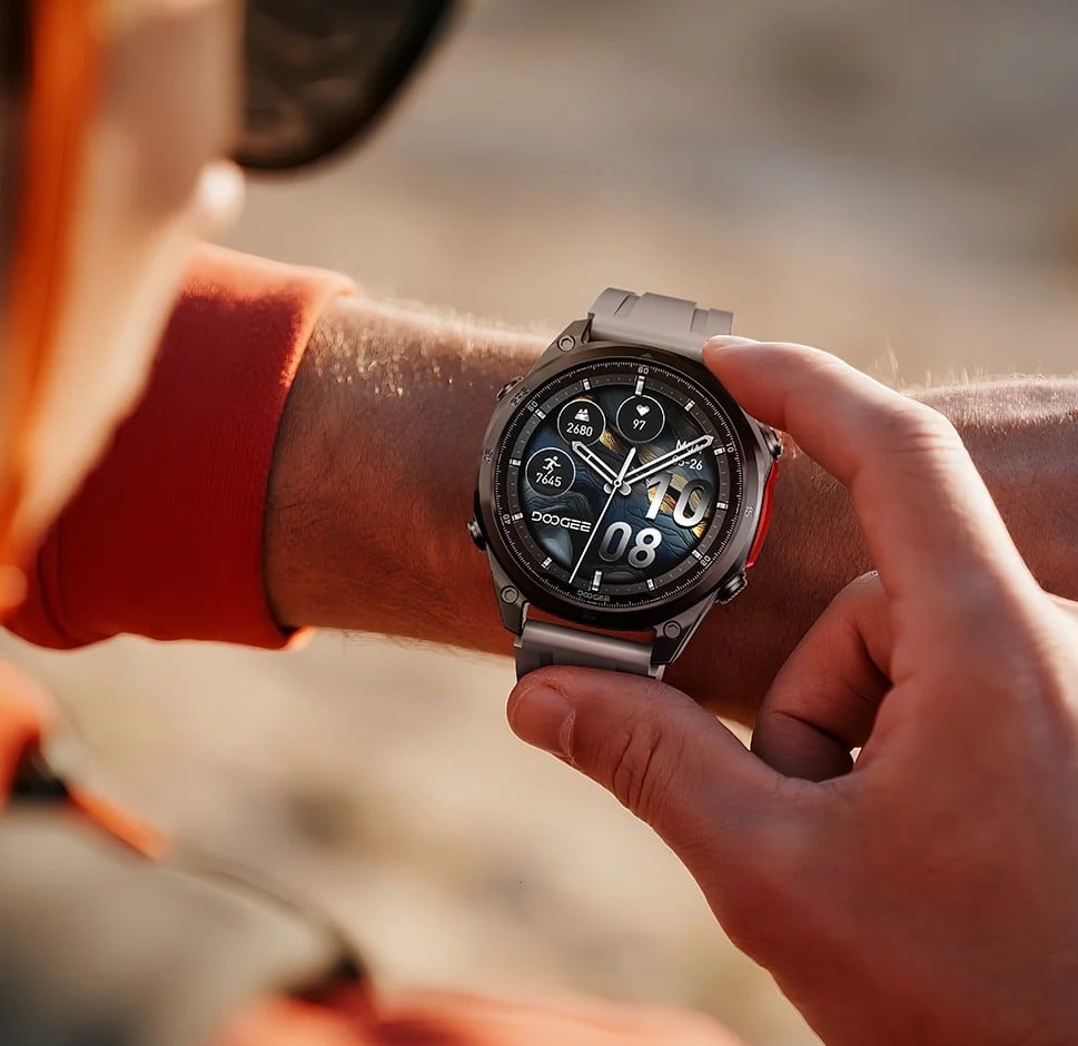 Co ciekawe, zamiast tradycyjnego, energooszczędnego wyświetlacza stosowanego w Garminach, Doogee postawiło na jakość wizualną. Urządzenie wyposażono w okrągły, 1,43-calowy wyświetlacz AMOLED chroniony wytrzymałym szkłem Panda Glass. Zapewnia to żywe kolory i doskonałą widoczność nawet w słońcu. Bardzo praktycznym dodatkiem, przydatnym zarówno na kempingu, jak i podczas wieczornego biegania, jest wbudowana latarka LED.