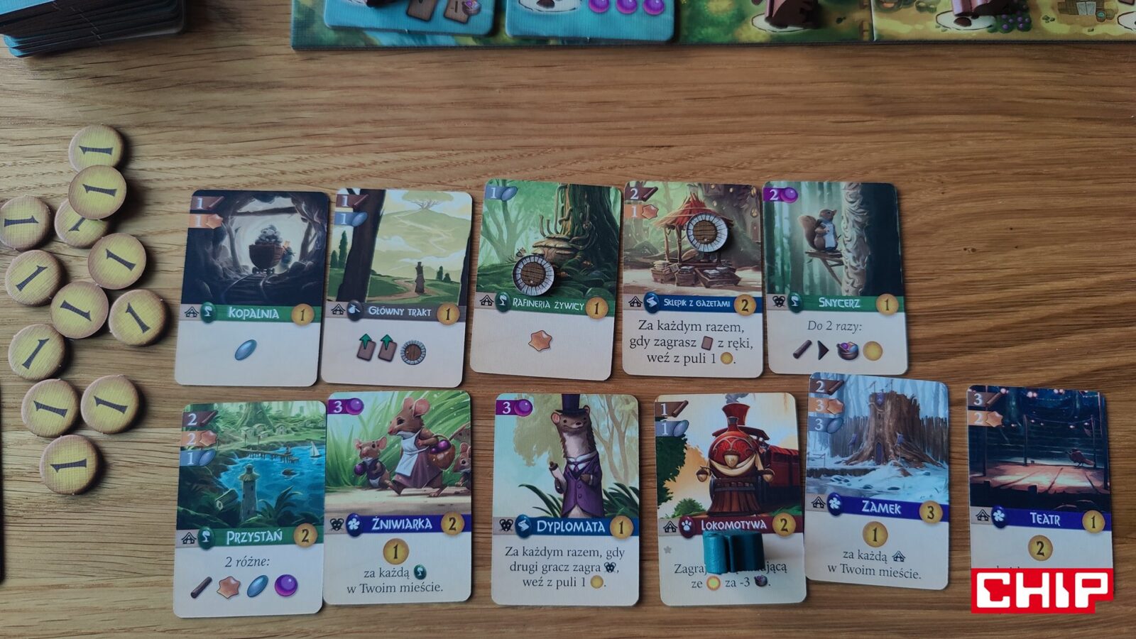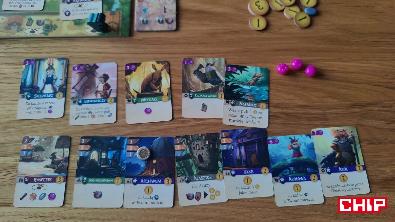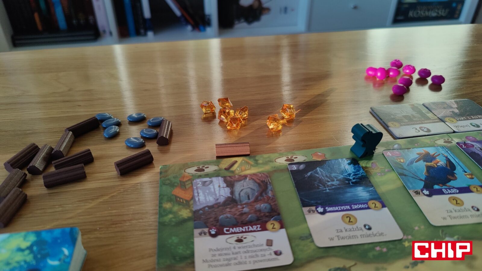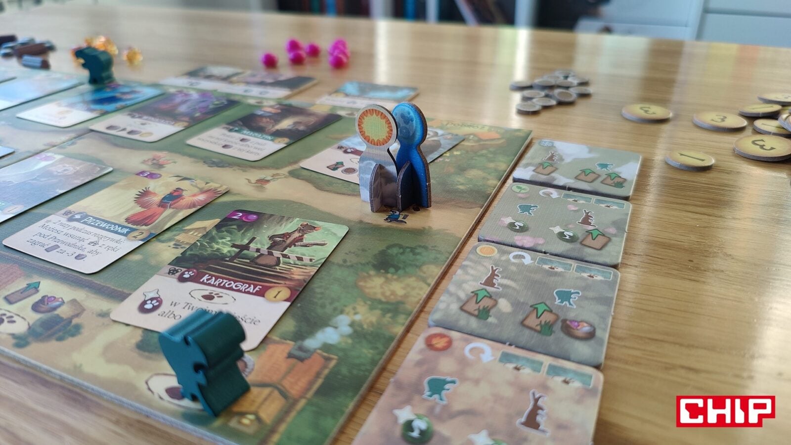 Sam trzon rozgrywki jest znajomy. Stawiasz robotnika, zbierasz gałązki, żywicę, kamyki i jagody, a potem wymieniasz je na budynki i stworzenia podlegające pod pięć różnych “rodzajów”. Różnica polega na tym, jak gra zarządza dostępem do kart oraz ogranicza każdą porę roku. Mamy bowiem dostęp do trzech robotników, a partia kończy się po czterech porach roku. Same karty zagrywamy z dwóch źródeł, bo z ręki lub z pola ogólnodostępnej łąki, o ile karty sąsiadują z przynajmniej jednym znacznikiem Słońca lub Księżyca. Po każdej turze znacznik przesuwa się o jedno pole, więc okna na akcje są bardzo krótkie, a jeden z graczy może “ukarać” drugiego, który zwleka z rozstawieniem robotników.