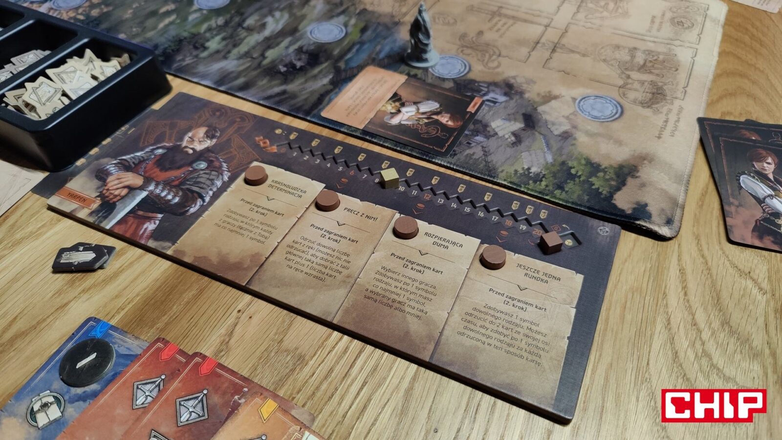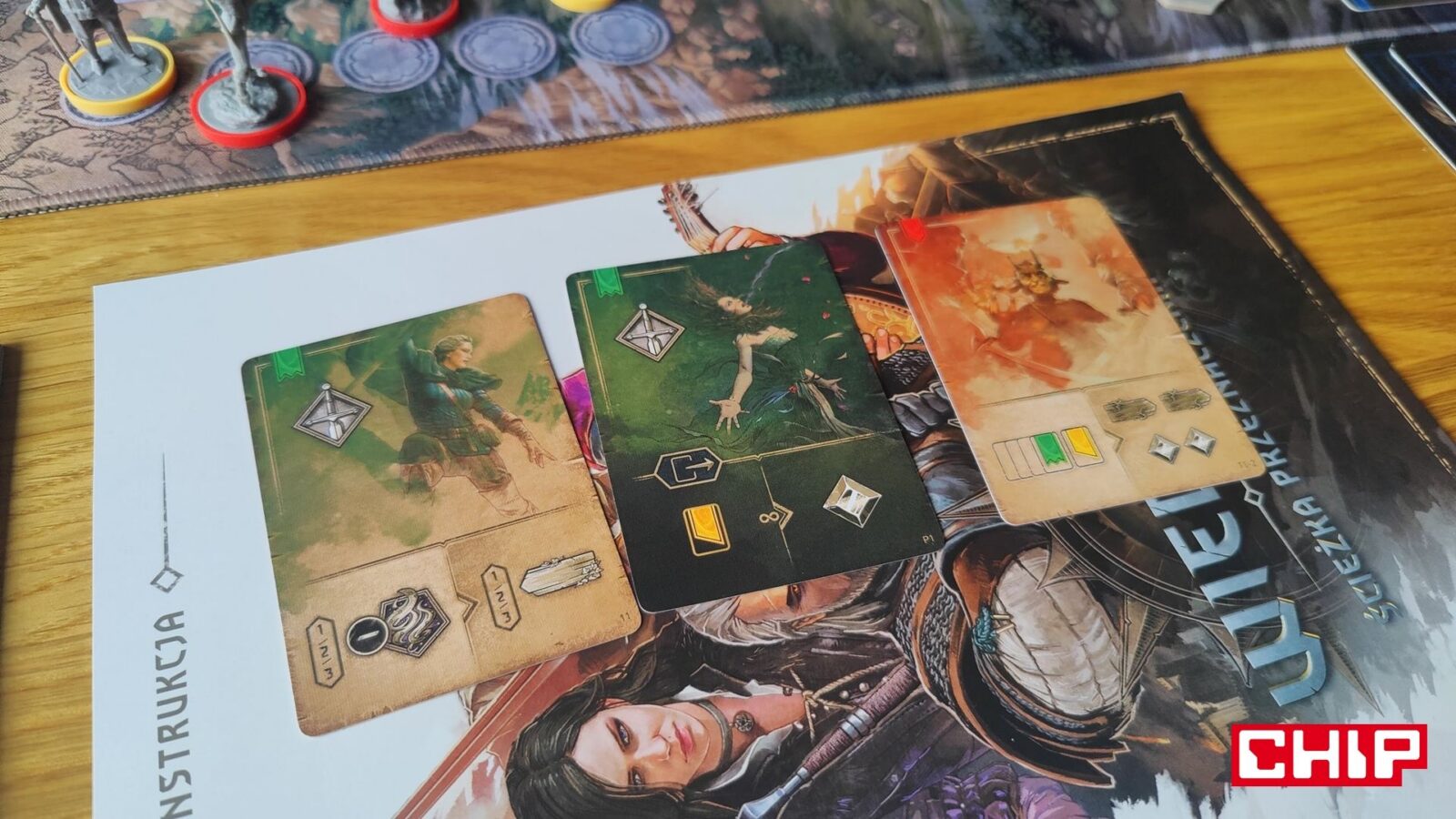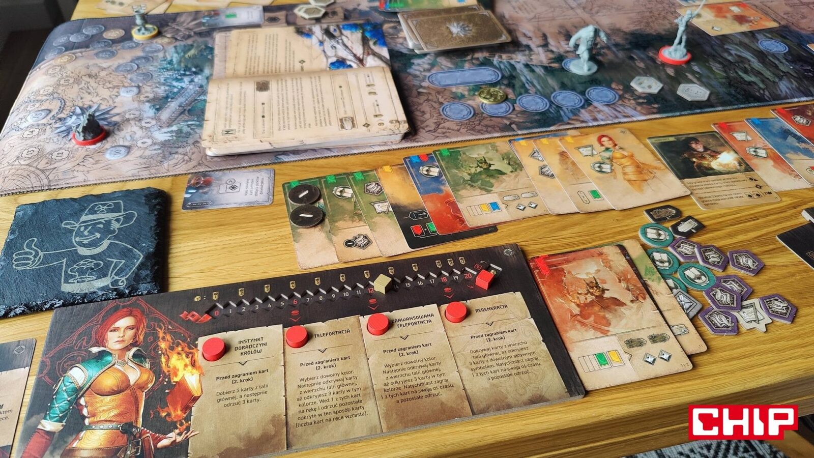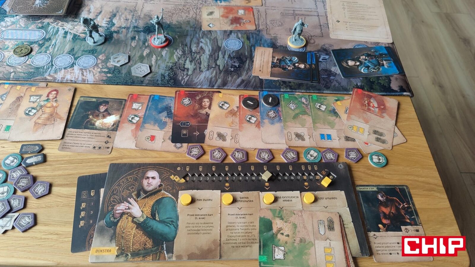 O ile ponowne używanie grafik można przełknąć (zwłaszcza jak nie jesteście tak zaznajomieni z wiedźmińskimi grami), tak samą formę ozdobienia kart akcji już niezbyt. Część z nich rzeczywiście oddaje to, co robi dana karta (czarownica na karcie zapewniającej magię, zwiadowca na tej gwarantującej żeton eksploracji), ale fakt, że w puli kart ogólnodostępnych często znajdują się postaci główne, jest kolejnym dowodem na to, że w szacie graficznej ktoś po prostu poszedł na łatwiznę. Jestem prostym graczem – gram Geraltem, to uważam, że karty-akcje przedstawiające Geralta właśnie powinny być dostępne wyłącznie dla mnie. Gdyby nie była to gra planszowa nastawiona na opowiadanie historii i kreowanie (niby) własnej opowieści, to machnąłbym na to ręką, ale takie coś to w moich oczach po prostu bardzo nieumiejętne pójście na łatwiznę. Nie jest to jednak skala tak wielka, jak w przypadku opowieści.