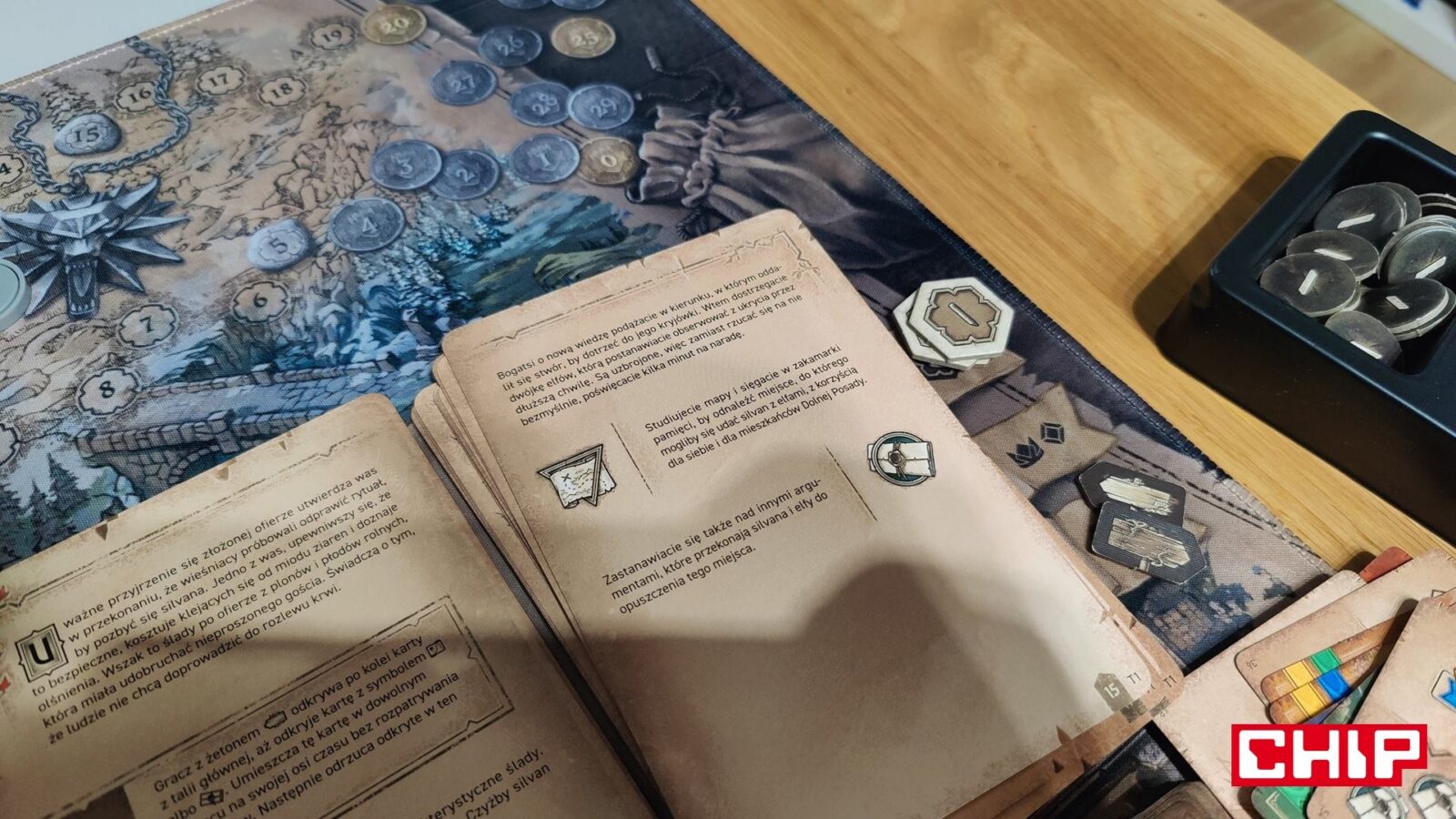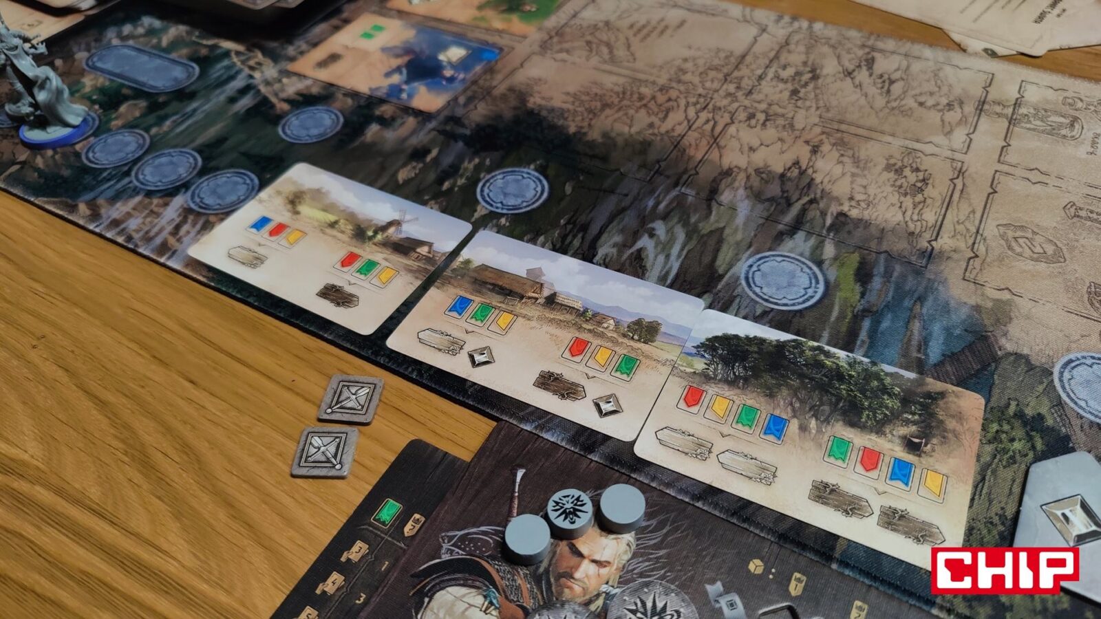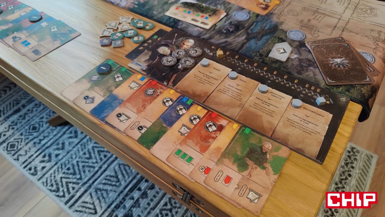 O ile ponowne używanie grafik można przełknąć (zwłaszcza jak nie jesteście tak zaznajomieni z wiedźmińskimi grami), tak samą formę ozdobienia kart akcji już niezbyt. Część z nich rzeczywiście oddaje to, co robi dana karta (czarownica na karcie zapewniającej magię, zwiadowca na tej gwarantującej żeton eksploracji), ale fakt, że w puli kart ogólnodostępnych często znajdują się postaci główne, jest kolejnym dowodem na to, że w szacie graficznej ktoś po prostu poszedł na łatwiznę. Jestem prostym graczem – gram Geraltem, to uważam, że karty-akcje przedstawiające Geralta właśnie powinny być dostępne wyłącznie dla mnie. Gdyby nie była to gra planszowa nastawiona na opowiadanie historii i kreowanie (niby) własnej opowieści, to machnąłbym na to ręką, ale takie coś to w moich oczach po prostu bardzo nieumiejętne pójście na łatwiznę. Nie jest to jednak skala tak wielka, jak w przypadku opowieści.