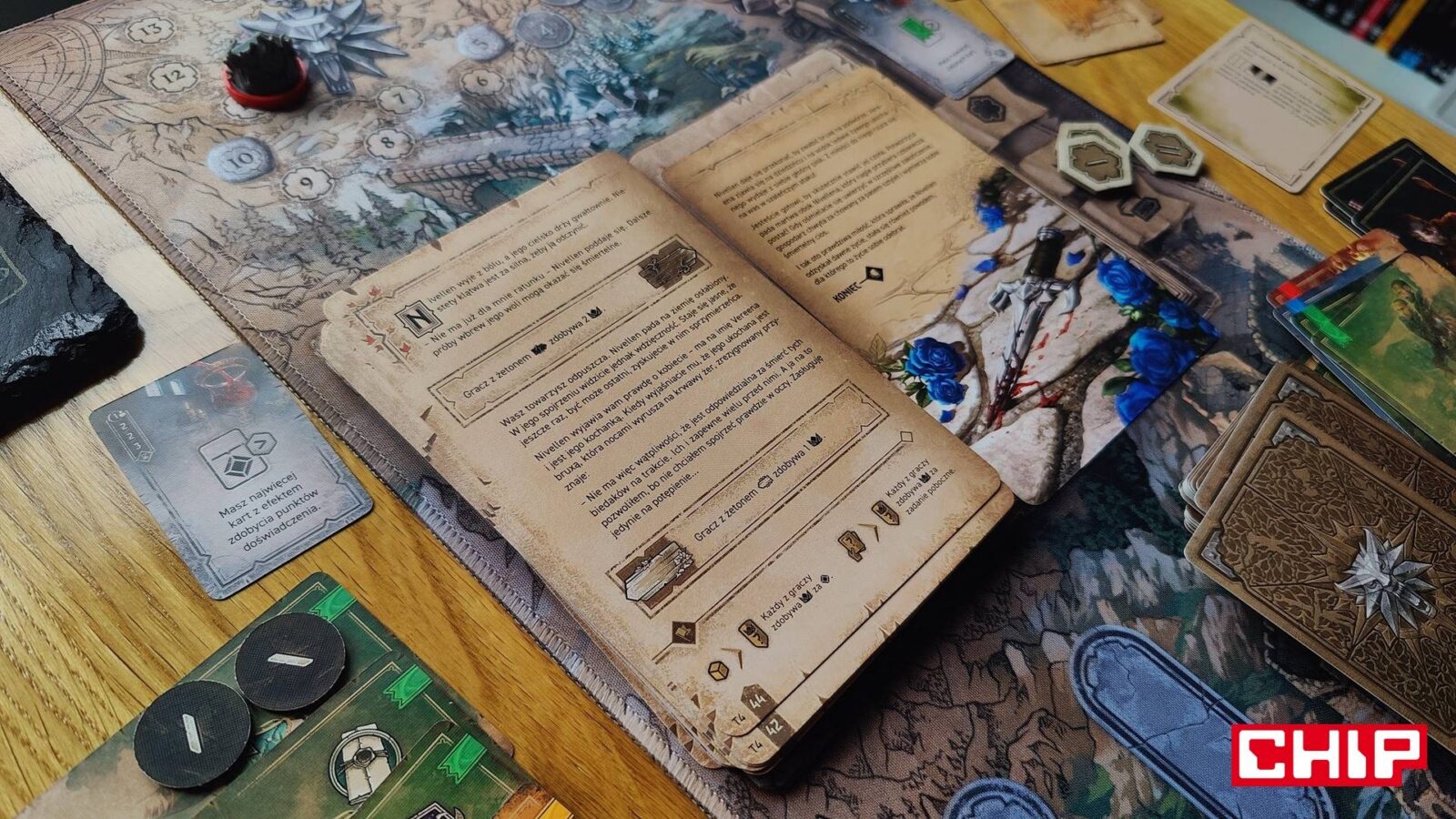Musicie zresztą wiedzieć, że Wiedźmin: Ścieżka Przeznaczenia ma dwa oblicza. Z jednej strony wszyscy gracze opowiadają jedną historię i wpływają na jej przebieg, a z drugiej zdobywają punkty na własne konto, aby pod koniec gry pozwolić nam wskazać zwycięzcę. Pomysł świetny… przynajmniej na papierze, bo w praktyce gracze zawsze będą skupiać się na tym, żeby zebrać możliwie najwięcej punktów, a nie poprowadzić historię tak, jak im serce podpowie. Jeśli zresztą już przy scenariuszach jesteśmy, przejdźmy do mojego największego rozczarowania.