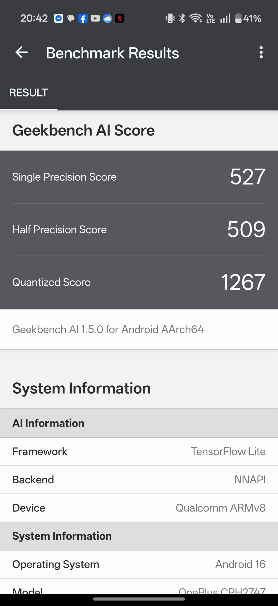 - Geekbench AI NNAPI: 527 / 509 / 1267 pkt