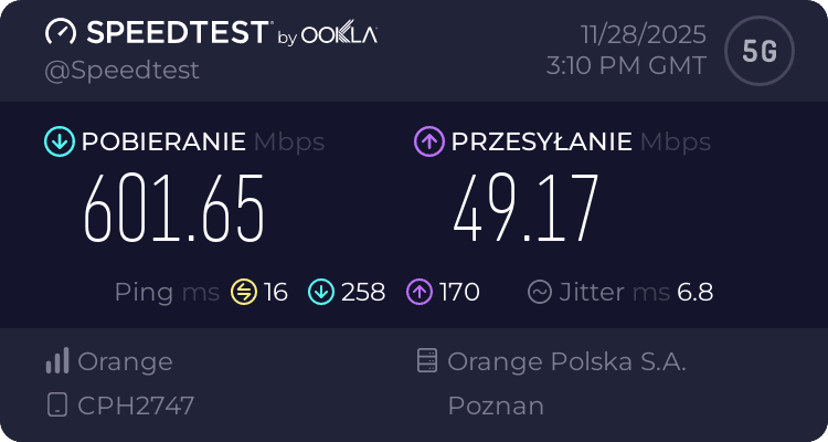 W zasięgu pasma C (3,6 GHz) po ostatnich modernizacjach transfery nierzadko przekraczały 600 Mbps – jak na razie chyba rekordowe wśród testowanych smartfonów, choć zapewne nie tyle wskazujące na rewelacyjne radio OnePlusa 15, co raczej na rozbudowę sieci.