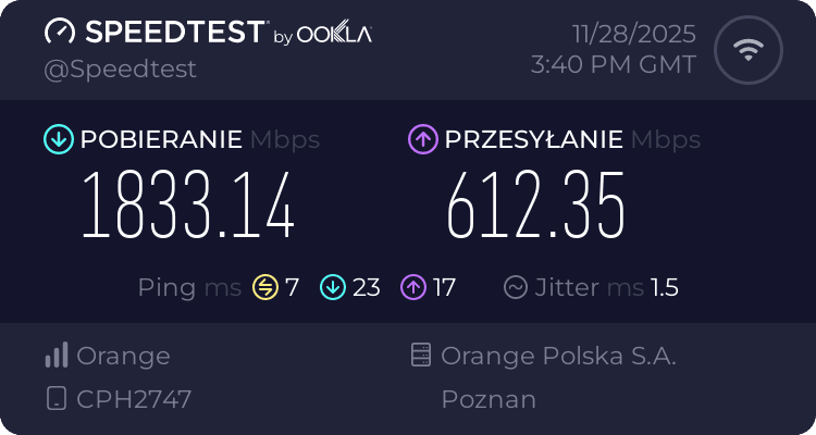 Jeśli chodzi o Wi-Fi, OnePlus chwali się wyspecjalizowanym układem G2 obsługującym standard Wi-Fi 7. Moje domowe Wi-Fi to tylko standard 6E, smartfon zestawiał połączenie w paśmie 6 GHz z prędkością teoretyczną 2402 Mbps, natomiast wyniki należą z pewnością do najlepszych, jakie kiedykolwiek widziałem we współpracy z moim routerem, regularnie bowiem przekraczają 1,8 Gbps