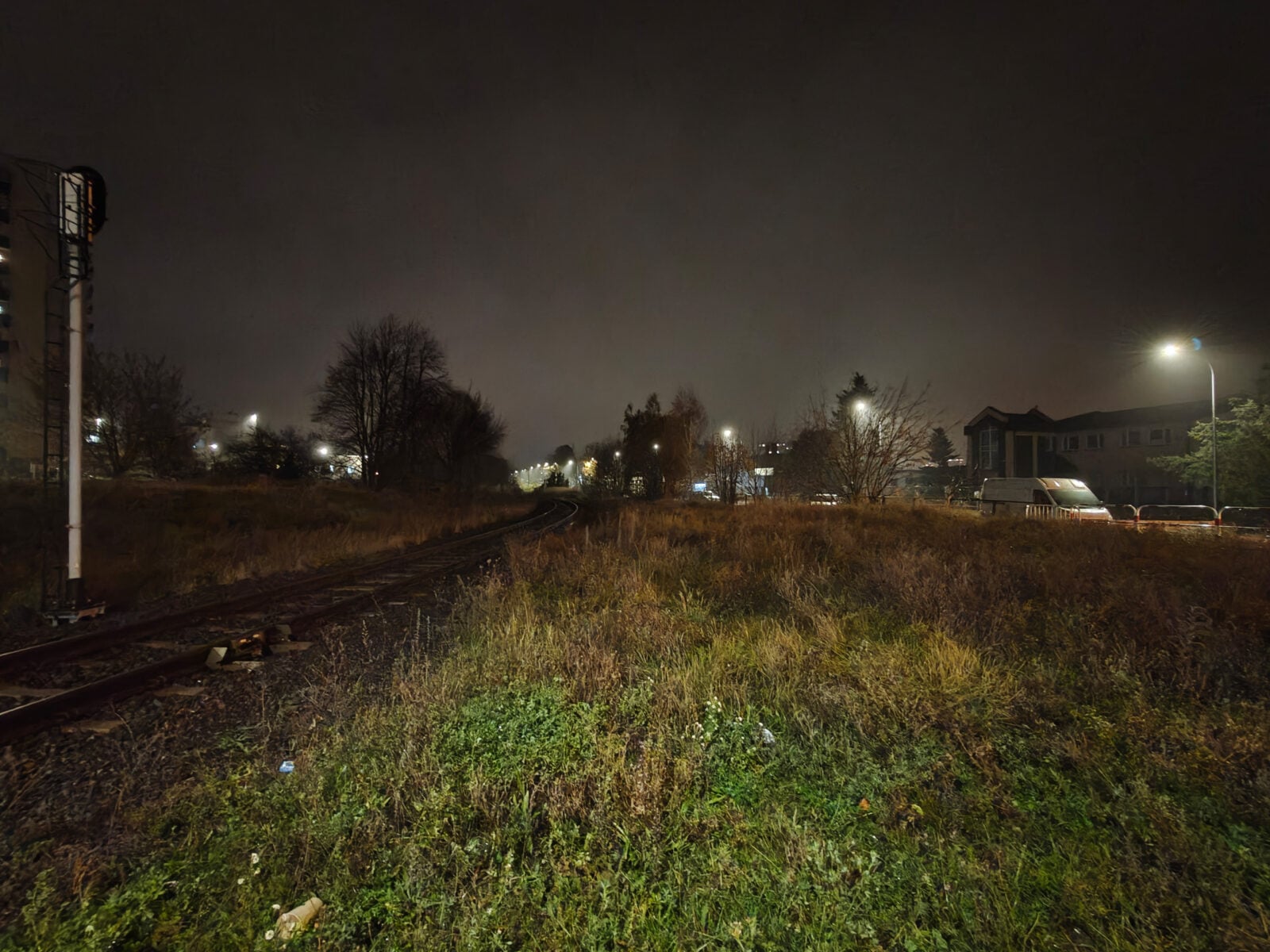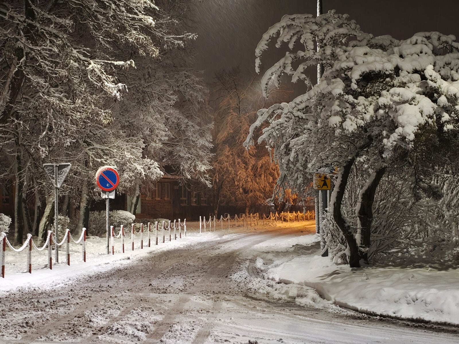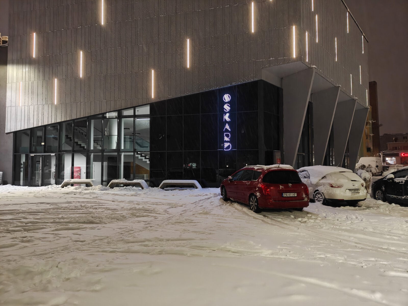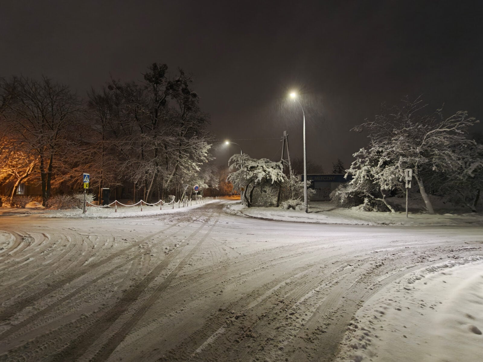 W nocy aparaty niestety spisują się tak sobie, a efekt zależy od ilości dostępnego światła. Aparat UWA zasadniczo jest słaby, produkuje obraz mało szczegółowy i z licznymi artefaktami. Aparat szerokokątny działa zupełnie nieźle, teleobiektyw trochę słabiej, ale wciąż ok. Zbliżeń cyfrowych lepiej jednak nie używać niezależnie od aparatu, choć ujęcia ze śniegiem w kadrze wypadły całkiem znośnie. Rzadko jednak będzie w nocy aż taki nadmiar światła.