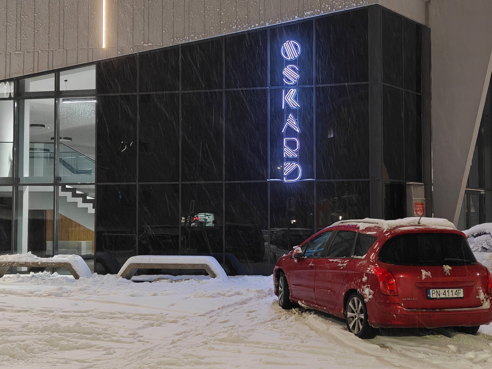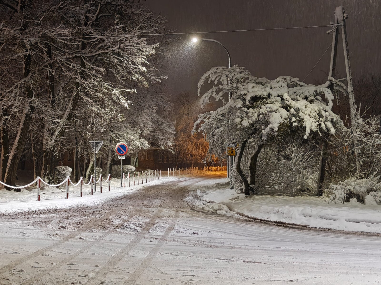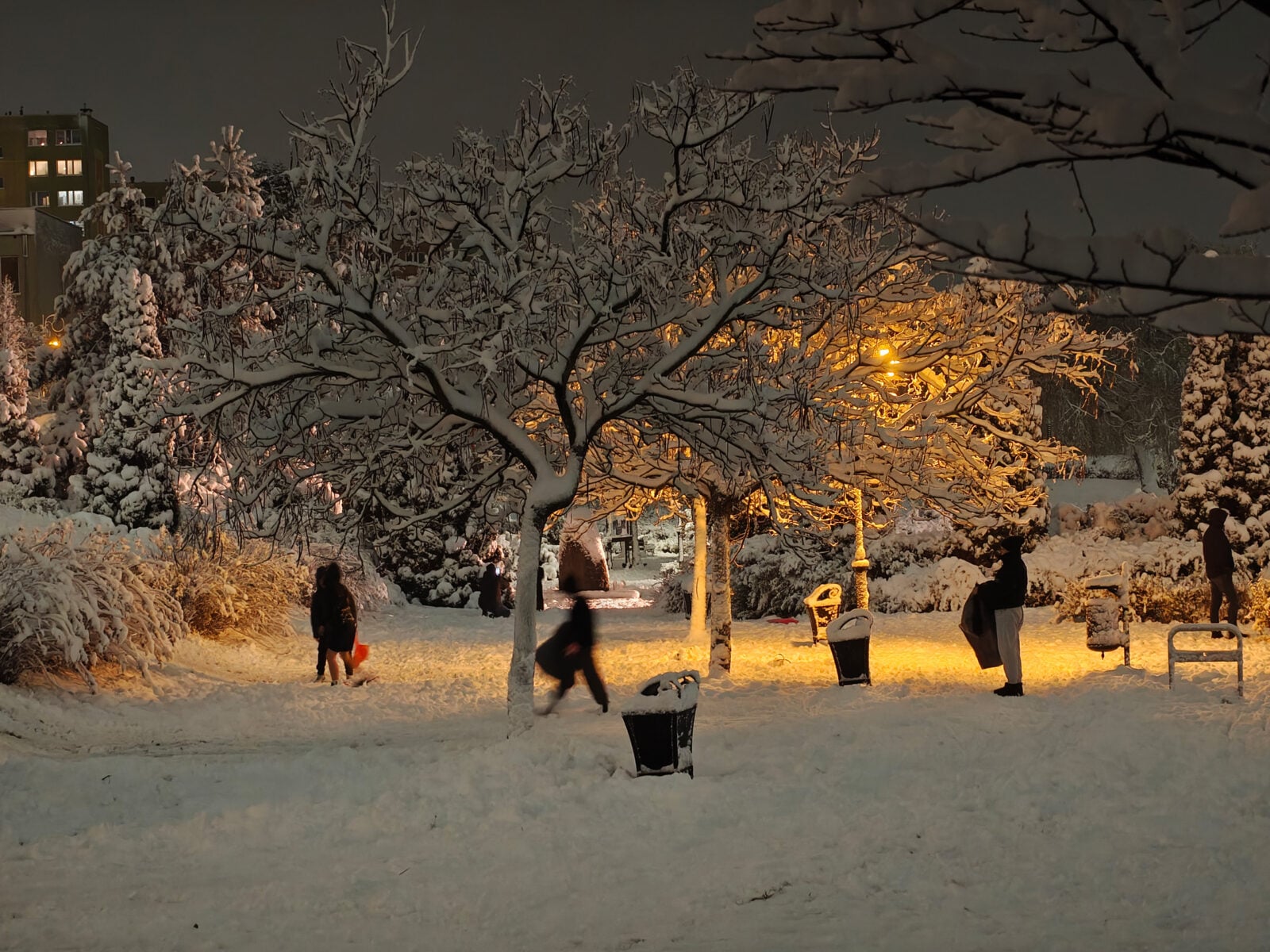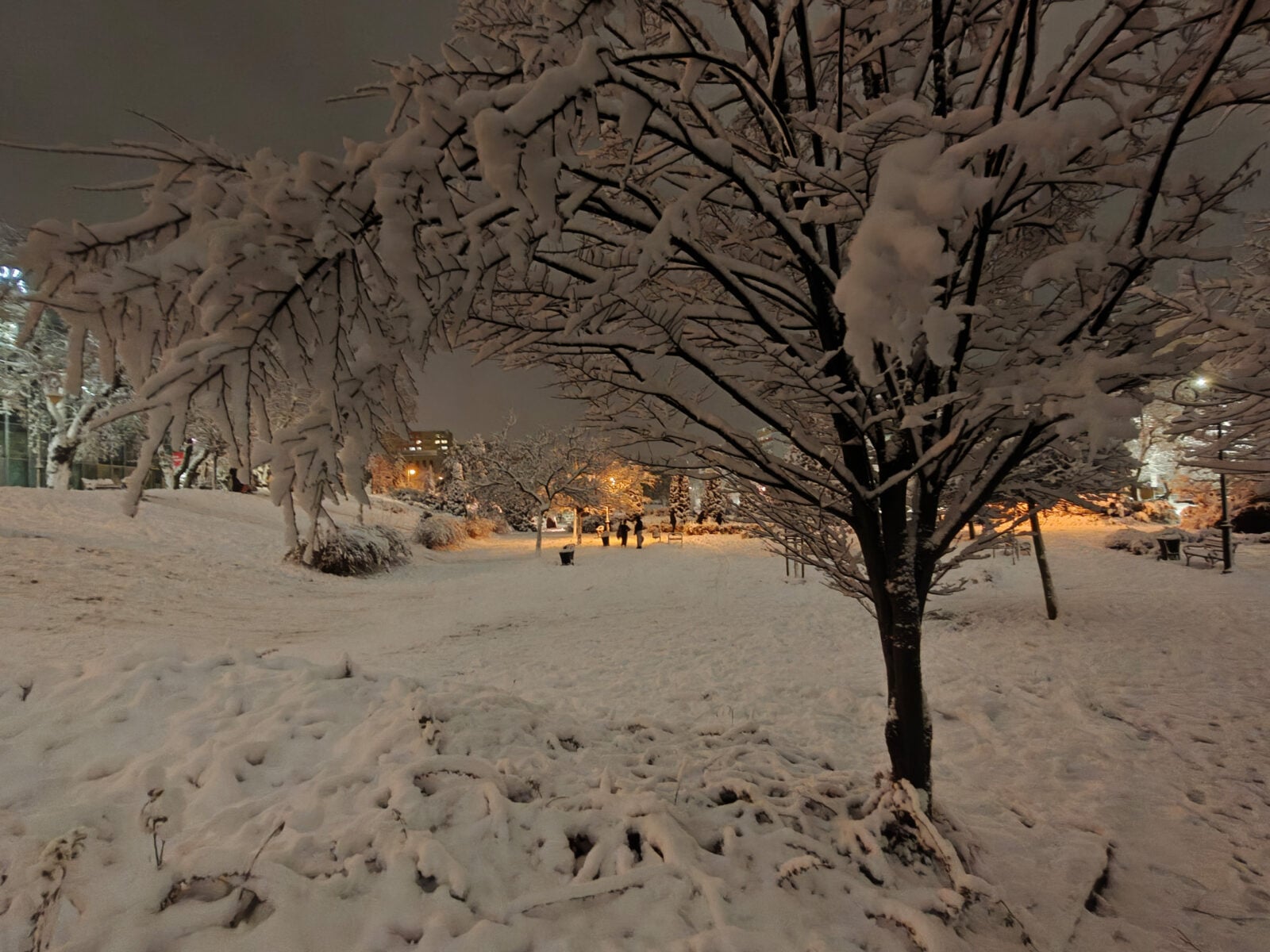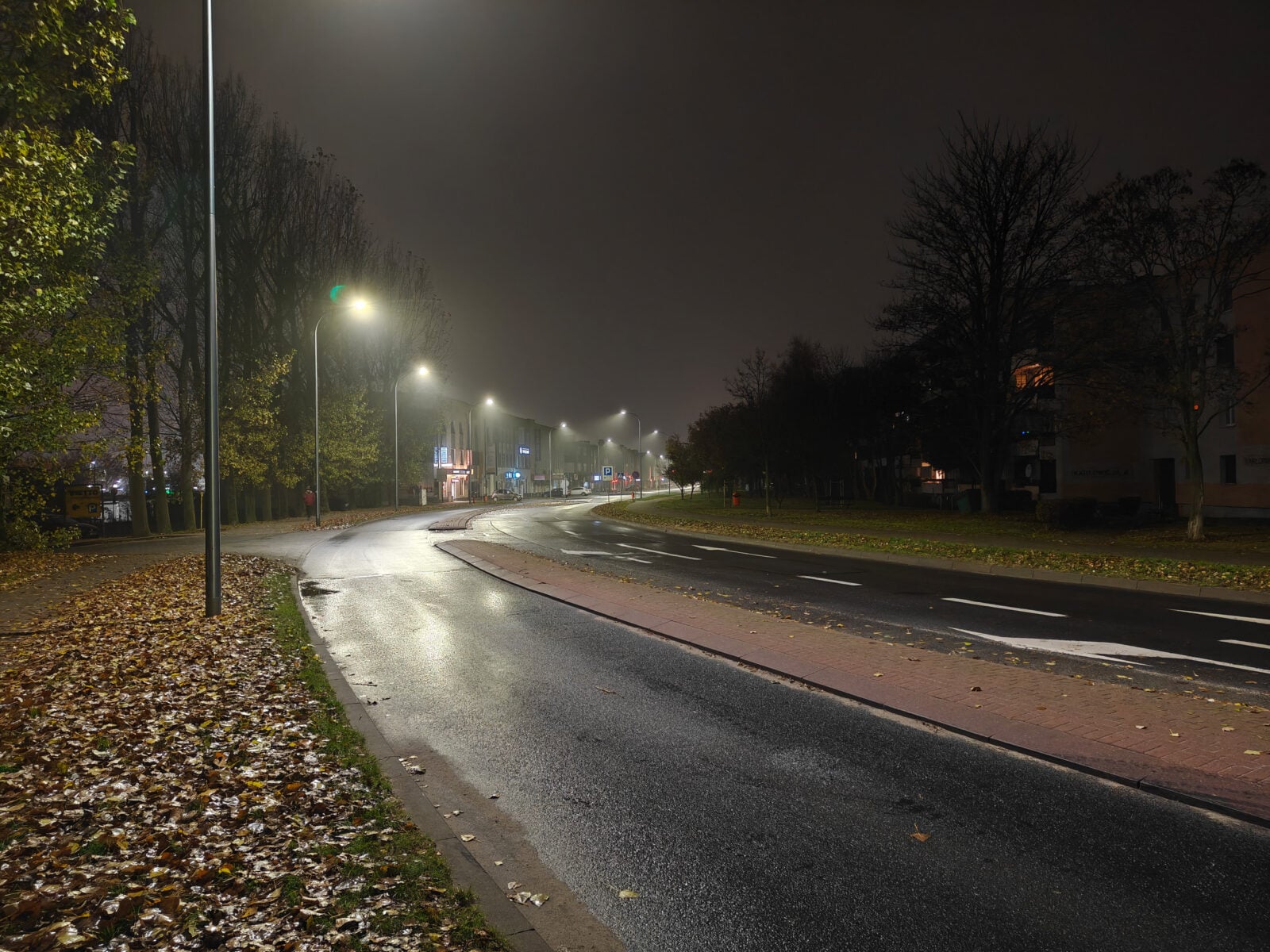 W nocy aparaty niestety spisują się tak sobie, a efekt zależy od ilości dostępnego światła. Aparat UWA zasadniczo jest słaby, produkuje obraz mało szczegółowy i z licznymi artefaktami. Aparat szerokokątny działa zupełnie nieźle, teleobiektyw trochę słabiej, ale wciąż ok. Zbliżeń cyfrowych lepiej jednak nie używać niezależnie od aparatu, choć ujęcia ze śniegiem w kadrze wypadły całkiem znośnie. Rzadko jednak będzie w nocy aż taki nadmiar światła.