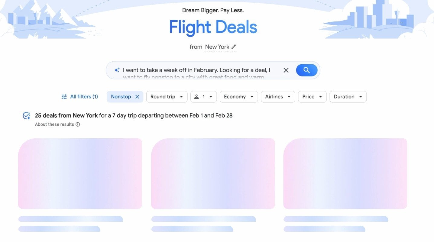 Narzędzie Flight Deals (Oferty Lotnicze), które zadebiutowało w USA, Kanadzie i Indiach, przechodzi teraz globalną ekspansję – trafia do ponad 200 krajów i terytoriów na świecie, w tym do Francji, Niemiec, Japonii i Korei, z obsługą ponad 60 języków. Jak działa? Zamiast szukać miliona kombinacji dat i miejsc, po prostu opisujesz AI w naturalny sposób, gdzie, kiedy i jak chcesz podróżować. Możesz być elastyczny, na przykład: „Chcę wziąć tydzień wolnego w lutym i szukam taniego lotu bez przesiadek do ciepłego miasta z dobrym jedzeniem”. AI analizuje Twoje preferencje i generuje najlepsze okazje cenowe dostępne w Google Flights.