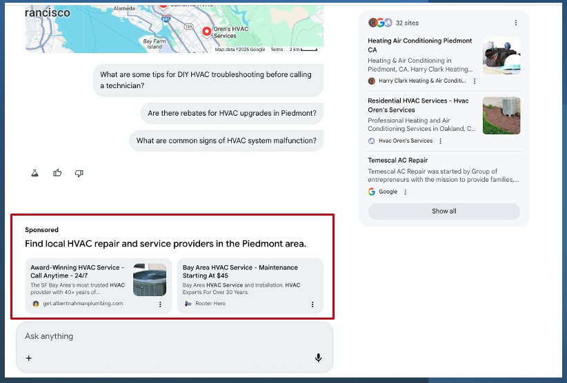 Pierwsi użytkownicy zauważyli już reklamy w trybie AI. Użytkownik X, Greg Sterling, zgłosił, że zobaczył reklamy lokalnych usług naprawczych. Inny użytkownik, Brodie Clark, był w stanie powtórzyć to zjawisko, również w przypadku zapytań dotyczących usług. To, co jest kluczowe w tym wdrożeniu, to pozycja i format reklam, które różnią się od tradycyjnych wyników wyszukiwania: