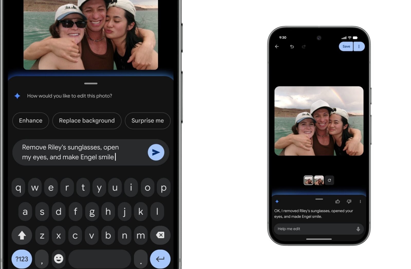 Największa rewolucja dotyczy edycji zdjęć. Model Nano Banana umożliwia teraz dokonywanie spersonalizowanych poprawek za pomocą prostych poleceń głosowych lub tekstowych. Wystarczy stuknąć w opcję „Pomóż mi edytować” w edytorze Zdjęć Google, a następnie wydać bardzo konkretne i złożone polecenia, które do tej pory wymagały skomplikowanej pracy w profesjonalnych programach. Przykłady?