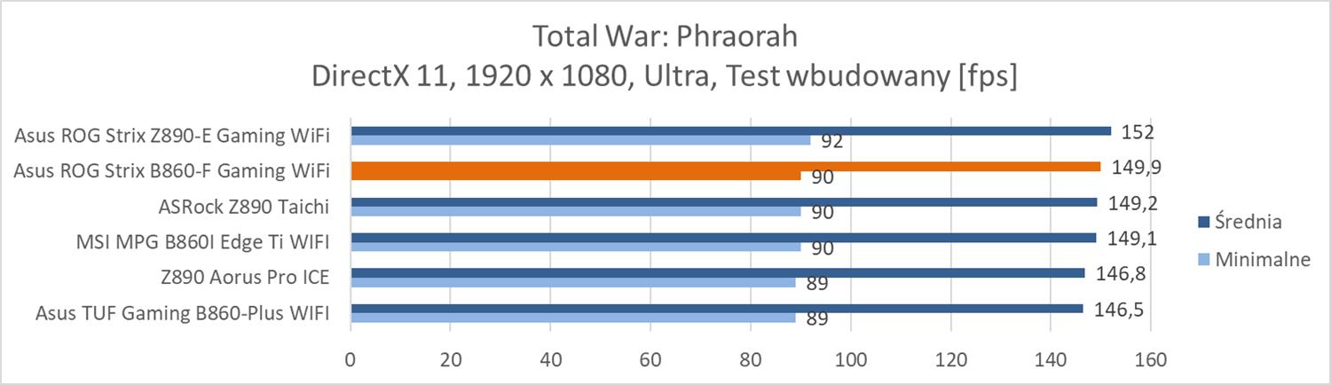 Na koniec przeprowadziłem testy w trzech grach: Total War: Phraorah, Assassin’s Creed Mirage oraz Far Cry 6. Testy wykonałem w rozdzielczości 1920 x 1080 px przy najwyższych ustawieniach. Wyłączyłem tylko ray tracing oraz DLSS/FSR, jeśli dana gra miała takie opcje. Testy przeprowadziłem przy wykorzystaniu wbudowanych w gry benchmarków. W przypadku Total War był to benchmark battle.
