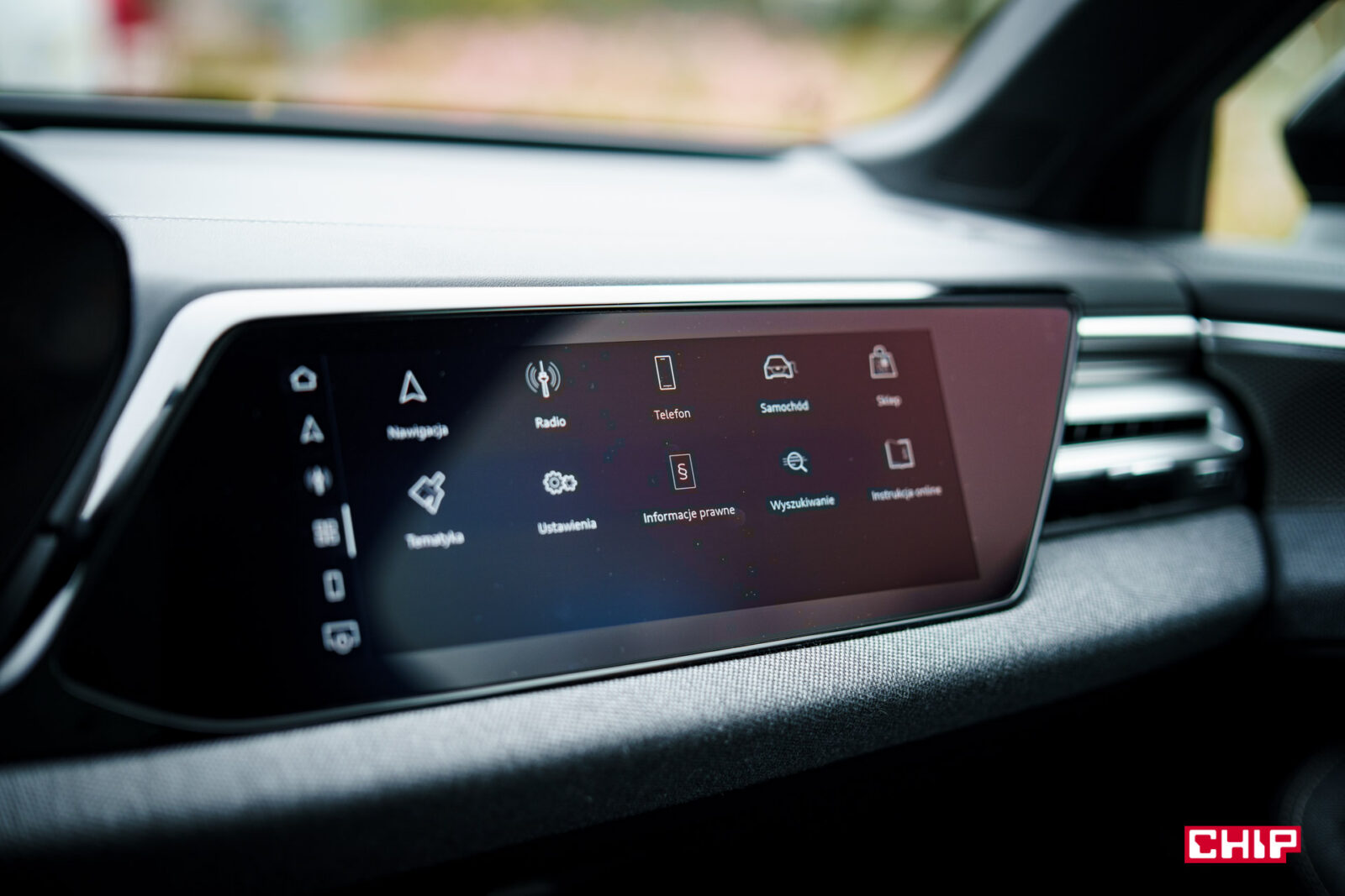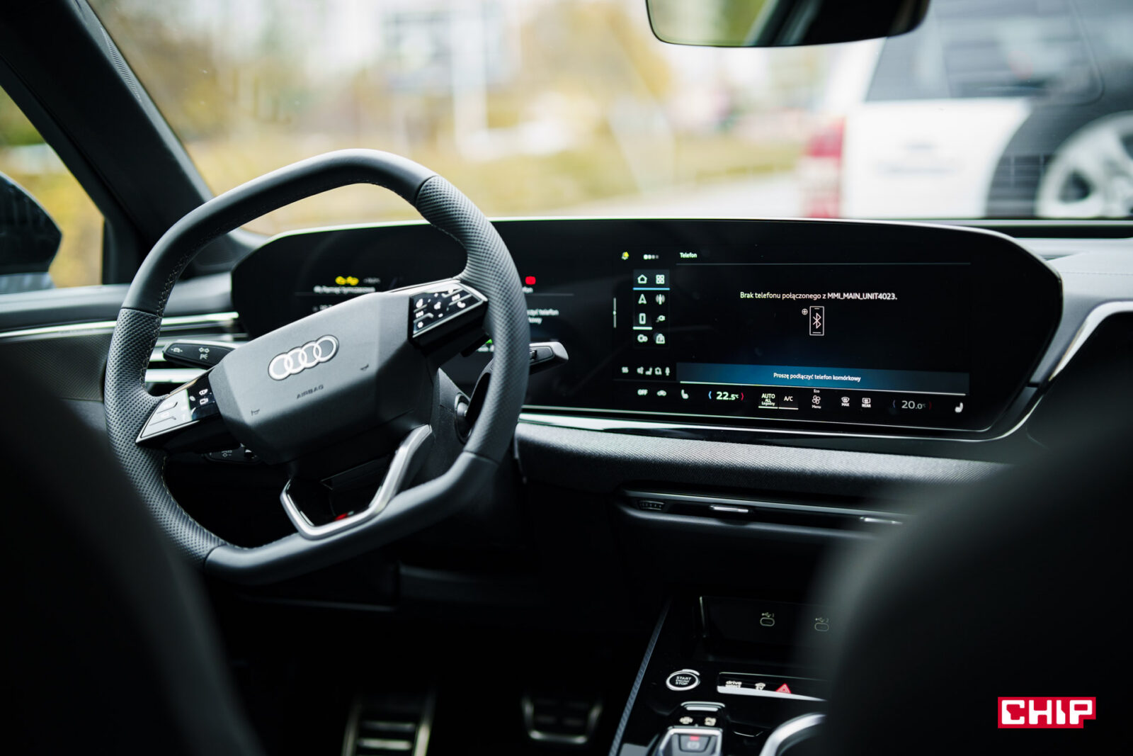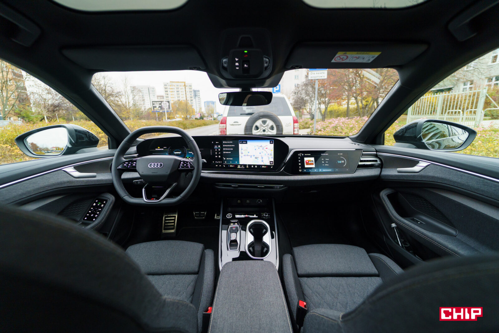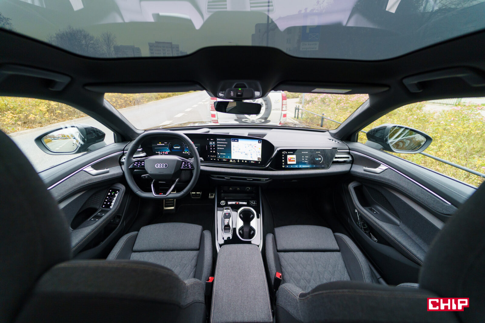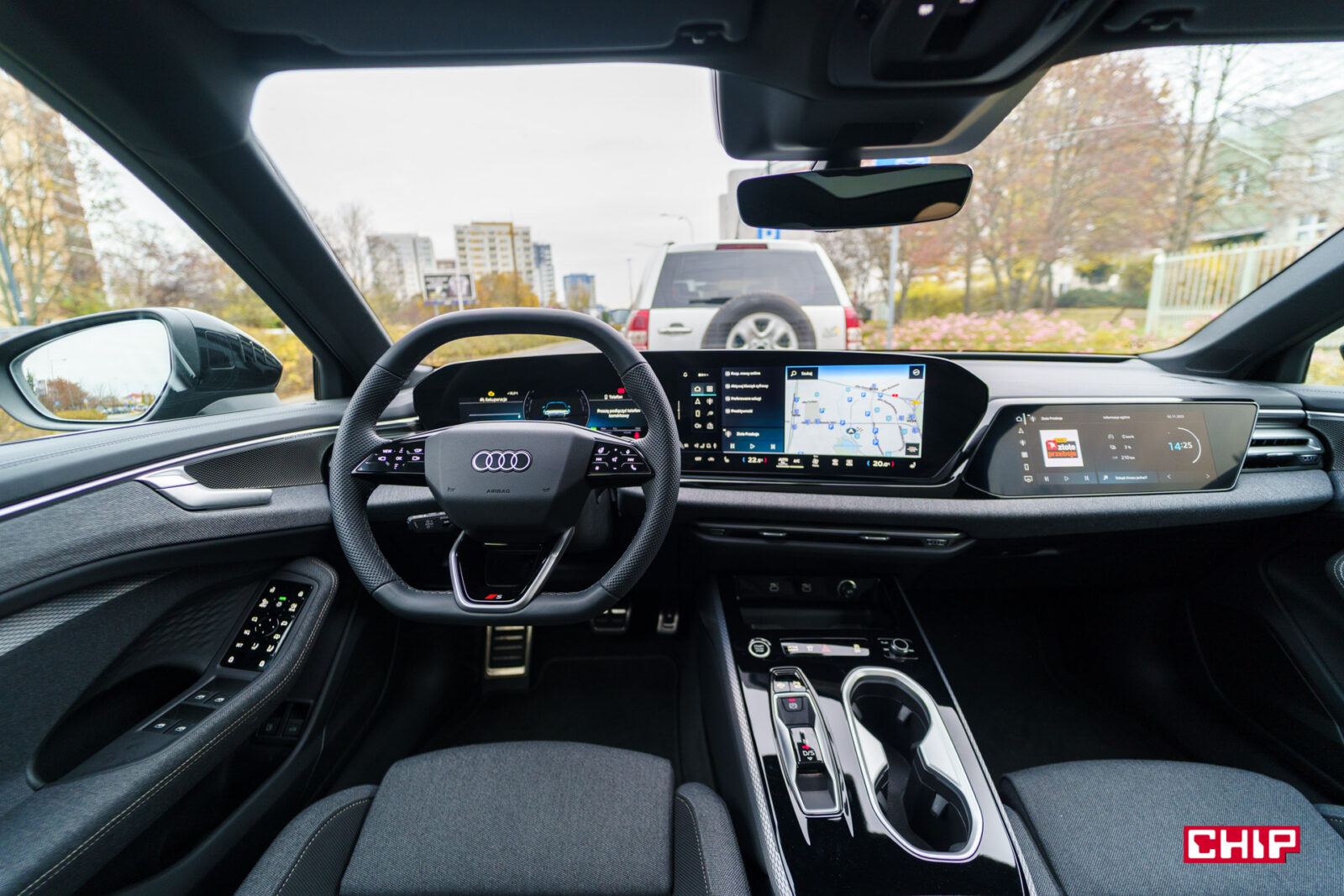Ekran kierowcy ma przekątną 11,9 cala i jak wspominałem przy okazji testów innych modeli Audi, trochę brakuje w nim większej liczby widoków. Dostępny jest bardzo minimalistyczny, mocno cyfrowy, co może nie każdemu przypaść do gustu. Mieści sporo informacji, jest bardzo czytelny, ale przydałoby się móc zmienić w nim coś więcej. Nad ekranem kierowcy możemy mieć duży, bardzo czytelny head-up wyświetlający wiele przydatnych informacji na temat m.in. przebiegu trasy.