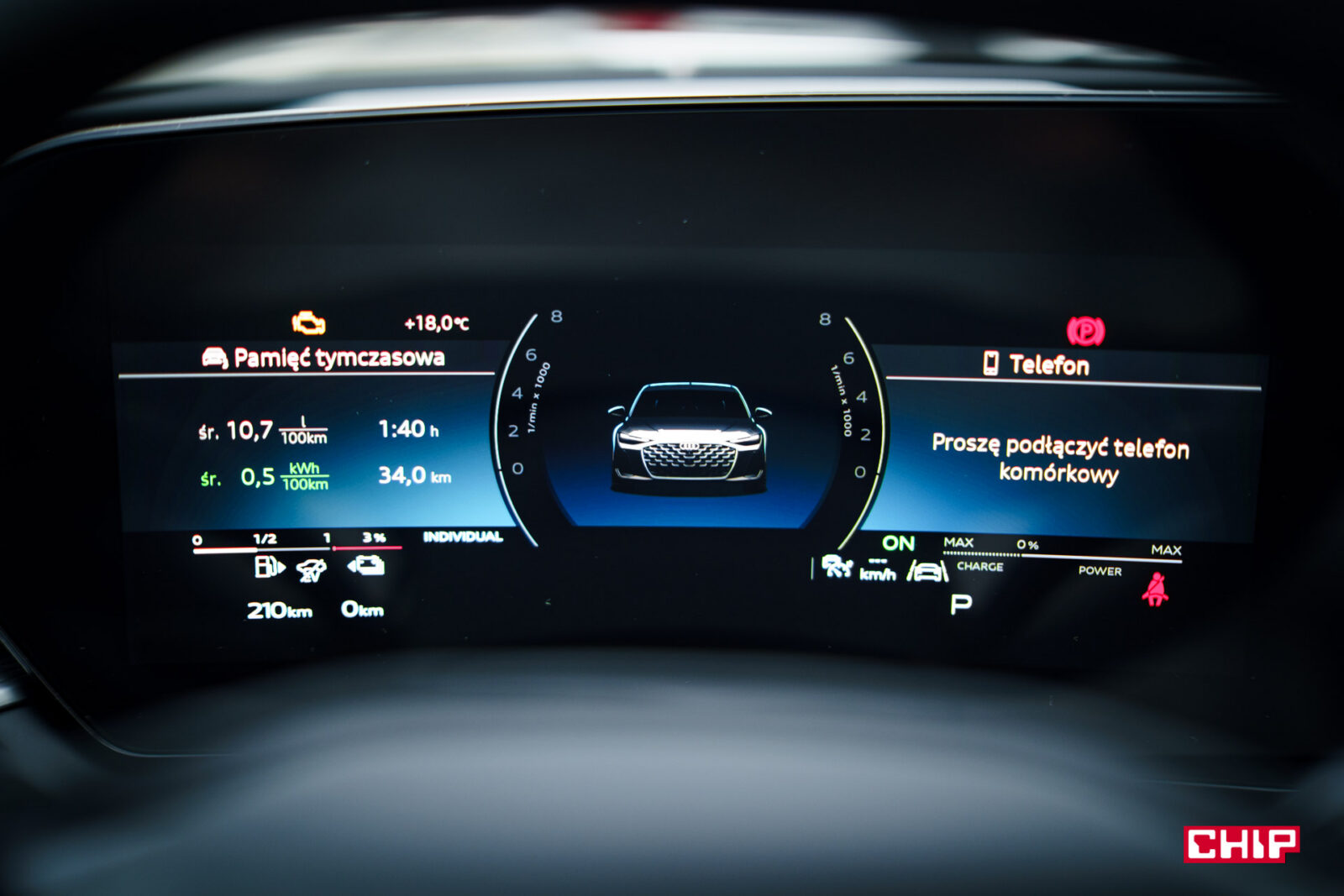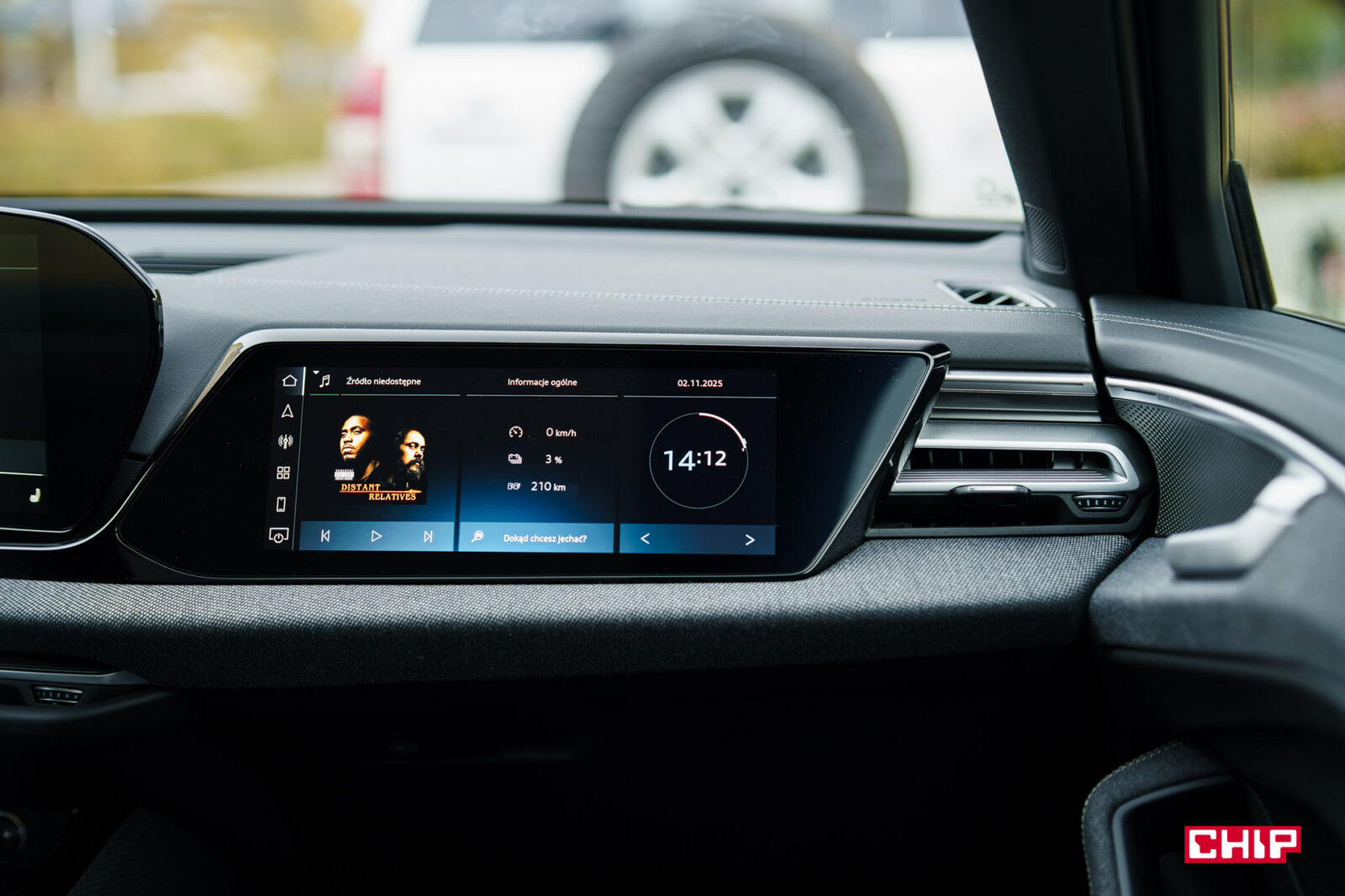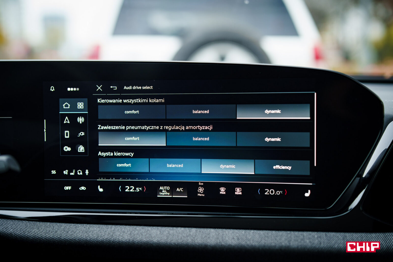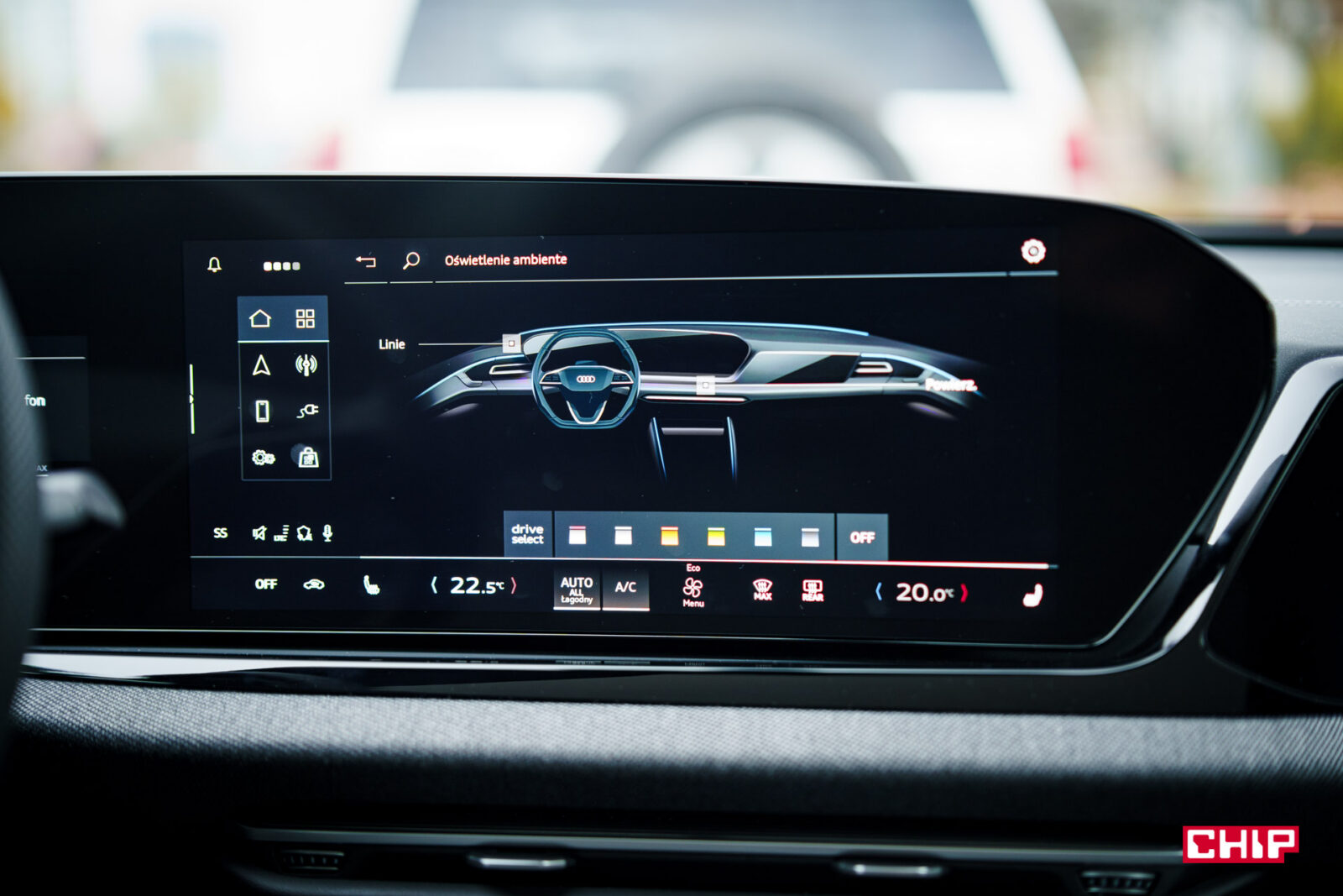 Ekran kierowcy ma przekątną 11,9 cala i jak wspominałem przy okazji testów innych modeli Audi, trochę brakuje w nim większej liczby widoków. Dostępny jest bardzo minimalistyczny, mocno cyfrowy, co może nie każdemu przypaść do gustu. Mieści sporo informacji, jest bardzo czytelny, ale przydałoby się móc zmienić w nim coś więcej. Nad ekranem kierowcy możemy mieć duży, bardzo czytelny head-up wyświetlający wiele przydatnych informacji na temat m.in. przebiegu trasy.