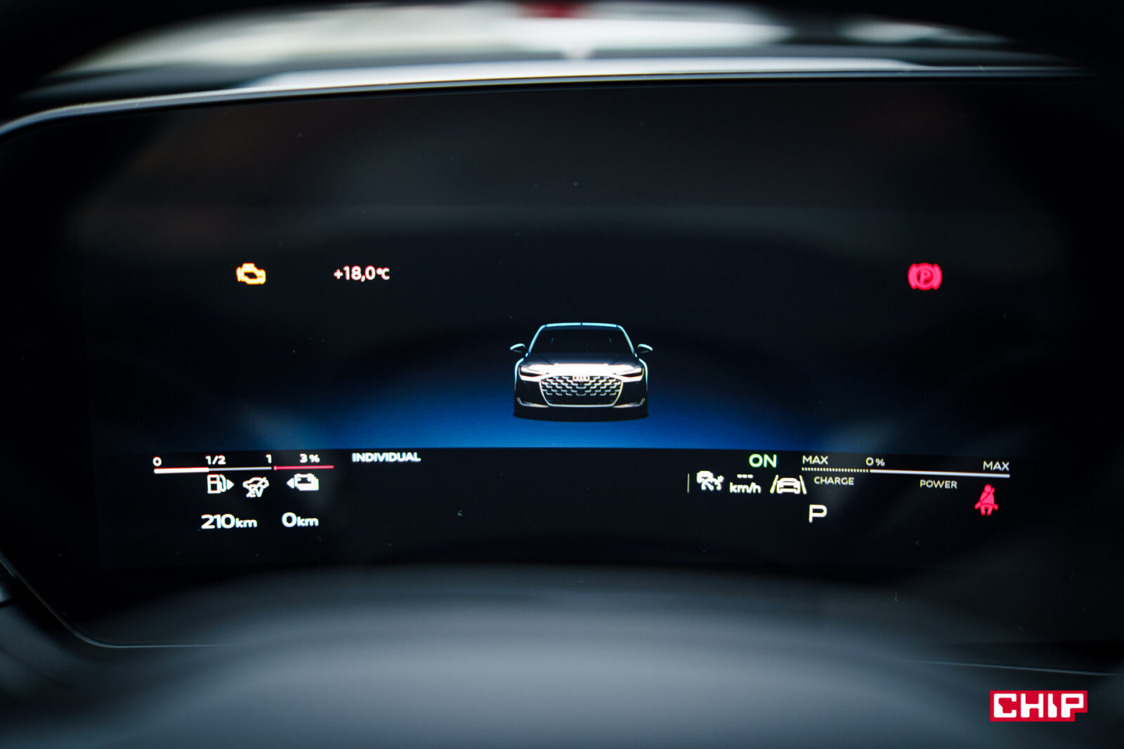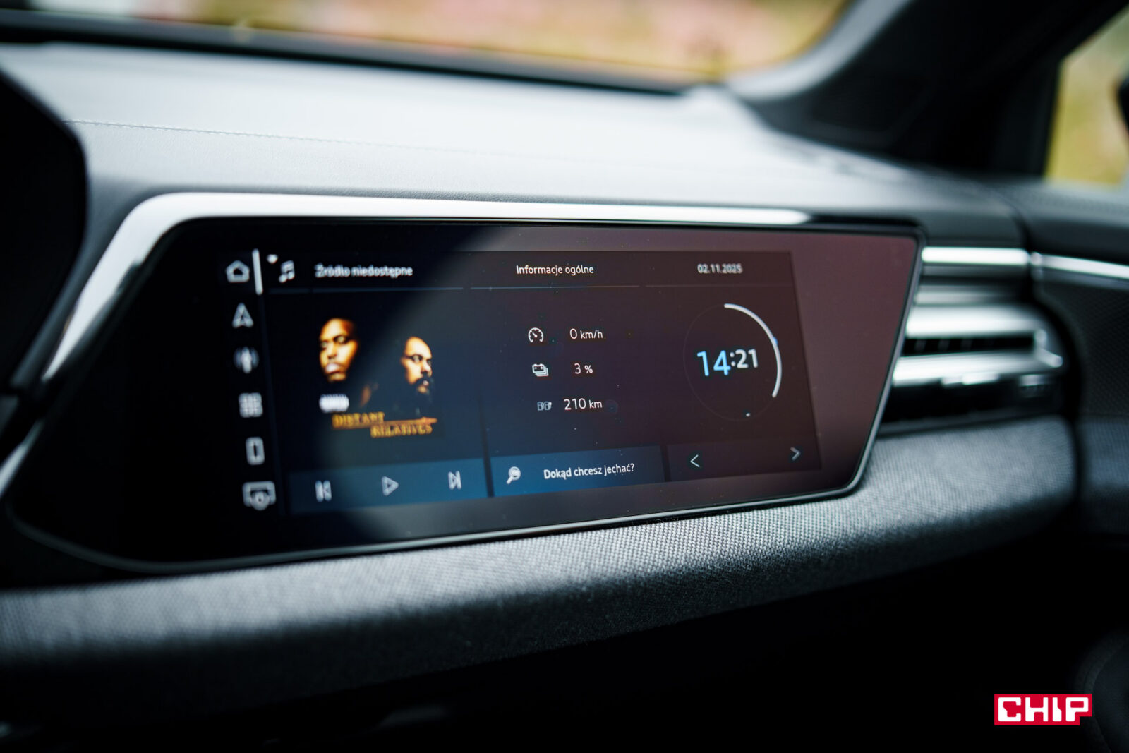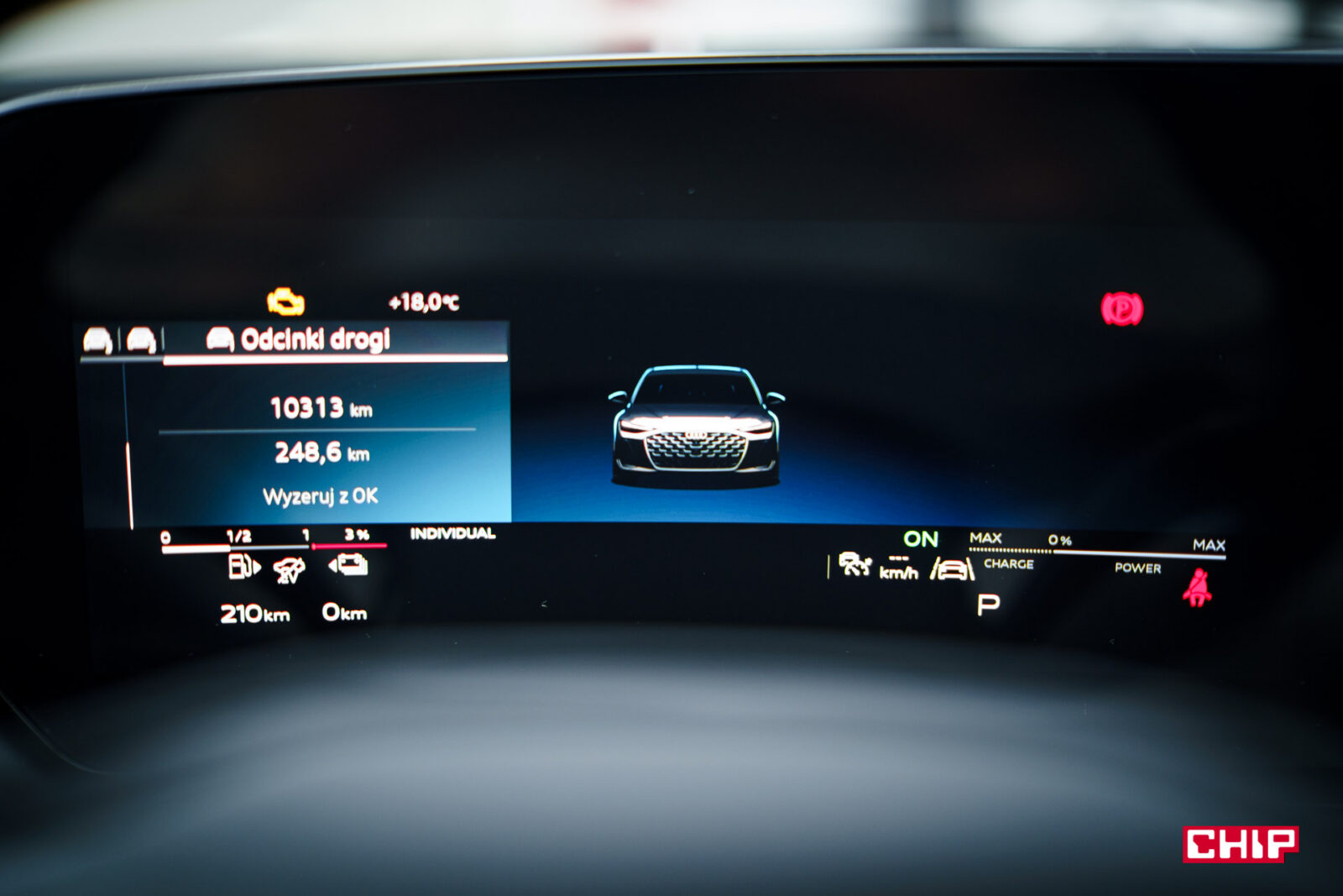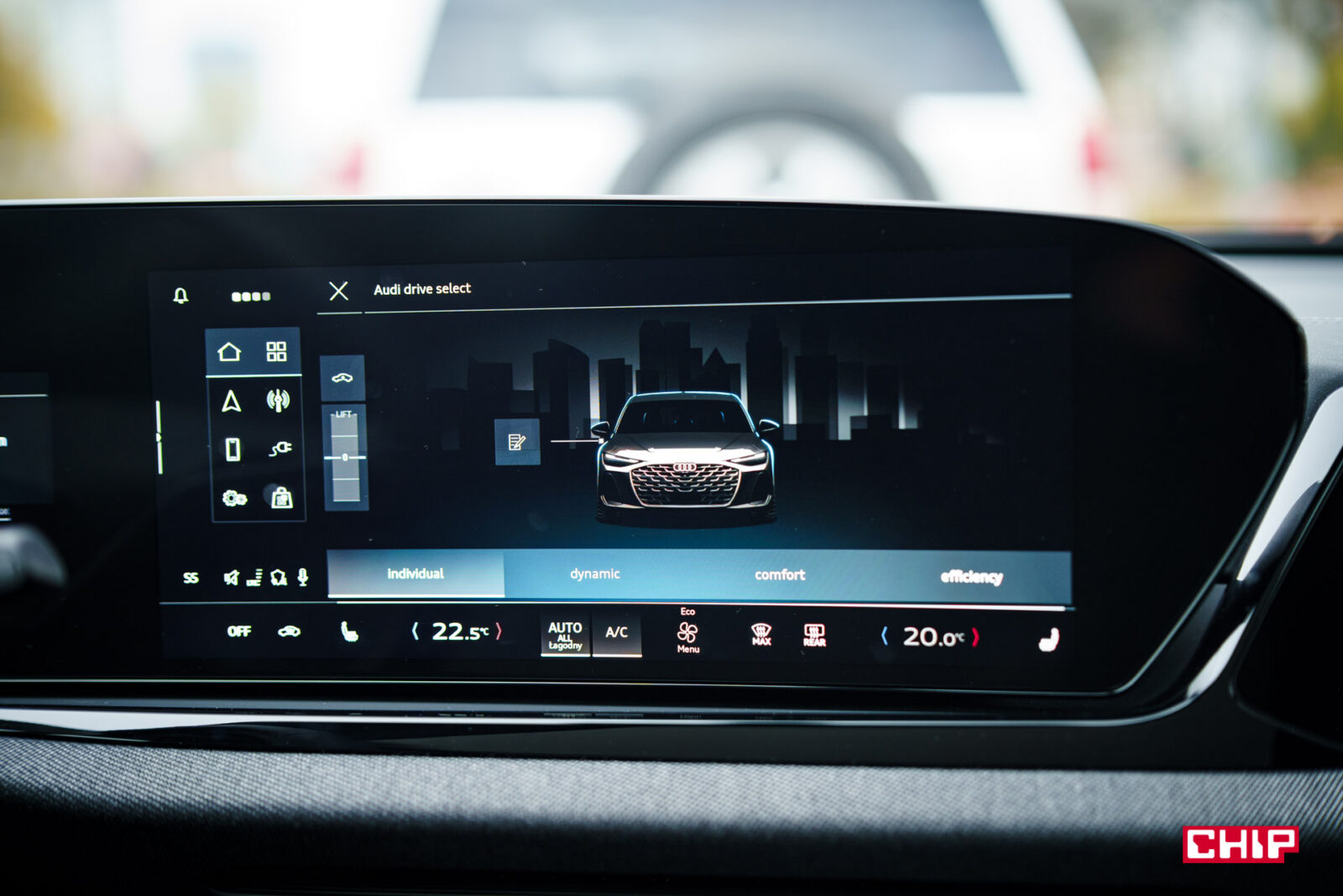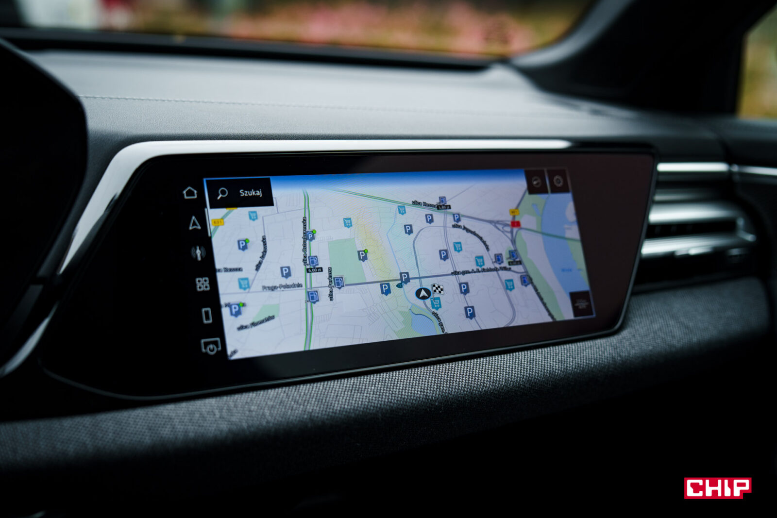 Ekran kierowcy ma przekątną 11,9 cala i jak wspominałem przy okazji testów innych modeli Audi, trochę brakuje w nim większej liczby widoków. Dostępny jest bardzo minimalistyczny, mocno cyfrowy, co może nie każdemu przypaść do gustu. Mieści sporo informacji, jest bardzo czytelny, ale przydałoby się móc zmienić w nim coś więcej. Nad ekranem kierowcy możemy mieć duży, bardzo czytelny head-up wyświetlający wiele przydatnych informacji na temat m.in. przebiegu trasy.