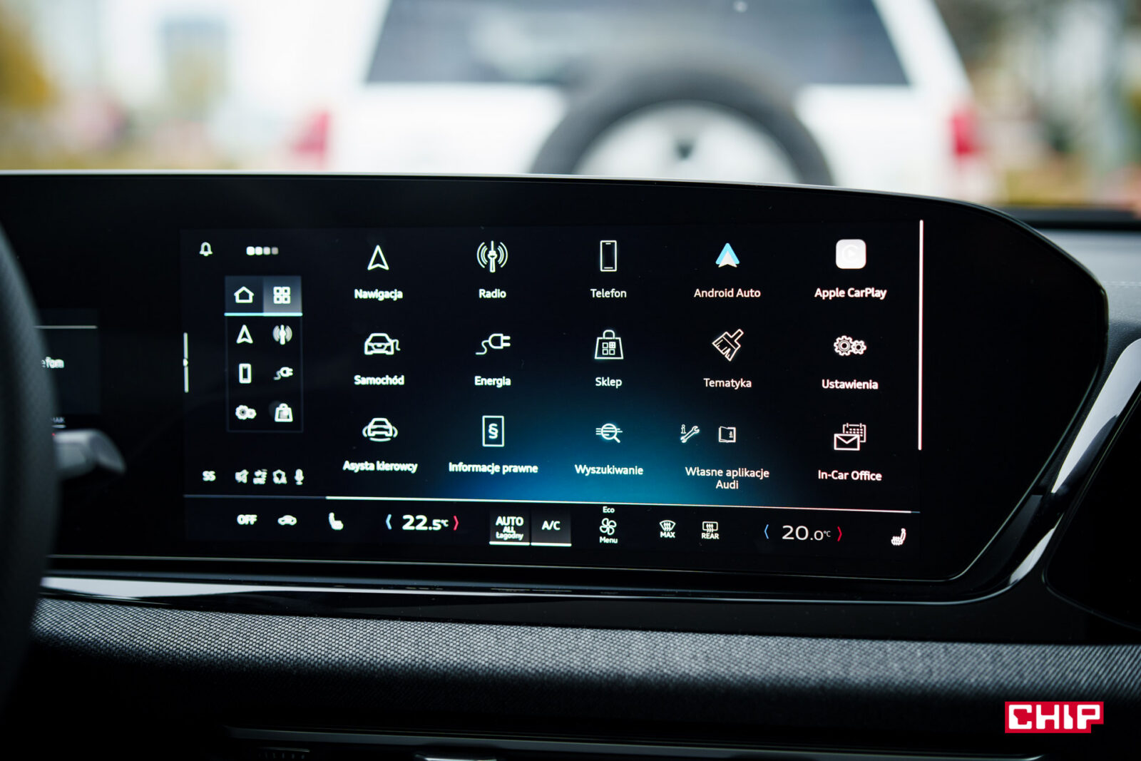 Interfejs jest bardzo minimalistyczny, ale pozostaje czytelny, a dostępne opcje są intuicyjnie rozmieszczone. W razie potrzeby są też dostępne dodatkowe, choć na ogół płatne, motywy. Obsługa jest niemal w całości dotykowa, wliczając w to sterowanie klimatyzacją. Co zawsze jest minusem, choć na pocieszenie jest fakt, że panel sterowanie temperaturą jest zawsze widoczny u dołu ekranu, nawet podczas korzystania z interfejsu Android Auto i Apple CarPlay, które działają bezproblemowo i bezprzewodowo.
