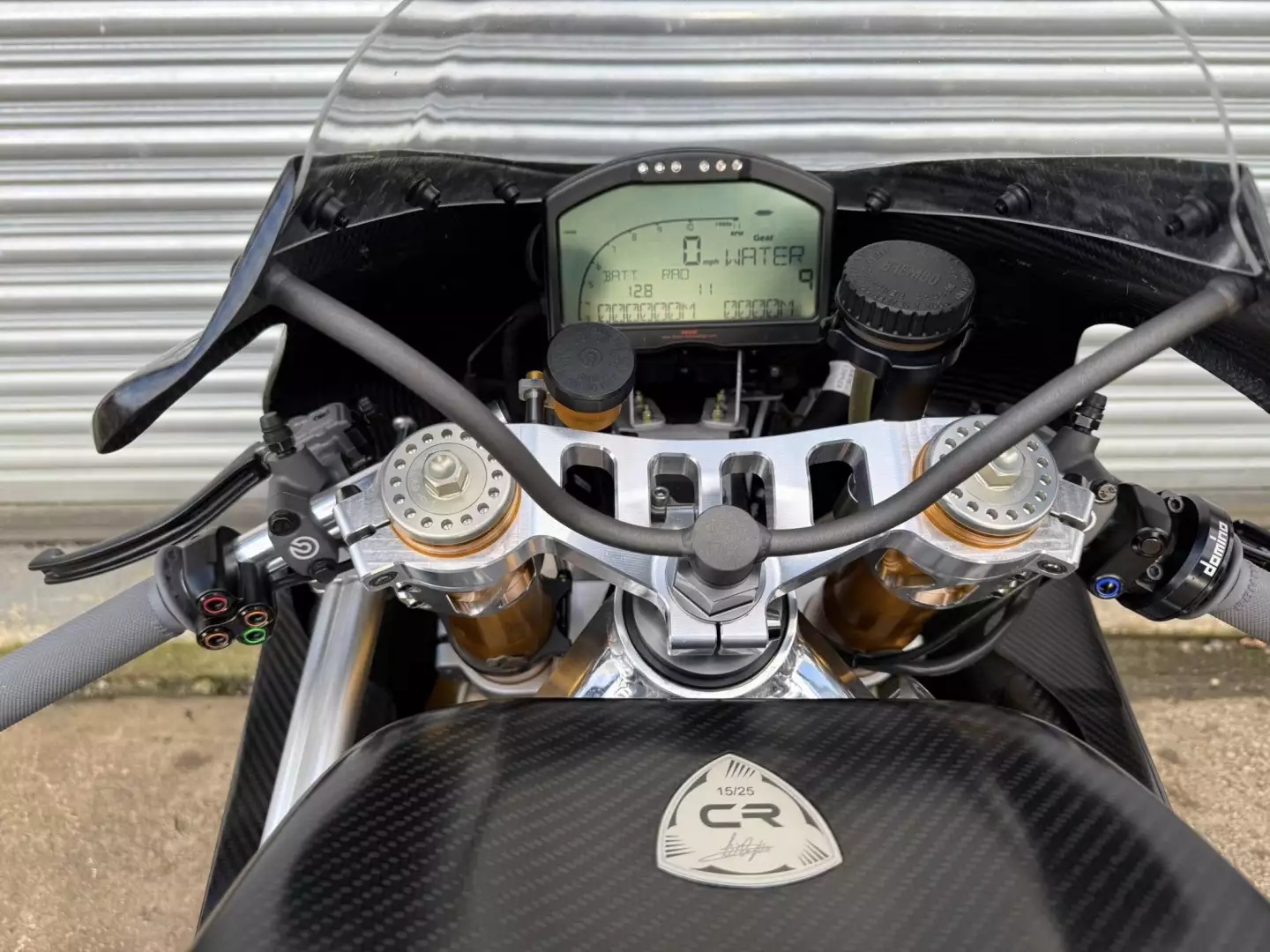 Rama i liczne elementy poszycia zostały wykonane z włókna węglowego, co znacząco obniża wagę i nadaje agresywny wygląd. Aluminiowy wahacz tylny z pojedynczym amortyzatorem zapewnia z kolei precyzyjne dostrojenie zawieszenia do warunków panujących na torze. Wszystko to składa się na obraz maszyny stworzonej wyłącznie do ścigania się, a nie do rekreacyjnej jazdy.