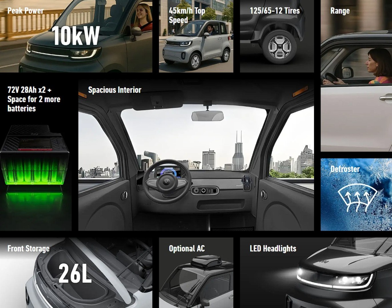 NIUMM został wyposażony w proste 12-calowe koła z oponami 125/65, krótką maskę poprawiającą widoczność oraz pojedynczą wycieraczkę. Jego bagażnik przedni oferuje 26 litrów przestrzeni, co powinno wystarczyć na podstawowe zakupy lub niewielką torbę sportową, a reflektory LED i paski świetlne dopełniają charakterystycznego wyglądu całej konstrukcji. Producent przewidział integrację z aplikacją mobilną oferującą śledzenie GPS i funkcje antykradzieżowe. W opcji dostępne są dodatki takie jak klimatyzacja, szyberdach czy odmrażacz szyb, a więc elementy przydatne w zmiennym europejskim klimacie. Standardowo pojazd ma elektryczne zamki, szyby i system ogrzewania, ale ciekawi mnie, jak szybko ogrzewanie wydrenuje akumulatory w chłodniejsze dni.