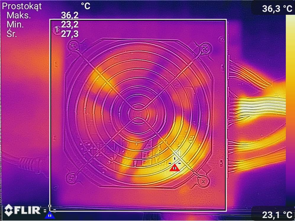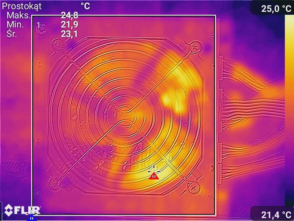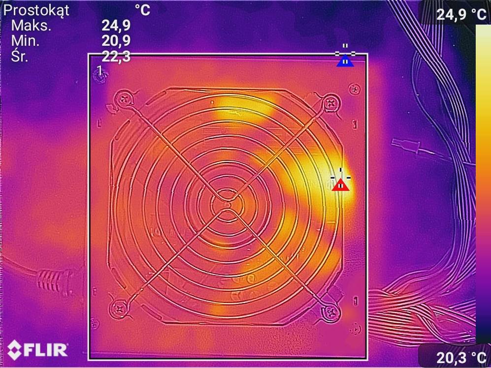 Spoczynkiem było wyświetlanie tylko pulpitu. Obciążenie to FurMark oraz Cinebench 2024. Zdjęcia termowizyjne wykonałem dzięki smartfonowi CAT S61.