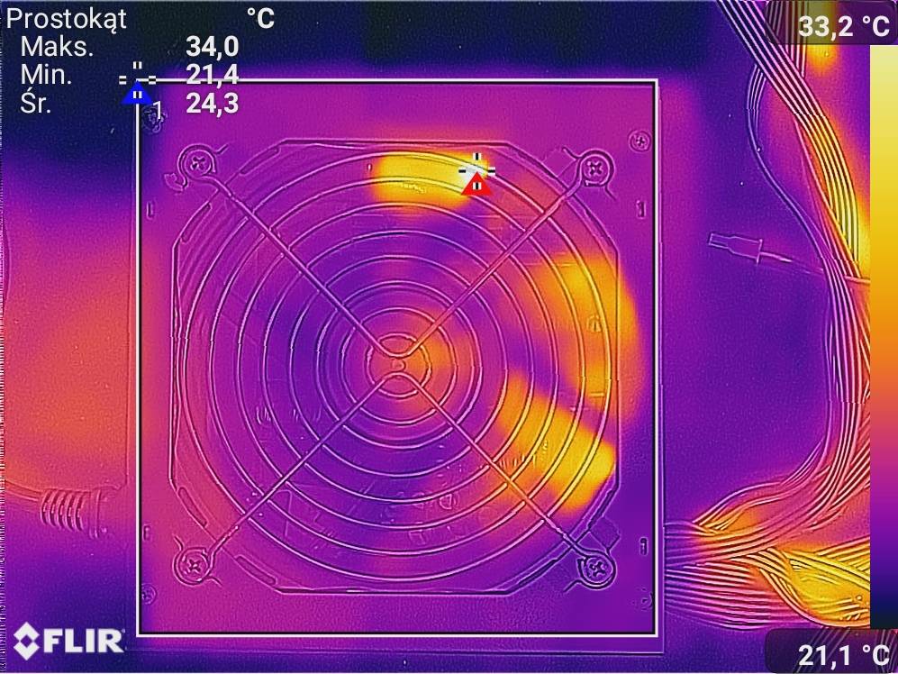 Zastosowany wentylator to Fluctus 10-1037 o maksymalnej prędkości równej 1400 RPM i z łożyskiem FDB. Tym razem Endorfy udostępnia krzywą w zależności od obrotów i widać, że maksymalna głośność powinna wynosić trochę powyżej 31 dBA, a obroty nie powinny sięgnąć maksymalnych. Szkoda, że nie pracuje on półpasywnie, ale na przy niskich obciążeniach powinno być naprawdę cicho. Tym razem mamy też certyfikat Cybenetics A.